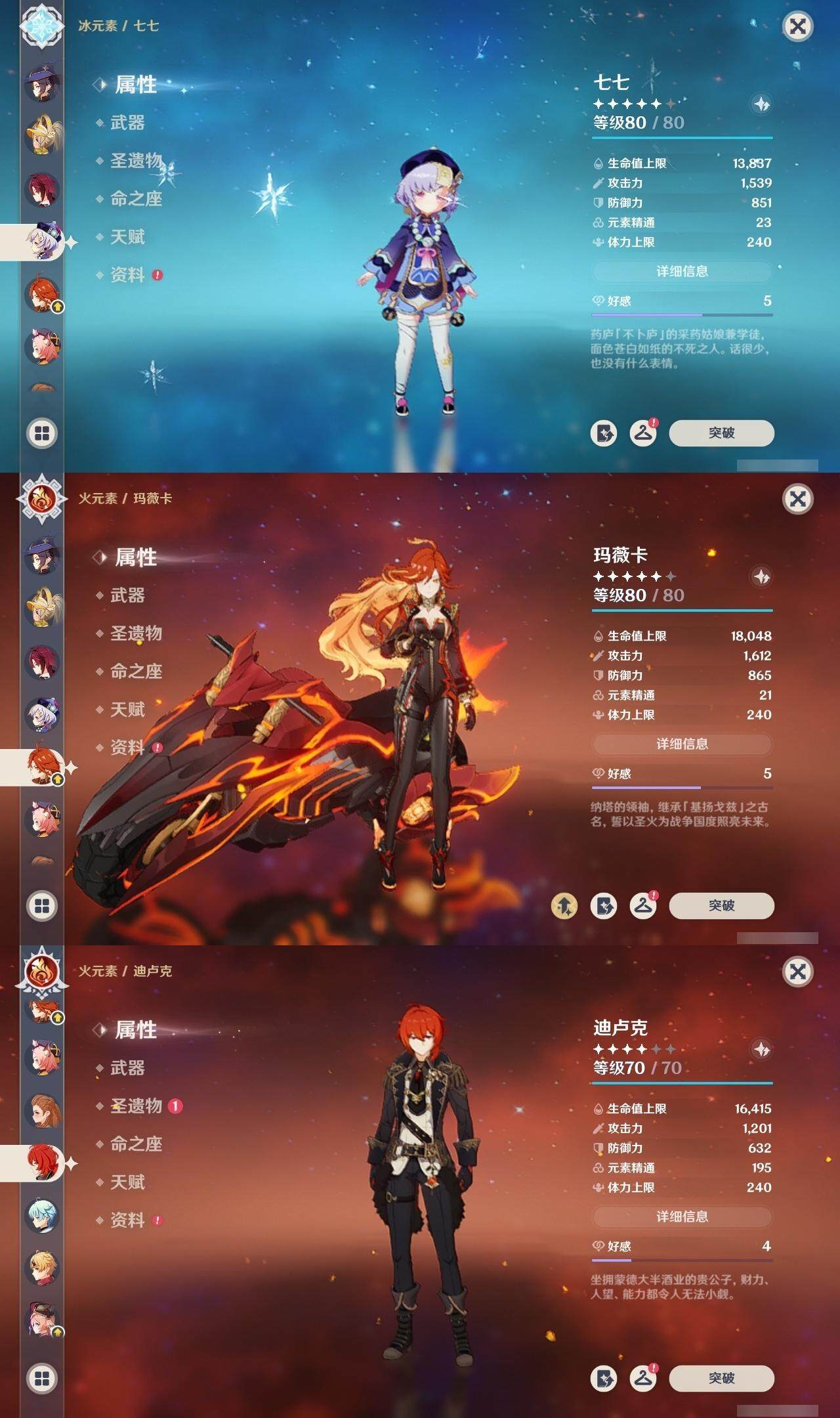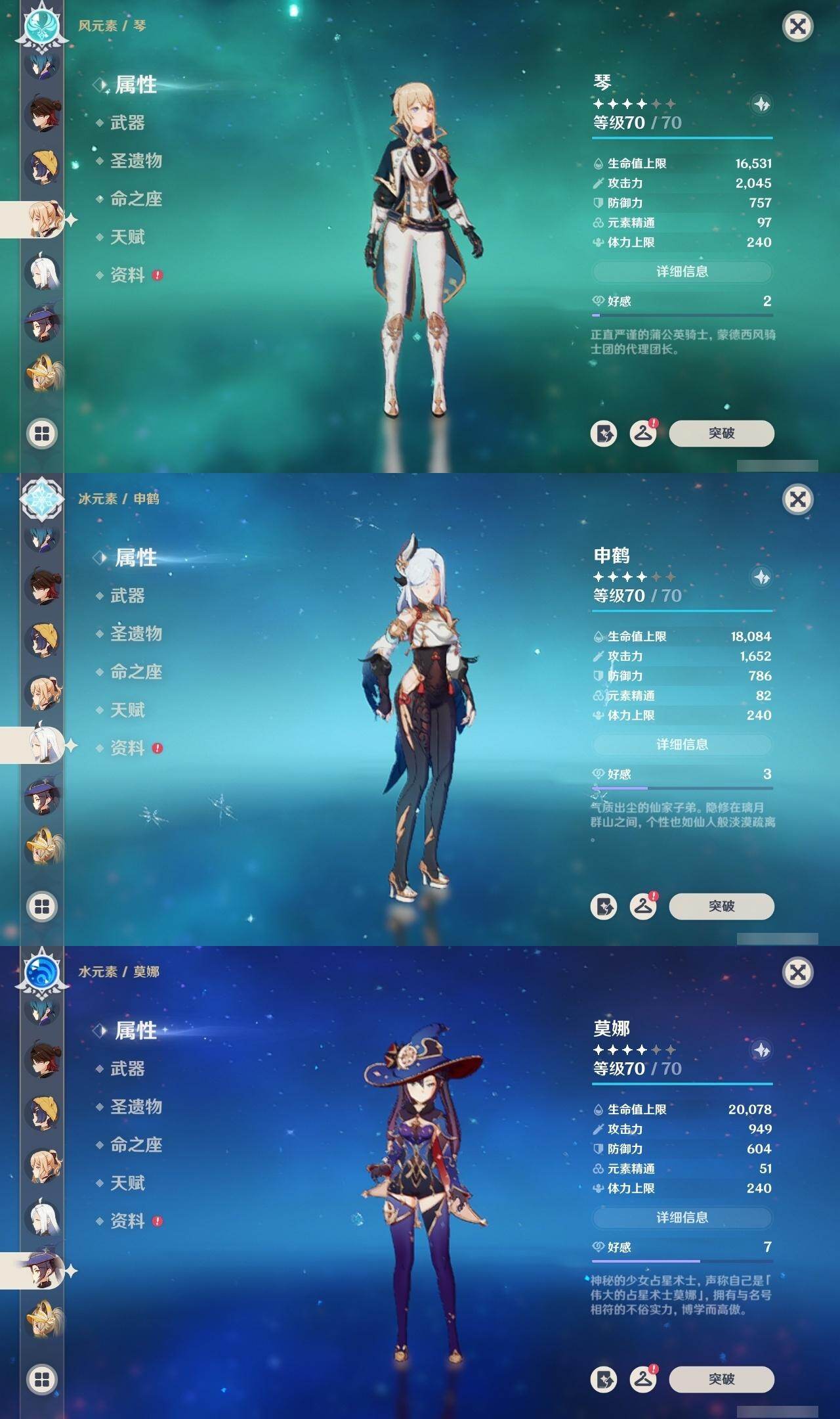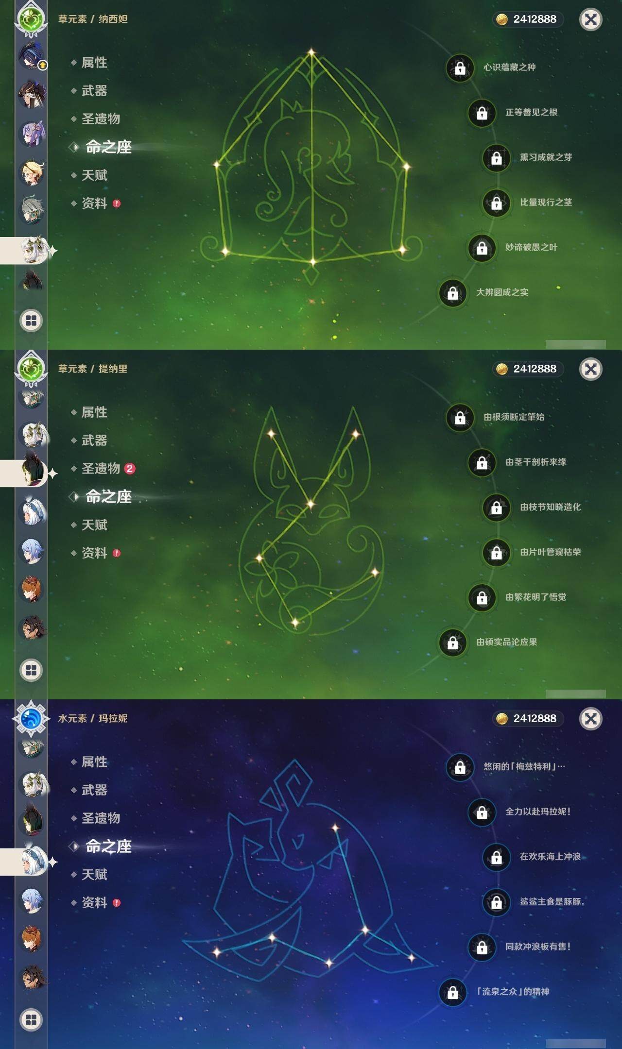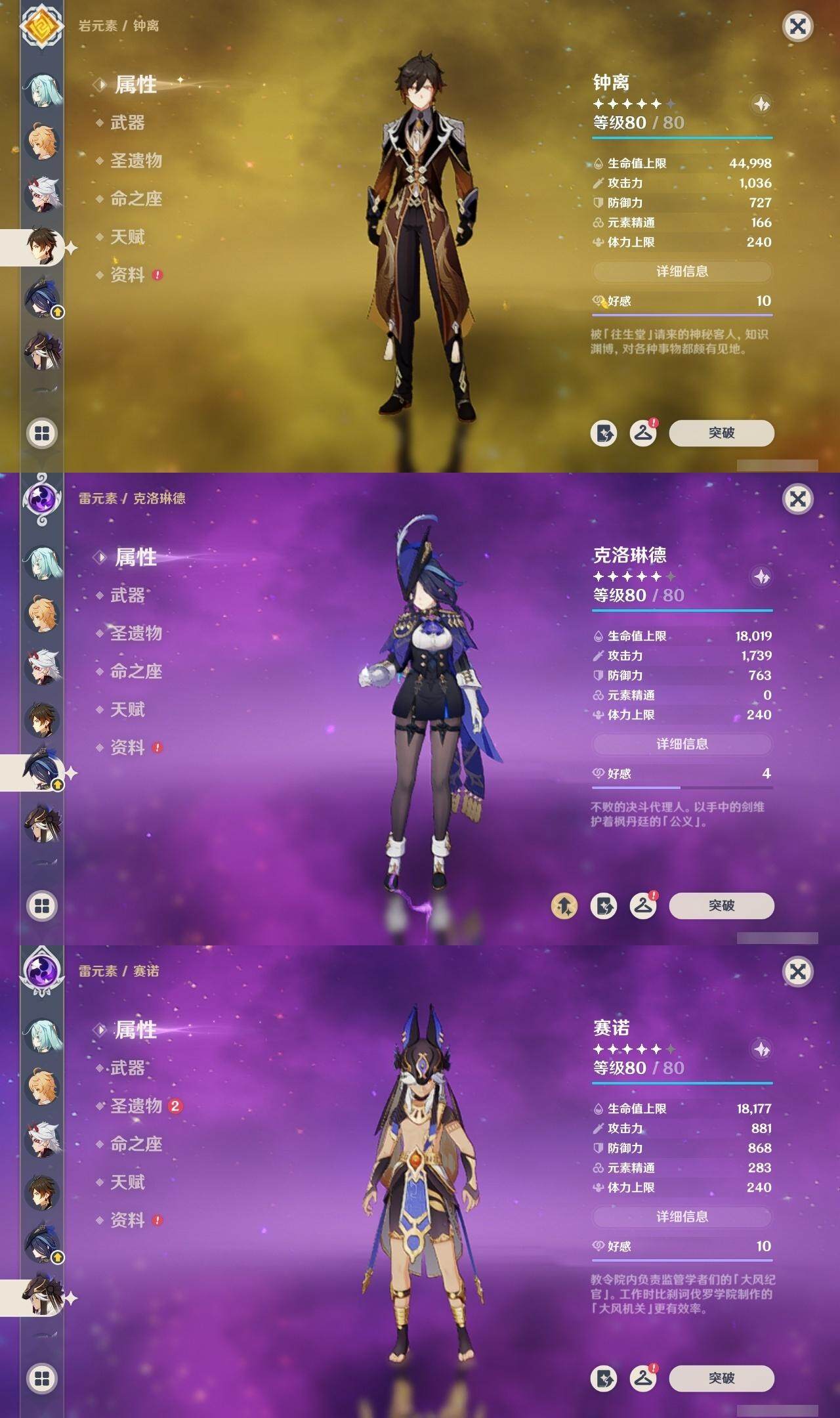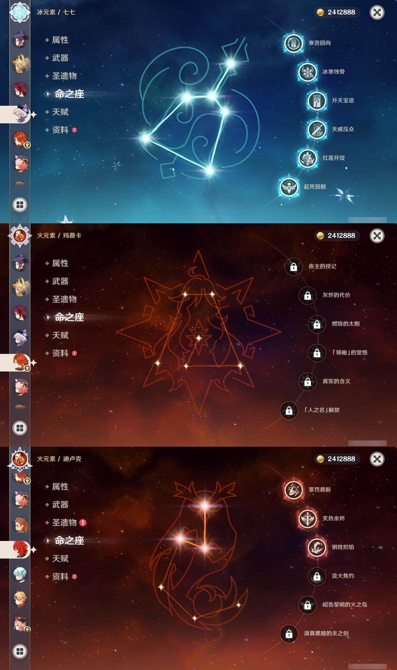 0命克洛琳德,1命阿蕾奇诺,2命闲云,0命那维莱特,1命迪希雅,0命艾尔海森,1命流浪者,0命纳西妲,0命赛诺,0命提纳里,0命夜兰,0命神里绫人,0命申鹤,0命荒泷一斗,0命雷电将军,0命枫原万叶,0命钟离,0命魈,0命达达利亚,0命刻晴,满命七七,2命琴,2命莫娜,3命迪卢克,0命玛拉妮,0命艾梅莉埃,0命玛薇卡,0命梦见月瑞希,精1天空之翼,精1天空之刃