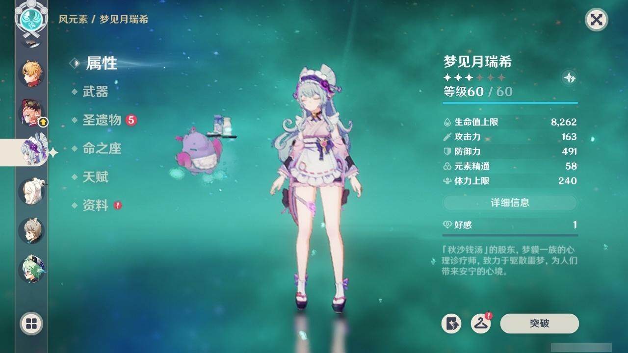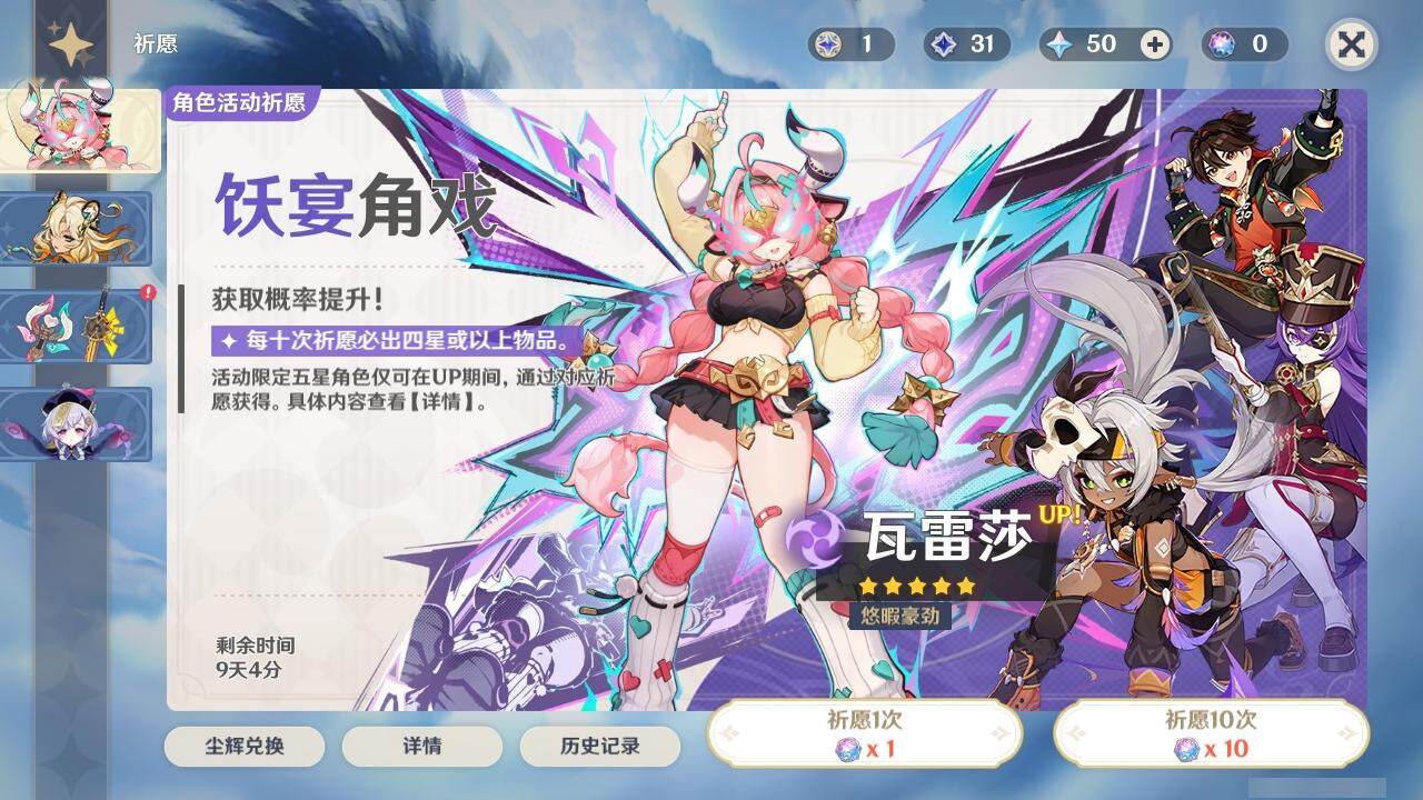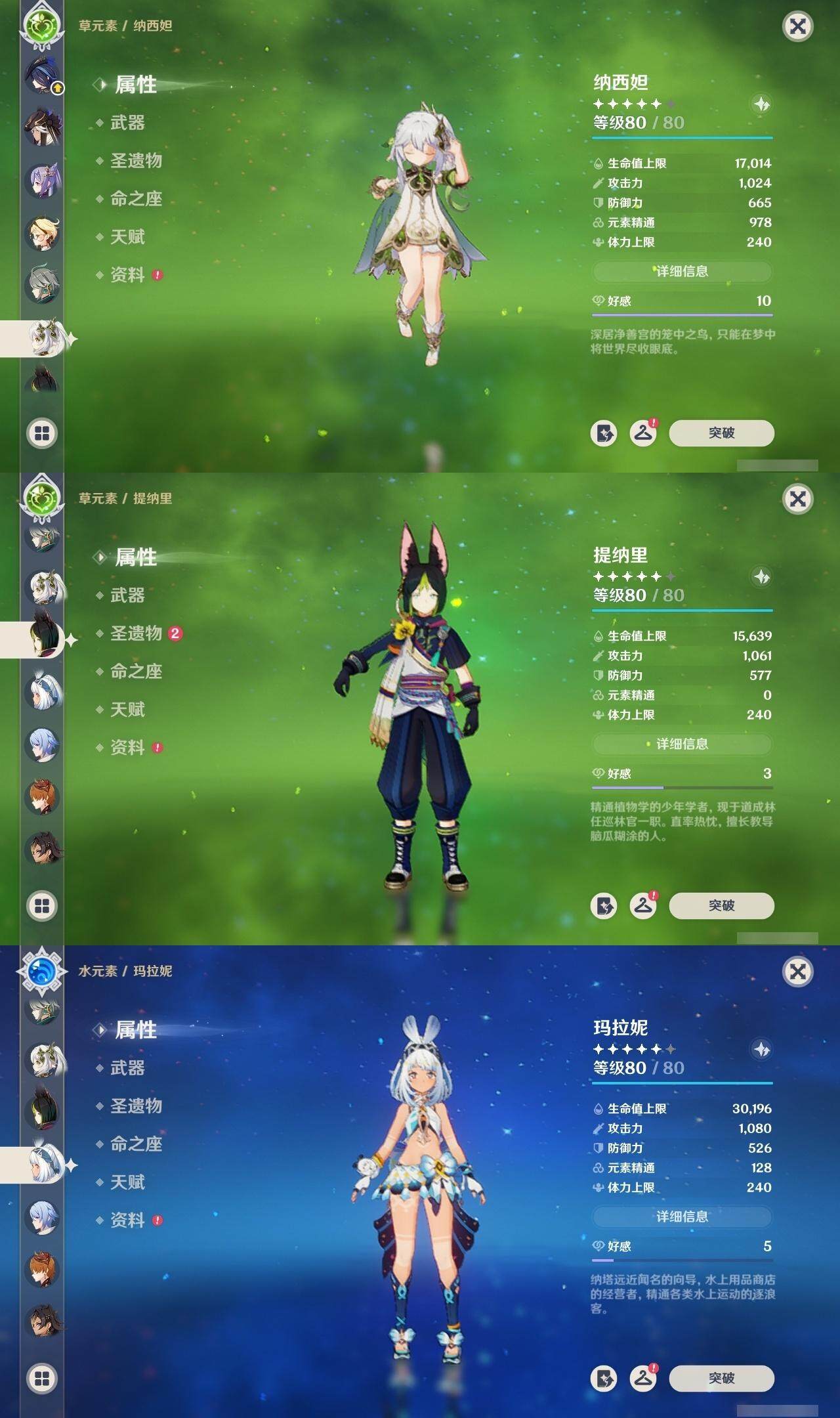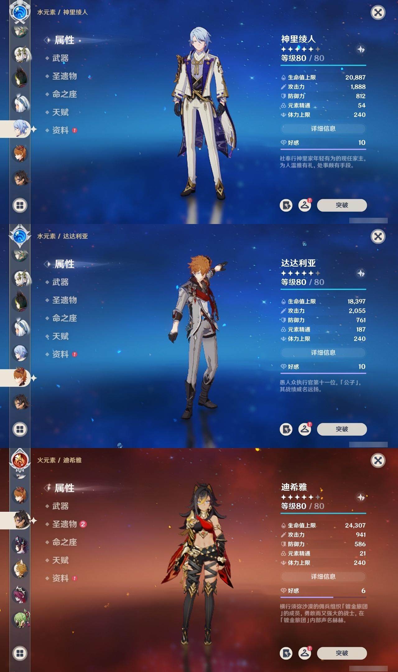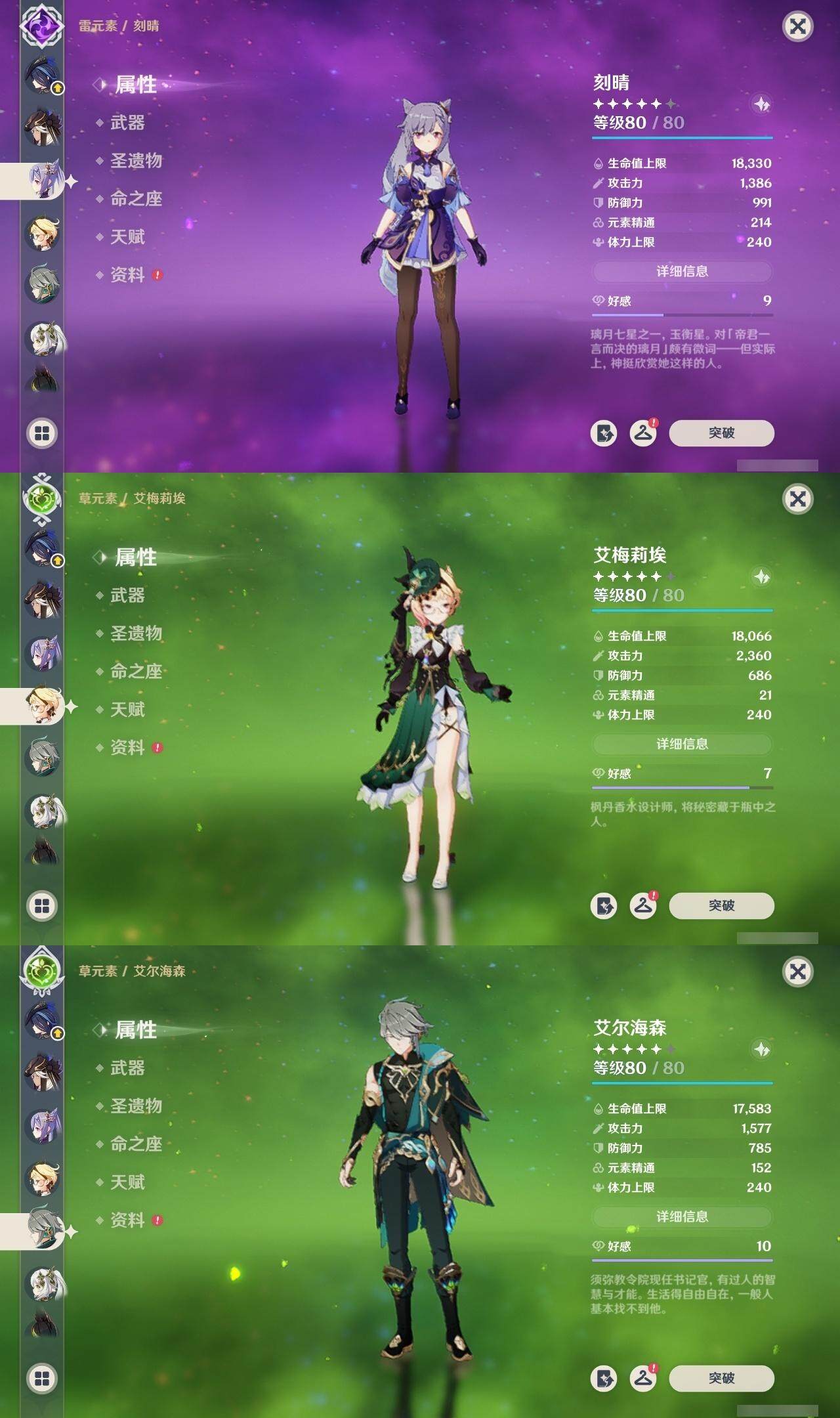 0命克洛琳德,1命阿蕾奇诺,2命闲云,0命那维莱特,1命迪希雅,0命艾尔海森,1命流浪者,0命纳西妲,0命赛诺,0命提纳里,0命夜兰,0命神里绫人,0命申鹤,0命荒泷一斗,0命雷电将军,0命枫原万叶,0命钟离,0命魈,0命达达利亚,0命刻晴,满命七七,2命琴,2命莫娜,3命迪卢克,0命玛拉妮,0命艾梅莉埃,0命玛薇卡,0命梦见月瑞希,精1天空之翼,精1天空之刃