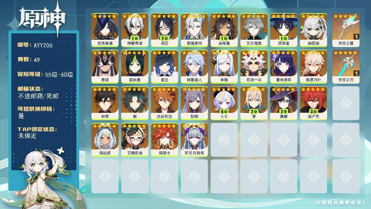 [15325570]60级/49黄/男主/28个五星角色/3个五星武器 0命克洛琳德,1命阿蕾奇诺,2命闲云,0命那维莱特,1命迪希雅,0命艾尔海森,1命流浪者,0命纳西妲,0命赛诺,0命提纳里,0命夜兰,0命神里绫人,0命申鹤,0命荒泷一斗,0命雷电将军,0命枫原万叶,0命钟离,0命魈,0命达达利亚,0命刻晴,满命七七,2命琴,2命莫娜,3命迪卢克,0命玛拉妮,0命艾梅莉埃,0命玛薇卡,0命梦见月瑞希,精1天空之翼,精1天空之刃
