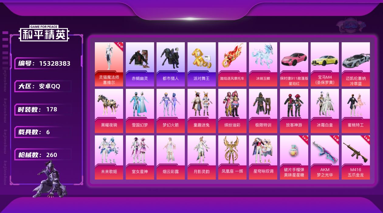 [15328383]【店主推荐捡漏号!可直接换绑】安卓 手Q-无敌战神框-1神装-14粉装-15特效枪-6载具-7粉色飞行器-94673热力值-15王牌印记-178套装-260枪皮【红色神装等级】:灵猫魔法师-塞维尔(二级)【红色角色神装】:灵猫魔法师-塞维尔【热门品类】:粉装-雪国幻梦,粉装-梦幻火箭,粉装-童趣迷兔,粉装-缤纷油彩,套装-浪漫天命,套装-赤蝎幽灵,套装-都市猎人,套装-派对舞王,角色-忠义严颜,套装-龟仙人,套装-粉红小猪,套装-红红火火,熔岩游骑兵面罩,熔岩游骑兵连帽夹克【粉色载具】:宝马M4(圣保罗黄),迈凯伦塞纳(冷萃蓝),保时捷911 敞篷版(星珀红),踏焰逐风摩托车,僚机-冰龙团团,黑曜夜骑,冰绡玉鳞【粉色套装】:粉装-极限特训,粉装-雪国幻梦,粉装-梦幻火箭,粉装-缤纷油彩,粉装-放客神游,粉装-冰霜白皇,粉装-童趣迷兔,粉装-蜜桃特工,粉装-未来歌姬,粉装-室女星神,角色-烟云彩露,角色-月影灵韵,角色-凤凰座 一辉,粉装-星穹咏叹调【粉色枪皮等级】:AKM-梦之光华(六级),M416-五爪金龙(六级),M416-灵猫魔法师(六级),GROZA-镜光银凌(五级),AUG-暖羊咩咩(五级),M762-鬼刀(四级),汤姆逊-热量炸弹(五级),Kar98K-巳巳如意(五级),Mk14-甜梦熊击(五级),AMR-智耀战神(五级),DP-28-豹影疾电(五级),MG-36-幻彩电音(五级),MG-36-沧焰双生(五级),烟雾弹-电雾迷城(五级),破片手榴弹-美味星星糖(七级)【粉色枪皮】:AKM-梦之光华,M416-五爪金龙,M416-灵猫魔法师,GROZA-镜光银凌,AUG-暖羊咩咩,M762-鬼刀,汤姆逊-热量炸弹,Kar98K-巳巳如意,Mk14-甜梦熊击,AMR-智耀战神,DP-28-豹影疾电,MG-36-幻彩电音,MG-36-沧焰双生,烟雾弹-电雾迷城,破片手榴弹-美味星星【粉色飞行器】:拂晓神骑飞行器,镜域双华-灵镜之阶,冠军兔兔飞行器,灵猫魔法师飞行器,灵珠游龙飞行器