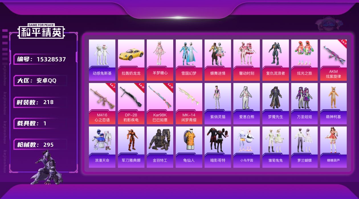 [15328537]【特价出售/店主推荐】 安卓 手Q-无敌战神框-6粉装-5特效枪-1载具-1粉色飞行器-89702热力值-28王牌印记-218套装-295枪皮【热门品类】:粉装-雪国幻梦,套装-浪漫天命,角色-军刀雅典娜,套装-金羽特工,套装-动感兔斯基人偶服,套装-SS1特训,套装-龟仙人,套装-暗影哥特【粉色套装】:粉装-雪国幻梦,粉装-蝶舞迷情,粉装-馨动时刻,角色-复仇流浪者,粉装-炫光之旅,角色-羊梦糖心【粉色枪皮等级】:AKM-炫紫旋律(七级),M416-心之恋语(七级),Kar98K-巳巳如意(五级),DP-28-豹影疾电(五级)【粉色载具】:拉轰奶龙龙【粉色枪皮】:AKM-炫紫旋律,M416-心之恋语,Kar98K-巳巳如意,Mk14-闲梦青缨,DP-28-豹影疾电【粉色飞行器】:天之羽翼飞行器