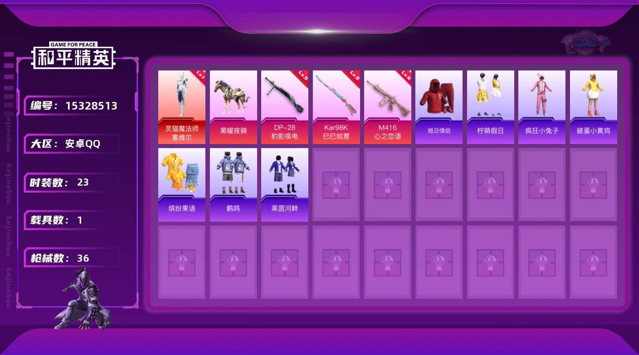 [15328513]【特价出售/店主推荐】安卓 手Q-1神装-0粉装-3特效枪-1载具-2粉色飞行器-12677热力值-4王牌印记-23套装-36枪皮【红色神装等级】:灵猫魔法师-塞维尔(一级)【红色角色神装】:灵猫魔法师-塞维尔【粉色枪皮等级】:M416-心之恋语(四级),Kar98K-巳巳如意(五级),DP-28-豹影疾电(五级)【粉色载具】:黑曜夜骑【粉色枪皮】:M416-心之恋语,Kar98K-巳巳如意,DP-28-豹影疾【粉色飞行器】:灵猫魔法师飞行器