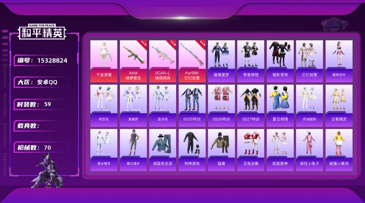 [15328824]【特价出售/店主推荐】安卓 手Q-1粉装-3特效枪-0载具-0粉色飞行器-21466热力值-5王牌印记-59套装-70枪皮
