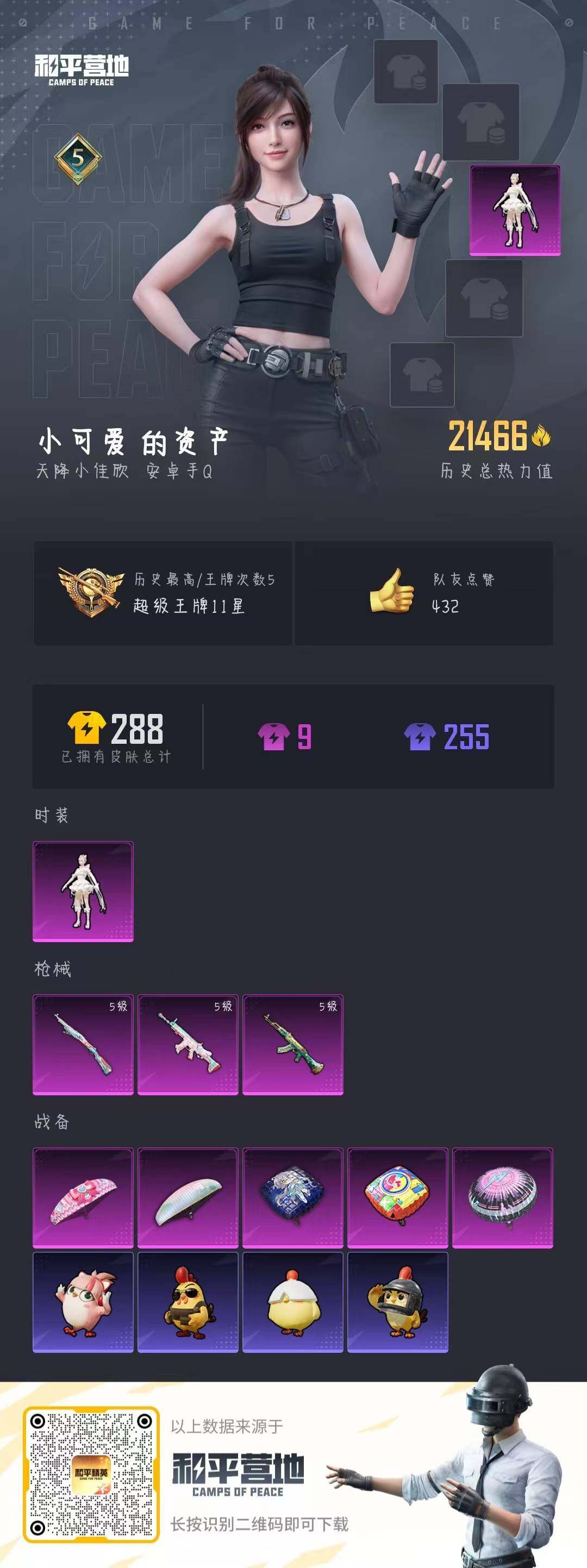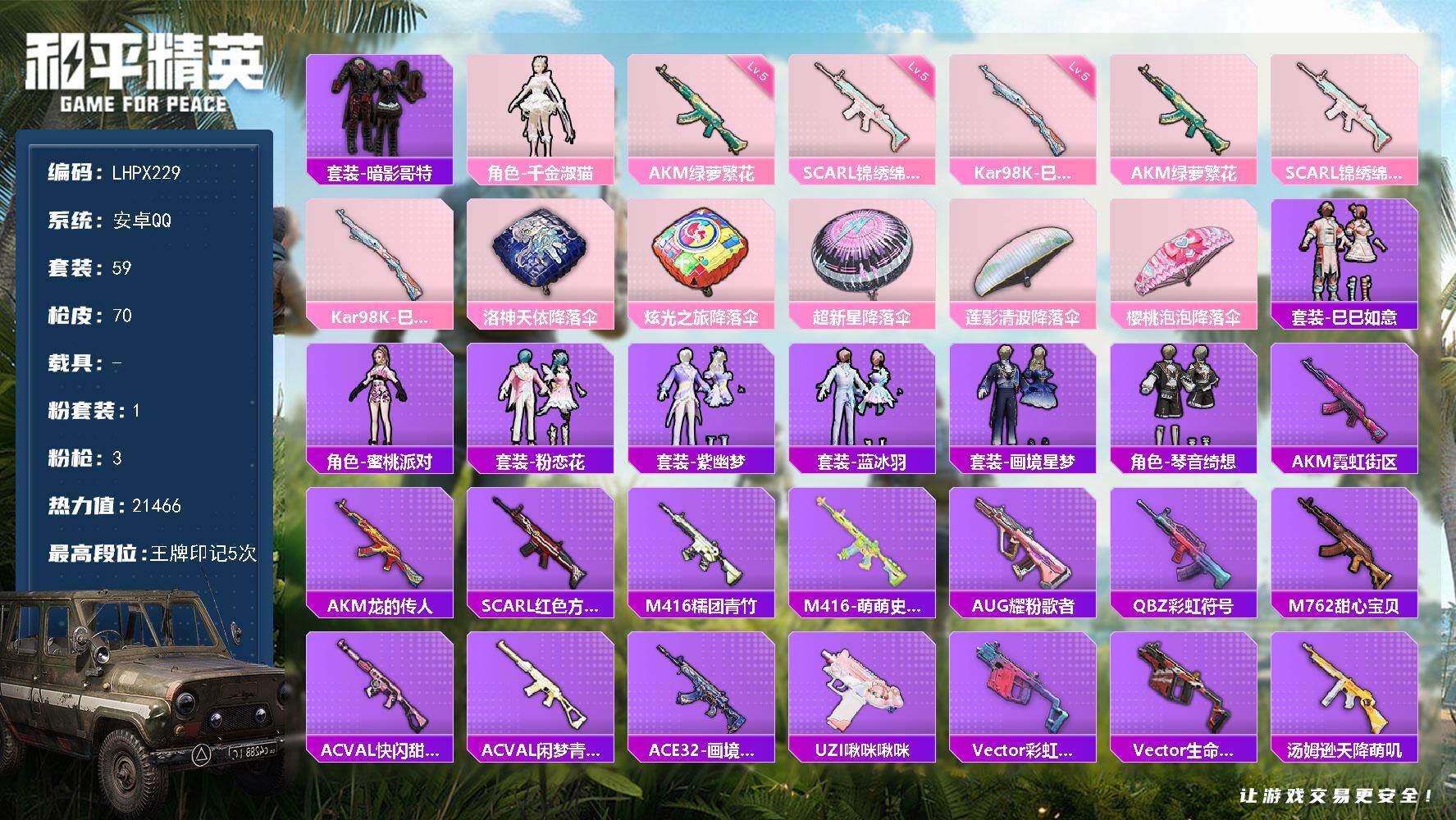 [15328824]【特价出售/店主推荐】安卓 手Q-1粉装-3特效枪-0载具-0粉色飞行器-21466热力值-5王牌印记-59套装-70枪皮 【热门品类】:套装-暗影哥特 【粉色套装】:角色-千金淑猫 【粉色枪皮等级】:AKM-绿萝繁花(五级),SCAR-L-锦绣绵绵(五级),Kar98K-巳巳如意(五级) 【粉色枪皮】:AKM-绿萝繁花,SCAR-L-锦绣绵绵,Kar98K-巳巳如意 【粉色降落伞】:洛神天依降落伞,炫光之旅降落伞,超新星降落伞,莲影清波降落伞,樱桃泡泡降落伞 【稀有套装】:套装-巳巳如意,套装-雪国风尚,角色-蜜桃派对,套装-粉恋花,套装-紫幽梦,套装-蓝冰羽,套装-画境星梦,套装-琴音绮想 【稀有枪皮】:AKM-霓虹街区,AKM-龙的传人,SCAR-L-红色方程式,M416-糯团青竹,M416-萌萌史莱姆,AUG-耀粉歌者,QBZ-彩虹符号,M762-甜心宝贝,AC-VAL-快闪甜心,AC-VAL-闲梦青缨,ACE32-画境星梦,UZI-啾咪啾咪,Vector-彩虹符号,Vector-生命誓言,汤姆逊-天降萌叽,汤姆逊-耀粉歌者,MP5K-画境星梦,P90-倾城蜜语,P90-快闪甜心,P90-巳巳如意,莫辛纳甘-蜜语绒猫,AMR-镜光幻境,M417-惊鸿侠骨,MK20-H-快闪甜心,M200-惊鸿侠骨,M1加兰德-画境星梦,S686-生命誓言,S686-巳巳如意,S686-千金淑猫,S12K-玩趣呆呆,S12K-智耀战神,DBS-彩虹符号,AA12-G-画境星梦,M249-彩虹符号,M249-莲影清波,DP-28-彩虹符号,MG3-幻世战舞者,MG3-惊鸿侠骨,P18C-镜光幻境,沙漠之鹰-快闪甜心,TMP-9-萌萌史莱姆,爆炸猎弓-惊鸿侠骨,爆炸猎弓-雪月幻音,平底锅-画境星梦,破片手榴弹-巳巳如意 【其他套装】:套装-SS25特训,套装-SS26特训,套装-SS27特训,套装-夏日倾情,套装-奶油庭院,套装-日冕精灵,套装-星谷精灵,套装-春日漫步,套装-暗影哥特,套装-湖蓝色名流,套装-特殊使命,套装-猛禽,套装-玉兔迎春,套装-甜星爱神,套装-疯狂小兔子,套装-破蛋小黄鸡,套装-空岛之星,套装-竞技名士,套装-纯白舞曲,套装-缤纷果语,套装-耀粉歌者,套装-诗意画廊,套装-银月精灵,套装-长空猛禽,套装-霓虹街区,套装-青涩时光,套装-魅力单车,套装-