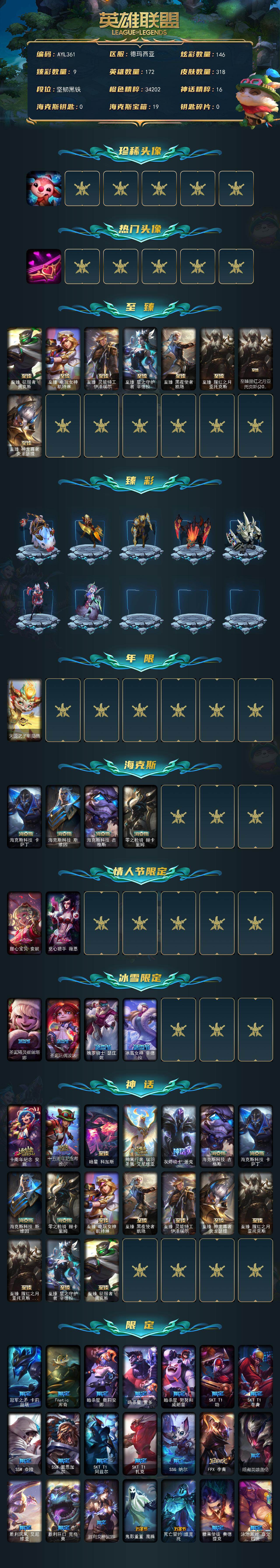 - [15373013]黄金段位-172英雄-122皮肤-43炫彩-0终极-2神话-20限定-15传说-27史诗 【臻彩皮肤】:无畏骑士瑟庄妮赤子初心,幻灵战斗猫金克丝梦幻强袭,西部天使赛娜贝利尔之怠,山海绘卷科加斯朱红,灵魂莲华亚索霜见之时,魔女阿卡丽虚荣 【年限皮肤】:点心宝贝阿木木 【冰雪限定】:魄罗骑士瑟庄妮,北极星使者萨科 【神话皮肤】:十周年纪念安妮,源代码乐芙兰 【限定皮肤】:冠军典狱长锤石,暗杀星蒙多,SKTT1娜美,SKTT1扎克,暗裔英雄盖伦,胜利之剑亚托克斯,胜利女神瑟庄妮,胜利之王泰达米尔,胜利巨口克格莫,胜利女神娑娜,胜利剑圣易,胜利之运崔斯特,胜利女神菲奥娜,暗影沃里克,野兽猎人德莱文,制胜金靴李青,防暴机器人布里茨 【传说皮肤】:大天使长米迦勒凯尔,源计划林易,约德尔国队长提莫,驯龙炮手崔丝塔娜,女皇艾希,绅士科加斯,最终BOSS维迦,神拳李青,光明哨兵薇恩,驯龙学者黑默丁格,灌篮高手德莱厄斯,星之守护者卡莎,黑夜使者亚索,神龙尊者夜月幻龙亚索,星之守护者金克丝 【史诗皮肤】:法国皇室厄运小姐,百夫长贾克斯,黑色荆棘莫甘娜,死神卡尔萨斯,武动巅峰萨科,寒冰女皇迦娜,血石诅咒塔里克,穿着正装的恶魔维迦,海贼魅影卡特琳娜,蓝焰梦魔魔腾,三昧真火孙悟空,V字仇杀者布兰德,冰晶之核布兰德,深海妖姬卡西奥佩娅,四神之力乌迪尔,刺客信条锐雯,夜鸦菲奥娜,驯龙女巫璐璐,生化骑士德莱厄斯,血羽凤凰奎因,野火之藤婕拉,西部牛仔亚索,源计划风亚索,腥红之月亚索,腥红之月烬,冲击之刃劫,暮星之羽霞 【王者皮肤】:霹雳游侠弗拉基米尔 【其他皮肤1】:五杀摇滚III遗失的章节奥拉夫,深渊巨蟹厄加特,弗拉基米尔伯爵,波江星神弗拉基米尔,星之吞噬者费德提克,斗牛士阿利斯塔,美国大叔瑞兹,原野伐木工赛恩,奥德赛希维尔,小蜜蜂提莫,灵魂莲华提莫,荒野巨兽努努和威朗普,丛林侠盗艾希,机械污染辛吉德,冲浪高手辛吉德,探戈灵魂伊芙琳,首领图奇,战栗之毒蒙多,老兵普朗克,白魔法师维迦,灰胡子魔法师维迦,里尔击球手特朗德尔,魔域梦魇特朗德尔,净雪之月凯特琳,戴一个表布里茨,石破天惊墨菲特,黑色玫瑰假面舞会伊莉丝,末日余生布兰德,丛林猎豹奈德丽,美酒节特使古拉加斯,英仙座珀尔修斯潘森,龙骑士莫德凯撒,五杀摇滚贝斯手约里克,五杀摇滚III遗失的章节约里克,KDAALLOUT阿卡丽,魔女阿卡丽,红色彗星凯南