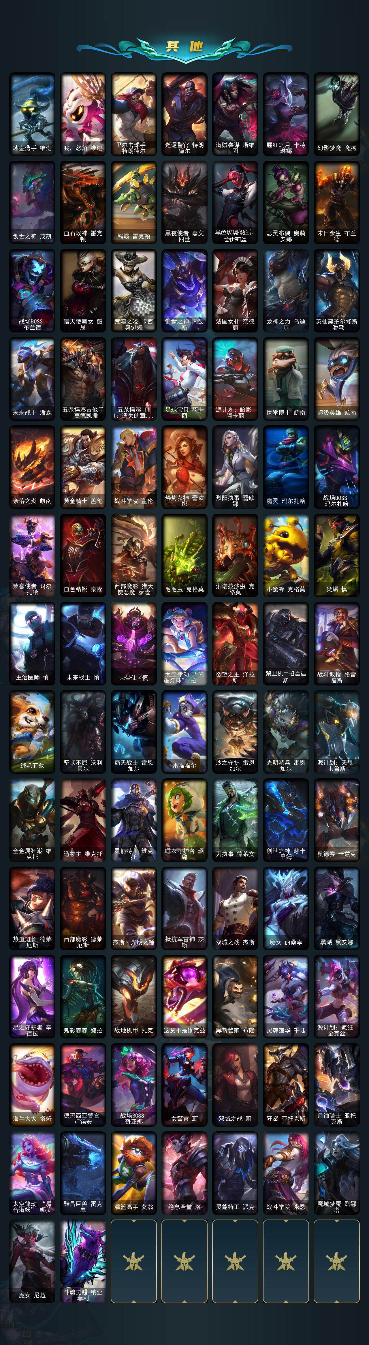 【限定皮肤】:冠军之矛卡莉丝塔,Fnatic库奇,暗杀星奥莉安娜,暗杀星蒙多,暗杀星努努和威朗普,SKTT1劫,SKTT1李青,SSW泰隆,SSW雷恩加尔,SKTT1阿兹尔,SKTT1扎克,SSG纳尔,FPX李青,暗裔英雄盖伦,胜利凤凰艾尼维亚,胜利巨口克格莫,胜利女神娑娜,鬼影重重魔腾,死亡誓约维克托,糖果使徒费德提克,泳池派对嘉文四世,泳池派对塔里克,密林猎手提莫,暗影沃里克,奥德赛吉格斯,都铎王朝图奇,征服者贾克斯,征服者卡尔玛,海之歌奈德丽,惊悚派对阿木木