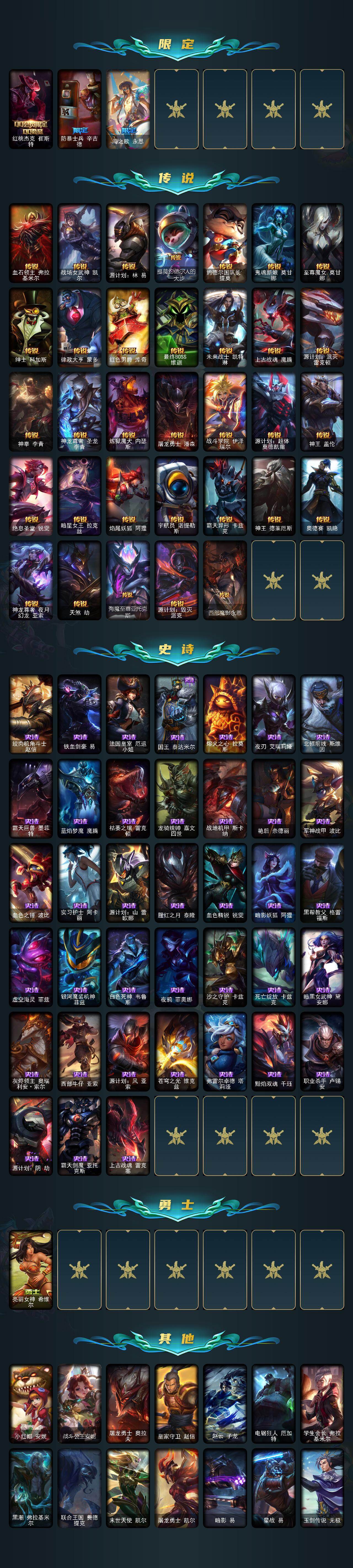 【传说皮肤】:血石领主弗拉基米尔,战场女武神凯尔,源计划林易,提莫约德尔人的一大步,约德尔国队长提莫,鬼魂新娘莫甘娜,至尊魔女莫甘娜,绅士科加斯,律政大亨蒙多,红色男爵库奇,最终BOSS维迦,未来战士凯特琳,上古战魂魔腾,源计划泯灭雷克顿,神拳李青,神龙尊者圣龙李青,炼狱魔犬内瑟斯,屠龙勇士潘森,战斗学院伊泽瑞尔,源计划超体莫德凯撒,神王盖伦,绝息圣堂锐雯,暗星女王拉克丝,焰尾妖狐阿狸,宇航员诺提勒斯,霸天异形卡兹克,神王德莱厄斯,奥德赛凯隐,神龙尊者夜月幻龙亚索,天煞劫,海魔至尊亚托克斯,源计划毁灭派克,西部魔影永恩