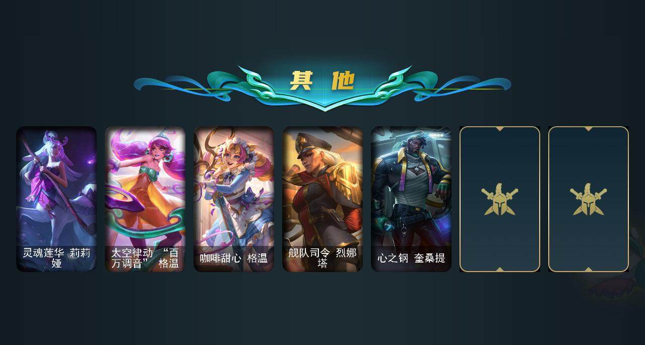 【限定皮肤】:Fnatic卡尔萨斯,暗杀星蒙多,SKTT1贾克斯,SKTT1劫,SKTT1卡莉丝塔,SKTT1辛德拉,iG菲奥娜,DWG奈德丽,EDG佛耶戈,DRX亚托克斯,女帝厄运小姐,暗裔英雄盖伦,胜利之王泰达米尔,胜利巨口克格莫,胜利女神娑娜,胜利剑圣易,鬼影重重魔腾,魅惑女巫悠米,泳池派对菲奥娜,野兽猎人瑟庄妮,都铎王朝图奇,红桃杰克崔斯特,防暴士兵辛吉德,海之歌永恩