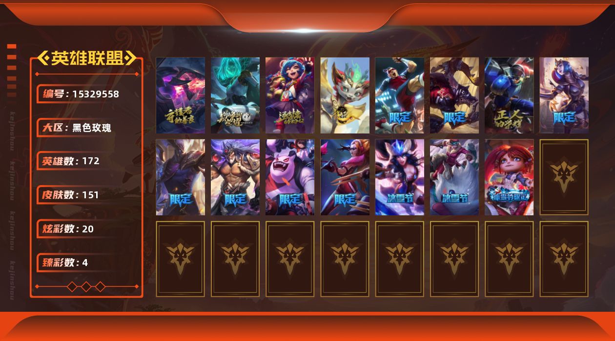 [15329558]【店主推荐捡漏号】铂金段位-172英雄-151皮肤-20炫彩-0终极-3神话-14限定-18传说-37史诗