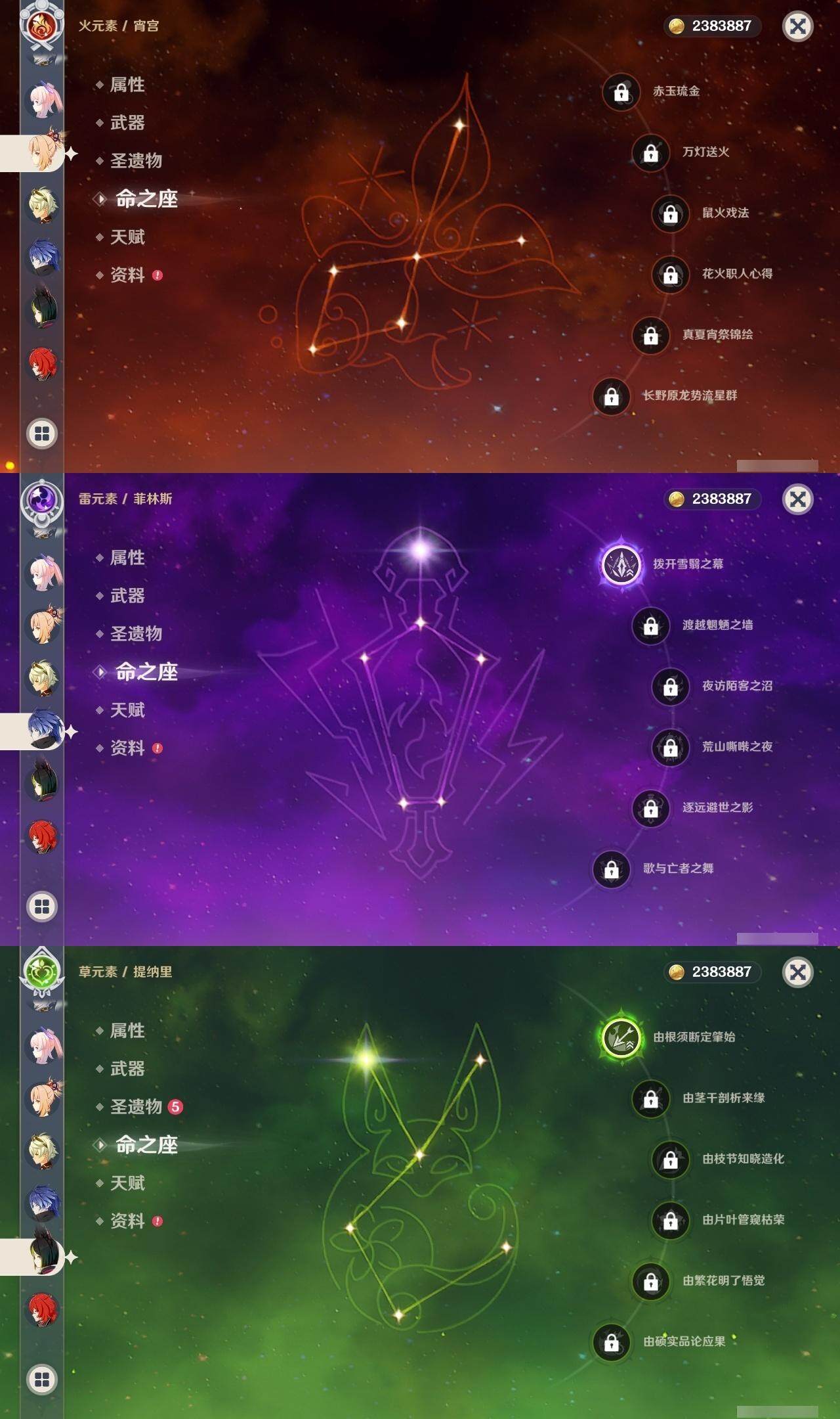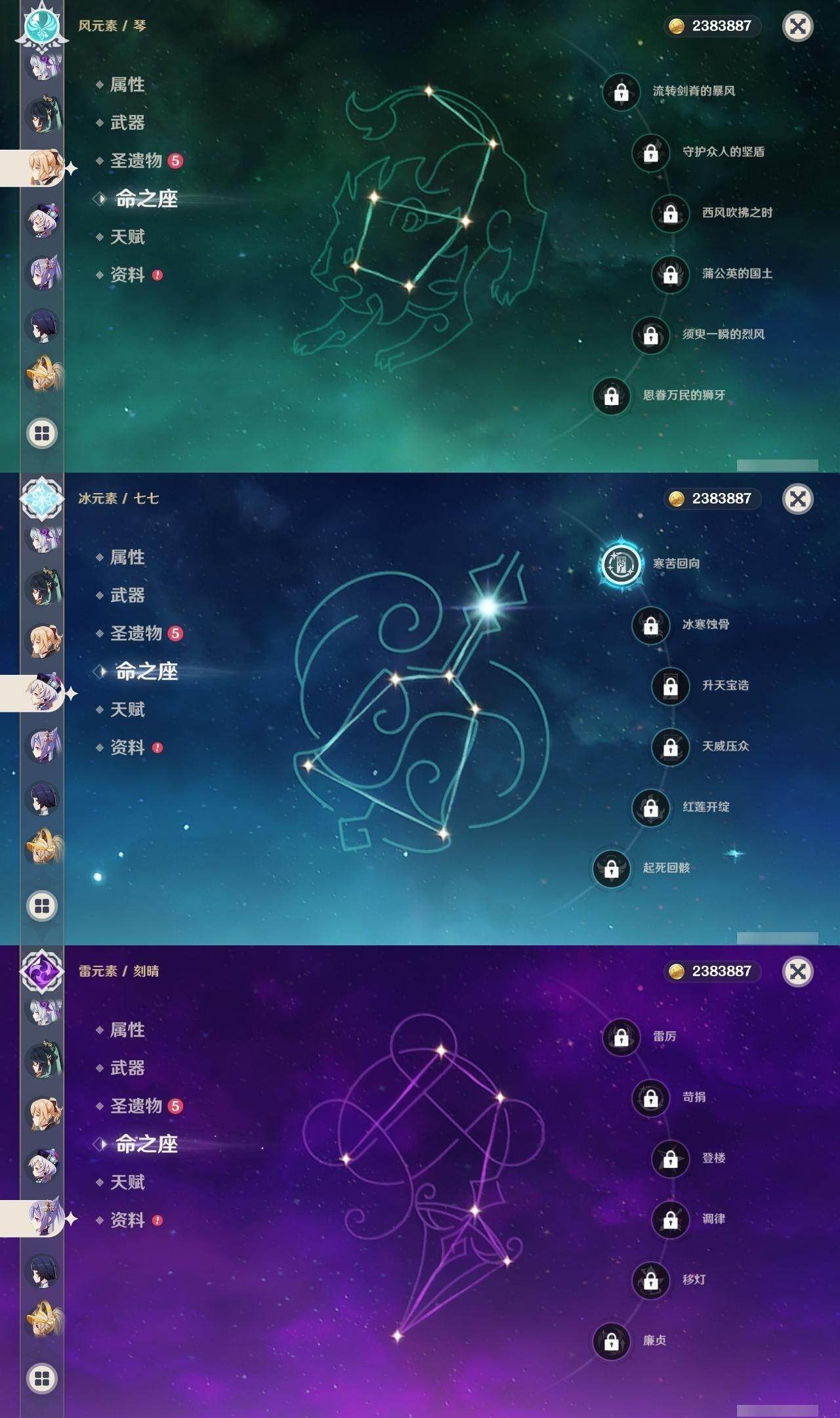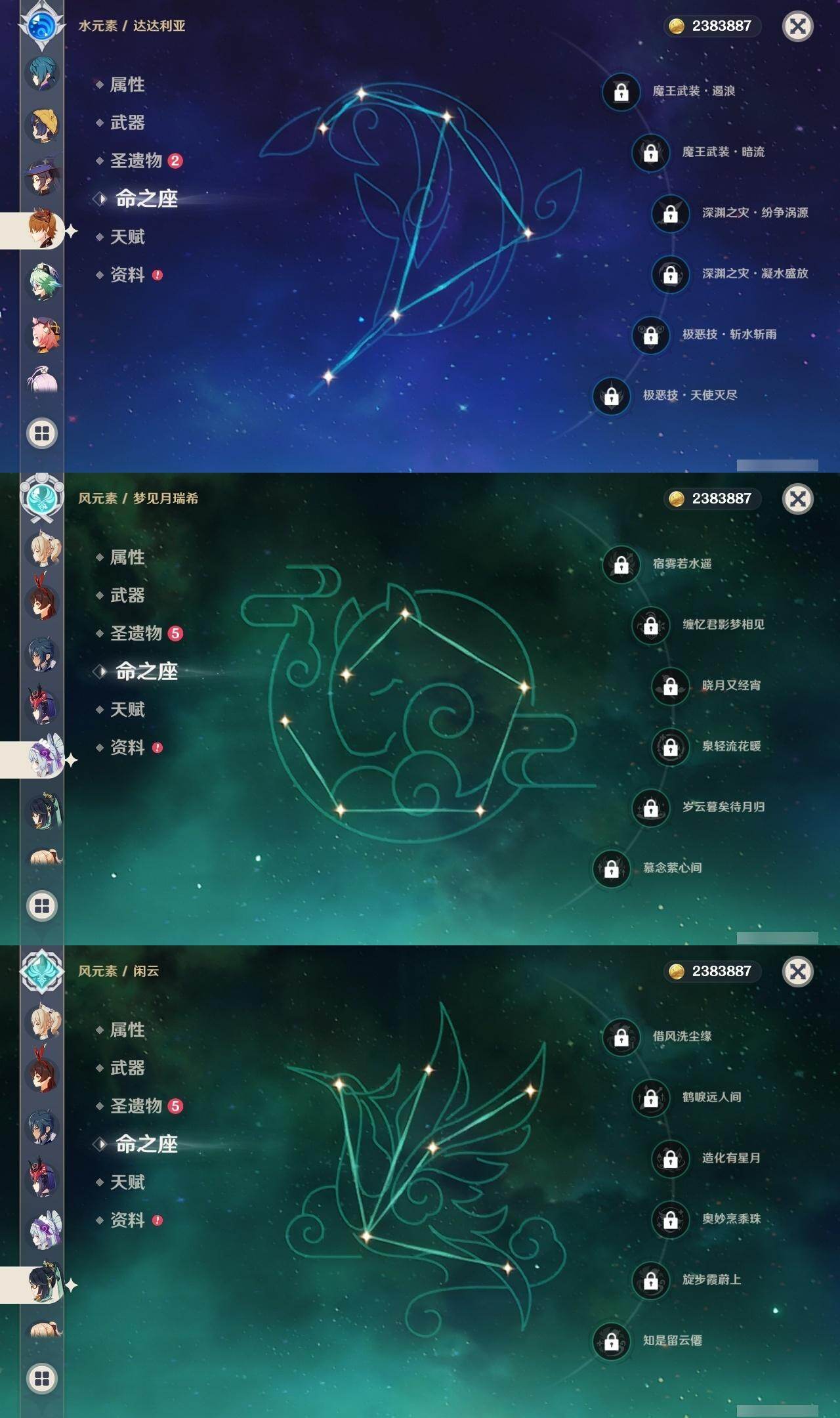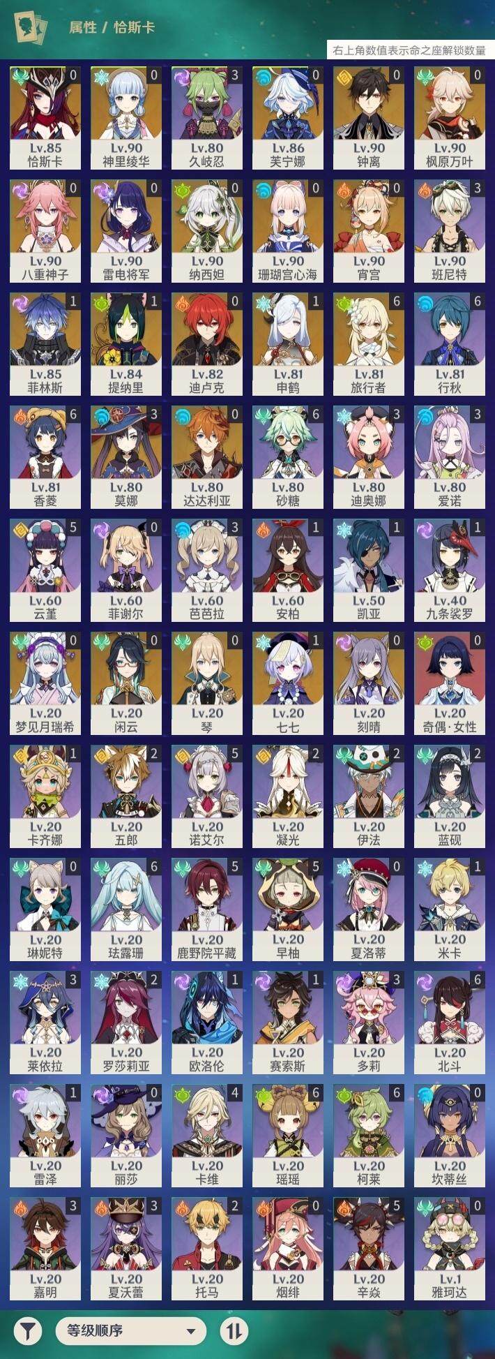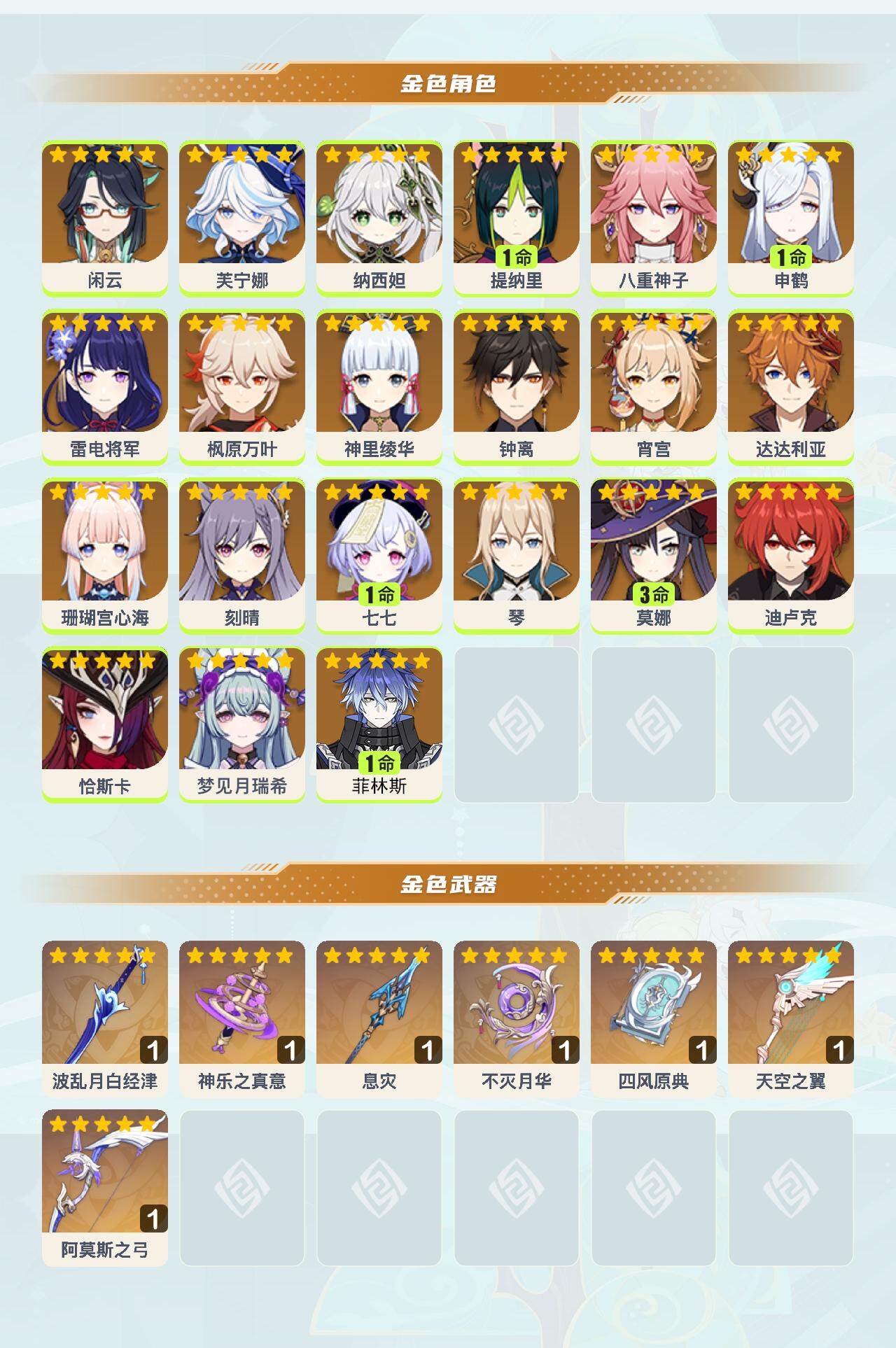 0命闲云,0命芙宁娜,0命纳西妲,1命提纳里,0命八重神子,1命申鹤,0命雷电将军,0命枫原万叶,0命神里绫华,0命钟离,0命宵宫,0命达达利亚,0命珊瑚宫心海,0命刻晴,1命七七,0命琴,3命莫娜,0命迪卢克,0命恰斯卡,0命梦见月瑞希,1命菲林斯,精1波乱月白经津,精1神乐之真意,精1息灾,精1不灭月华,精1四风原典,精1天空之翼,精1阿莫斯之弓