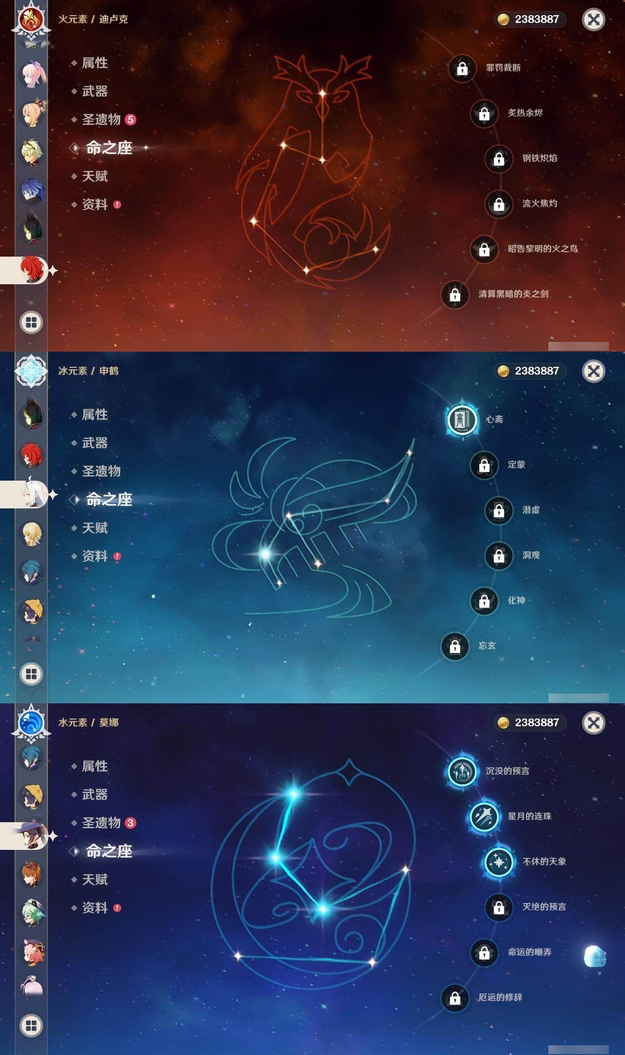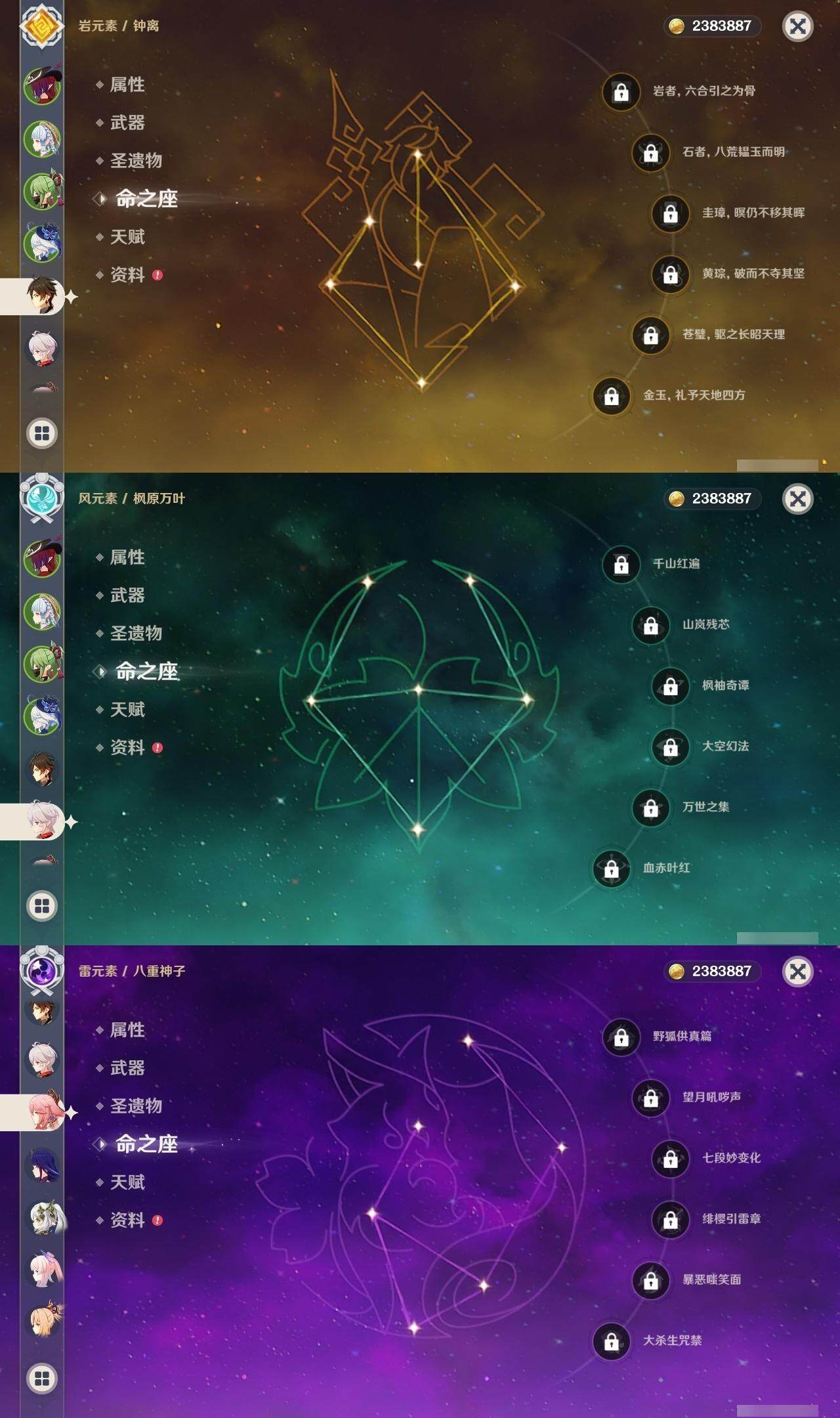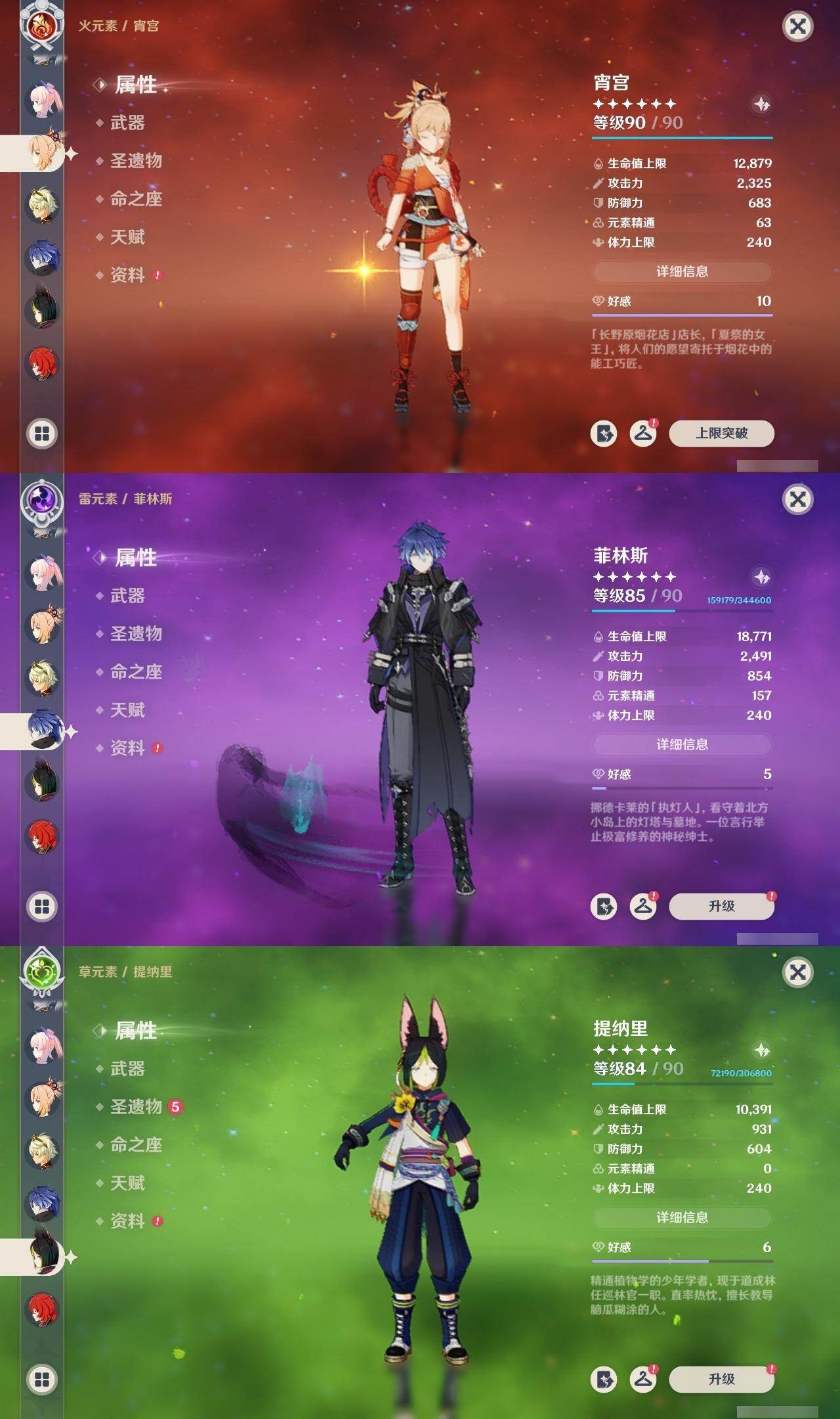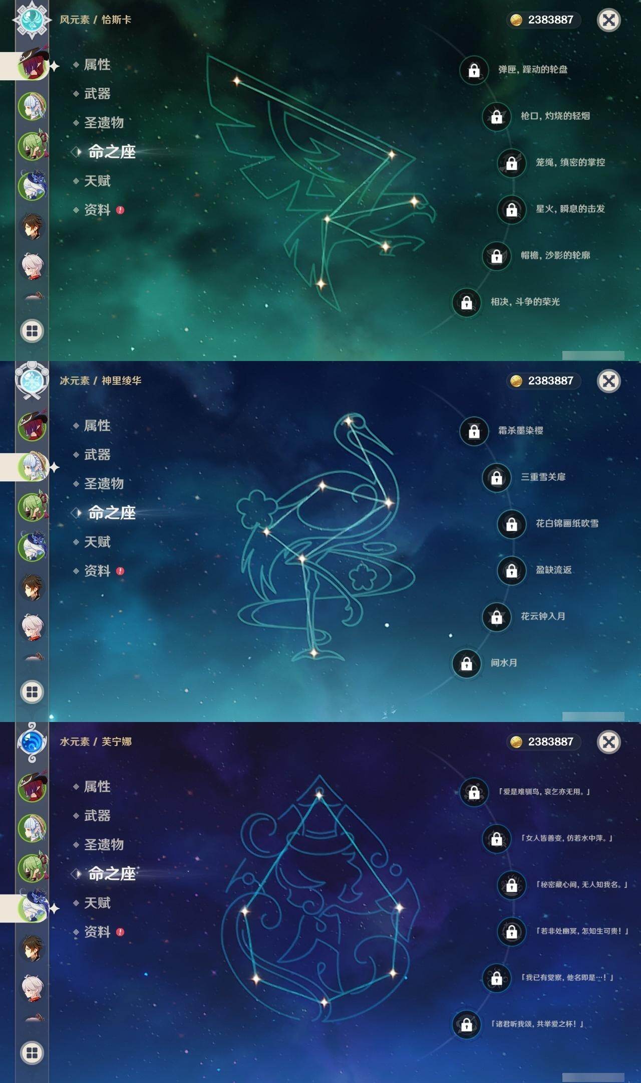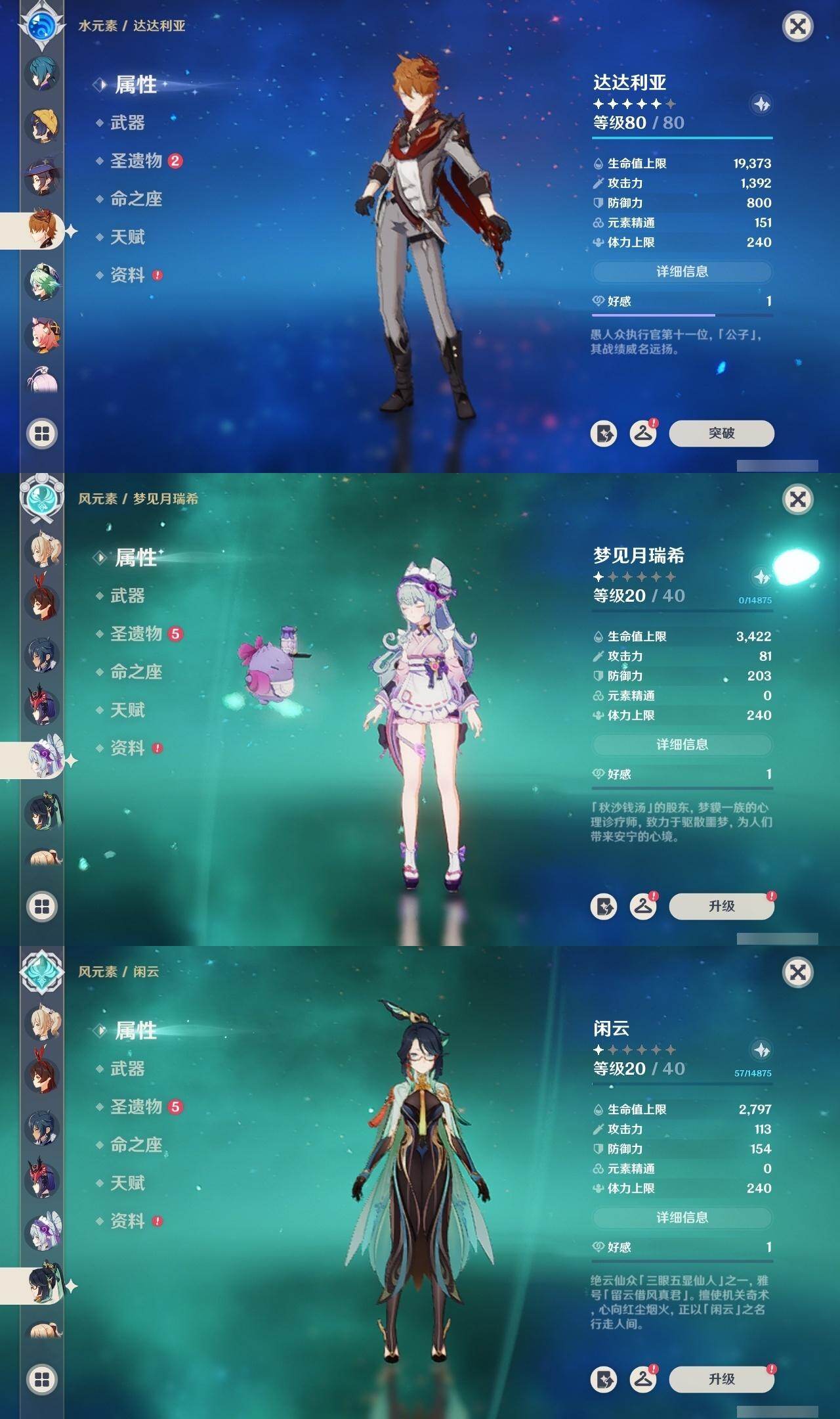 0命闲云,0命芙宁娜,0命纳西妲,1命提纳里,0命八重神子,1命申鹤,0命雷电将军,0命枫原万叶,0命神里绫华,0命钟离,0命宵宫,0命达达利亚,0命珊瑚宫心海,0命刻晴,1命七七,0命琴,3命莫娜,0命迪卢克,0命恰斯卡,0命梦见月瑞希,1命菲林斯,精1波乱月白经津,精1神乐之真意,精1息灾,精1不灭月华,精1四风原典,精1天空之翼,精1阿莫斯之弓
