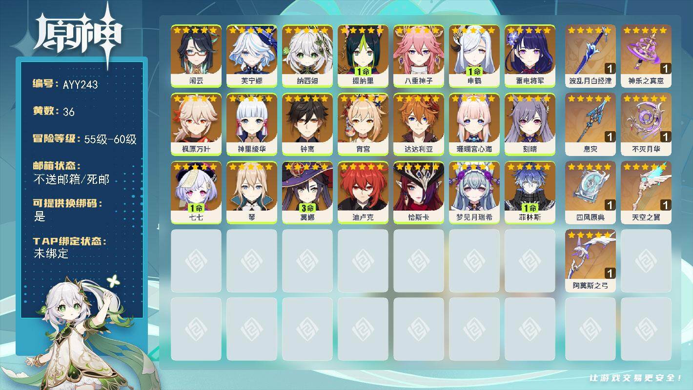 [15329580]58级/36黄/女主/21个五星角色/8个五星武器 0命闲云,0命芙宁娜,0命纳西妲,1命提纳里,0命八重神子,1命申鹤,0命雷电将军,0命枫原万叶,0命神里绫华,0命钟离,0命宵宫,0命达达利亚,0命珊瑚宫心海,0命刻晴,1命七七,0命琴,3命莫娜,0命迪卢克,0命恰斯卡,0命梦见月瑞希,1命菲林斯,精1波乱月白经津,精1神乐之真意,精1息灾,精1不灭月华,精1四风原典,精1天空之翼,精1阿莫斯之弓