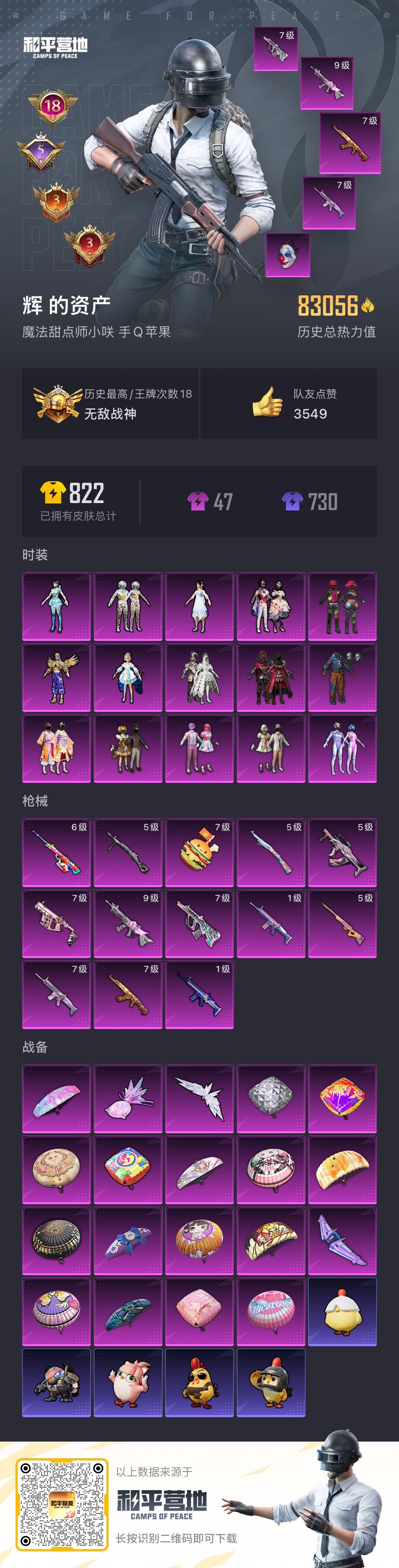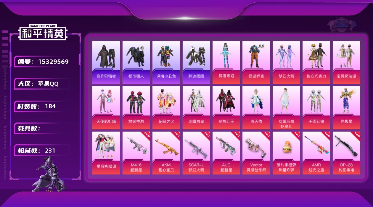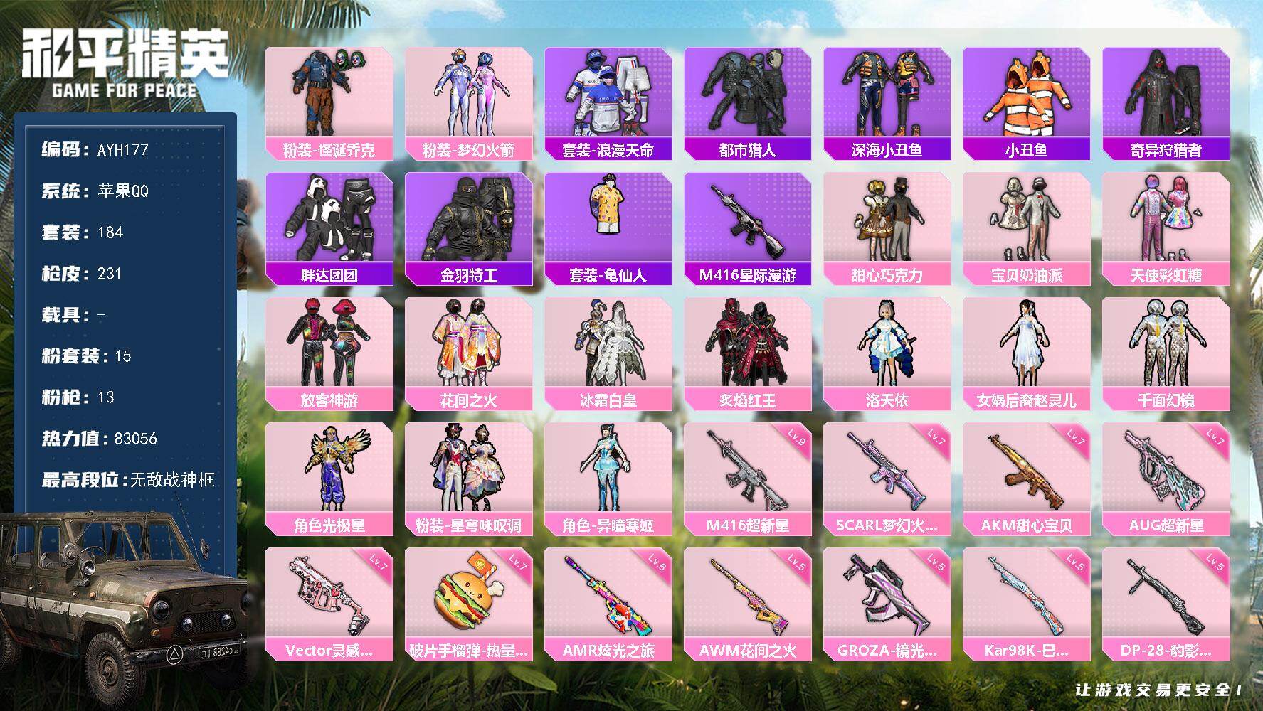 [15329569]【特价出售/店主推荐】苹果 手Q-无敌战神框-15粉装-13特效枪-0载具-3粉色飞行器-83056热力值-18王牌印记-184套装-231枪皮 热门品类】:粉装-怪诞乔克,粉装-梦幻火箭,套装-浪漫天命,套装-都市猎人,套装-深海小丑鱼,套装-小丑鱼,套装-奇异狩猎者,套装-胖达团团,套装-金羽特工,套装-龟仙人,M416-星际漫游套装】:粉装-怪诞乔克,粉装-甜心巧克力,粉装-宝贝奶油派,粉装-天使彩虹糖,粉装-梦幻火箭,粉装-放客神游,粉装-花间之火,粉装-冰霜白皇,粉装-炙焰红王,角色-洛天依,女娲后裔-赵灵儿,粉装-千面幻镜,角色-光极星,粉装-星穹咏叹调,角色-异瞳寒姬粉色枪皮等级】:AKM-甜心宝贝(七级),SCAR-L-梦幻火箭(七级),SCAR-L-童趣迷兔(一级),SCAR-L-青春物语(一级),M416-超新星(九级),GROZA-镜光银凌(五级),AUG-超新星(七级),Vector-灵感创作师(七级),Kar98K-巳巳如意(五级),AWM-花间之火(五级),AMR-炫光之旅(六级),DP-28-豹影疾电(五级),破片手榴弹-热量炸弹(七级)粉色枪皮】:AKM-甜心宝贝,SCAR-L-梦幻火箭,SCAR-L-童趣迷兔,SCAR-L-青春物语,M416-超新星,GROZA-镜光银凌,AUG-超新星,Vector-灵感创作师,Kar98K-巳巳如意,AWM-花间之火,AMR-炫光之旅,DP-28-豹影疾电,破片手榴弹-热量炸弹 粉色飞行器】:梦幻火箭飞行器,镜光幻境飞行翼