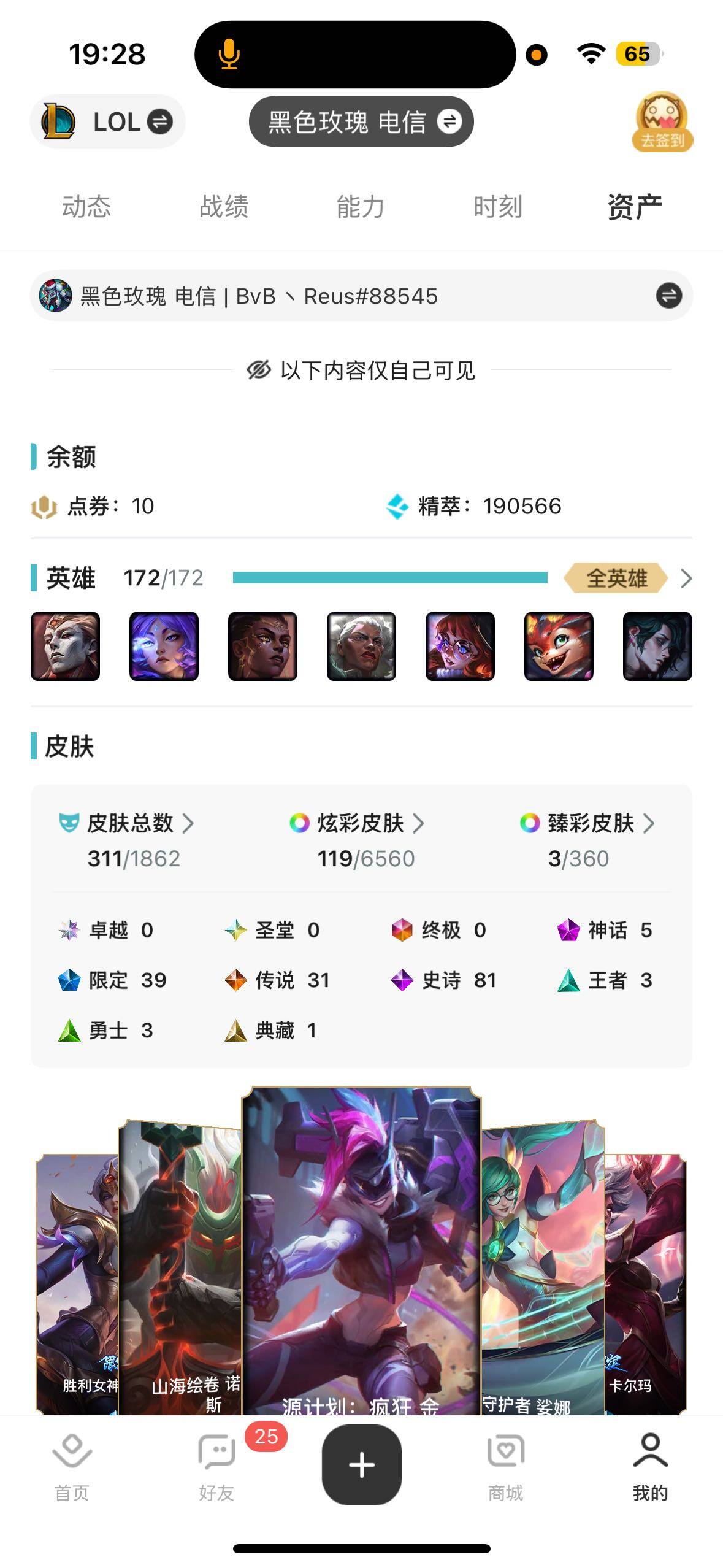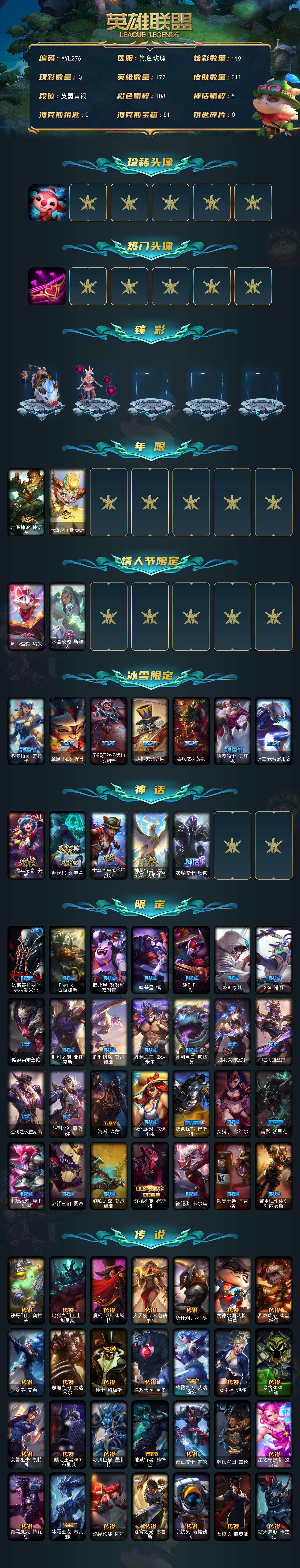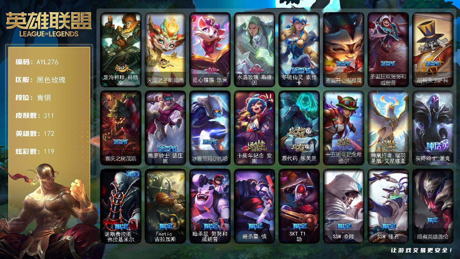 [15329608]【特价出售/店主推荐】青铜段位-172英雄-311皮肤-119炫彩-0终极-5神话-39限定-31传说-81史诗