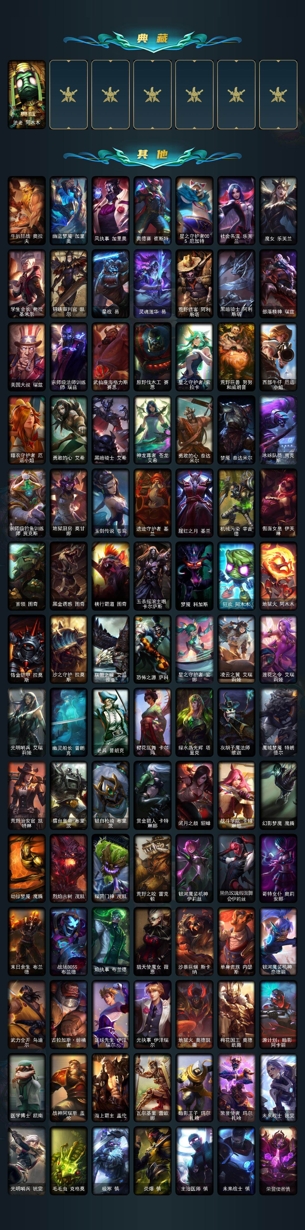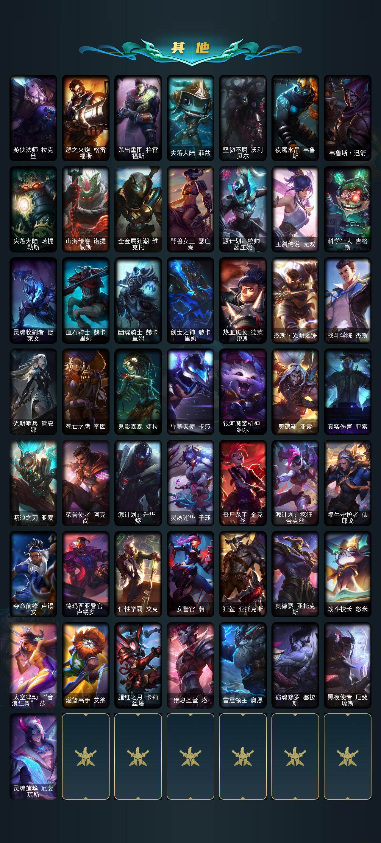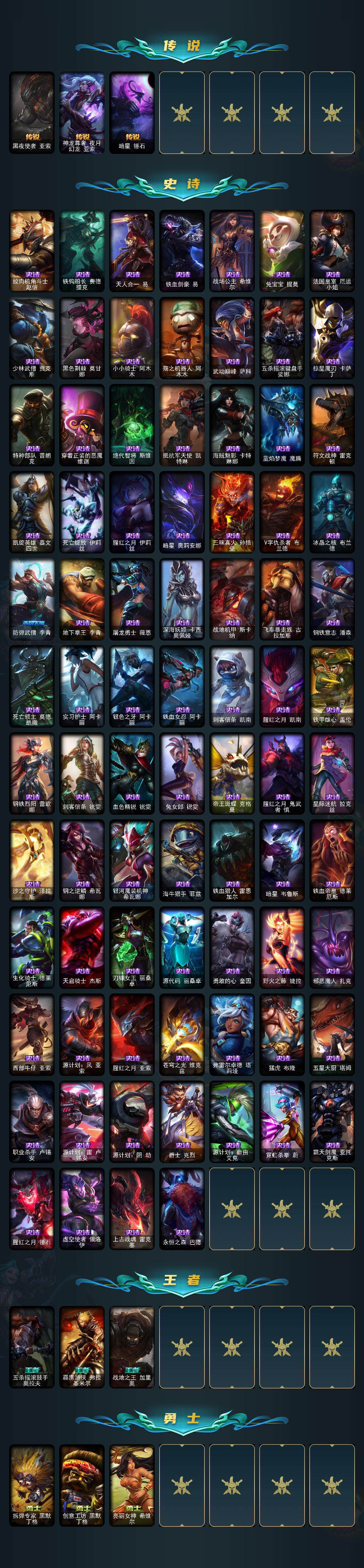 【传说皮肤】:铁哥们儿奥拉夫,地狱之门卫士加里奥,魔幻卡牌崔斯特,大天使长米迦勒凯尔,源计划林易,约德尔国队长提莫,烈焰雄心崔丝塔娜,女皇艾希,恶魔之刃泰达米尔,绅士科加斯,律政大亨蒙多,冰霜之刃艾瑞莉娅,女主播迦娜,最终BOSS维迦,女警狙击凯特琳,陆地王者4WD布里茨,冰川巨兽墨菲特,地狱行者孙悟空,死亡骑士盖伦,钢铁军团盖伦,星之守护者拉克丝,黯黑魔龙希瓦娜,冰霜亚龙希瓦娜,焰尾妖狐阿狸,苍穹之光韦鲁斯,宇航员诺提勒斯,女校长菲奥娜,霸天异形卡兹克,黑夜使者亚索,神龙尊者夜月幻龙亚索,暗星锤石