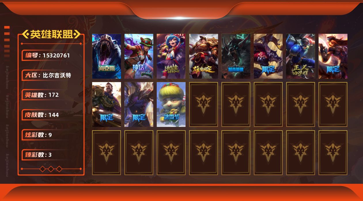 [15320761]有二次【特价出售/店主推荐】白银段位-172英雄-144皮肤-9炫彩-0终极-4神话-11限定-16传说-40史诗