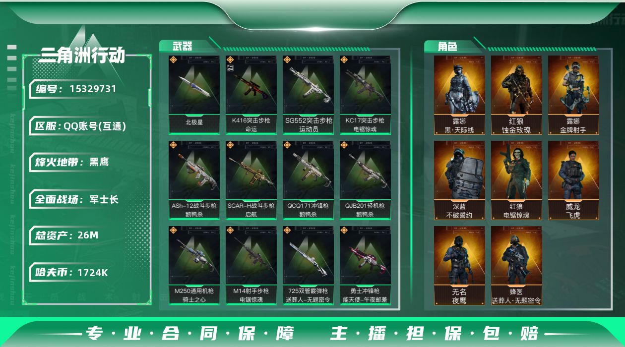 [15329731]26m总资产-1724k哈伏币-60烽火等级-黑鹰-50战场等级-军士长 【干员外观】:红狼-蚀金玫瑰,露娜-黑·天际线,威龙-飞虎,蜂医-送葬人·无题密令,无名-夜鹰,深蓝-不破誓约,红狼-电锯惊魂,露娜-金牌射手 【近战皮肤】:近战-北极星,近战-黑鹰 【典藏外观】:K416突击步枪-命运 【传说外观】:M4A1突击步枪-蚀金玫瑰,M4A1突击步枪-阿米娅,ASh-12战斗步枪-鹅鸭杀,SG552突击步枪-运动员,AK-12突击步枪-夜鹰,AK-12突击步枪-特斯拉线圈,SCAR-H战斗步枪-启航,CAR-15突击步枪-黑鹰坠落,CAR-15突击步枪-阿米娅,腾龙突击步枪-捞点薯条,K437突击步枪-北极星,KC17突击步枪-电锯惊魂,UZI冲锋枪-特斯拉线圈,SMG-45冲锋枪-骑士,SR-3M紧凑突击步枪-特斯拉线圈,勇士冲锋枪-能天使-午夜邮差,QCQ171冲锋枪-北极星,QCQ171冲锋枪-鹅鸭杀,725双管霰弹枪-送葬人-无题密令,M250通用机枪-骑士之心,QJB201轻机枪-鹅鸭杀,M14射手步枪-电锯惊魂,AWM狙击步枪-捞点薯条,G18-飞虎,93R-捞点薯条,复合弓-黑·天际线 【史诗外观】:AKM突击步枪-林中猎手,QBZ95-1突击步枪-曙光,ASh-12战斗步枪-守夜人,ASh-12战斗步枪-无极限,M16A4突击步枪-竞赛选手,AUG突击步枪-蝮蛇,M7战斗步枪-百步穿杨,SG552突击步枪-尖端治疗,SG552突击步枪-深海恐惧,SCAR-H战斗步枪-囚徒,G3战斗步枪-流沙送葬,AS Val突击步枪-尖端治疗,AS Val突击步枪-典狱官,AS Val突击步枪-百步穿杨,腾龙突击步枪-无垢,腾龙突击步枪-猎鳄行动,K437突击步枪-守护者,MP5冲锋枪-深海恐惧,MP5冲锋枪-战术竞备,MP5冲锋枪-竞技风,Vector冲锋枪-阿萨拉文明,Vector冲锋枪-猎鳄行动,Vector冲锋枪-百步穿杨,Vector冲锋枪-异域战争,SR-3M紧凑突击步枪-荒野求生,SR-3M紧凑突击步枪-战术竞备,勇士冲锋枪-深海恐惧,勇士冲锋枪-工业狂潮,MP7冲锋枪-无垢,MP7冲锋枪-守护者,M1014霰弹枪-林中猎手,PKM通用机枪-蝮蛇,PKM通用机枪-守夜人,PKM通用机枪-荒野求生,M250通用机枪-囚徒,Mini-14射手步枪-守护