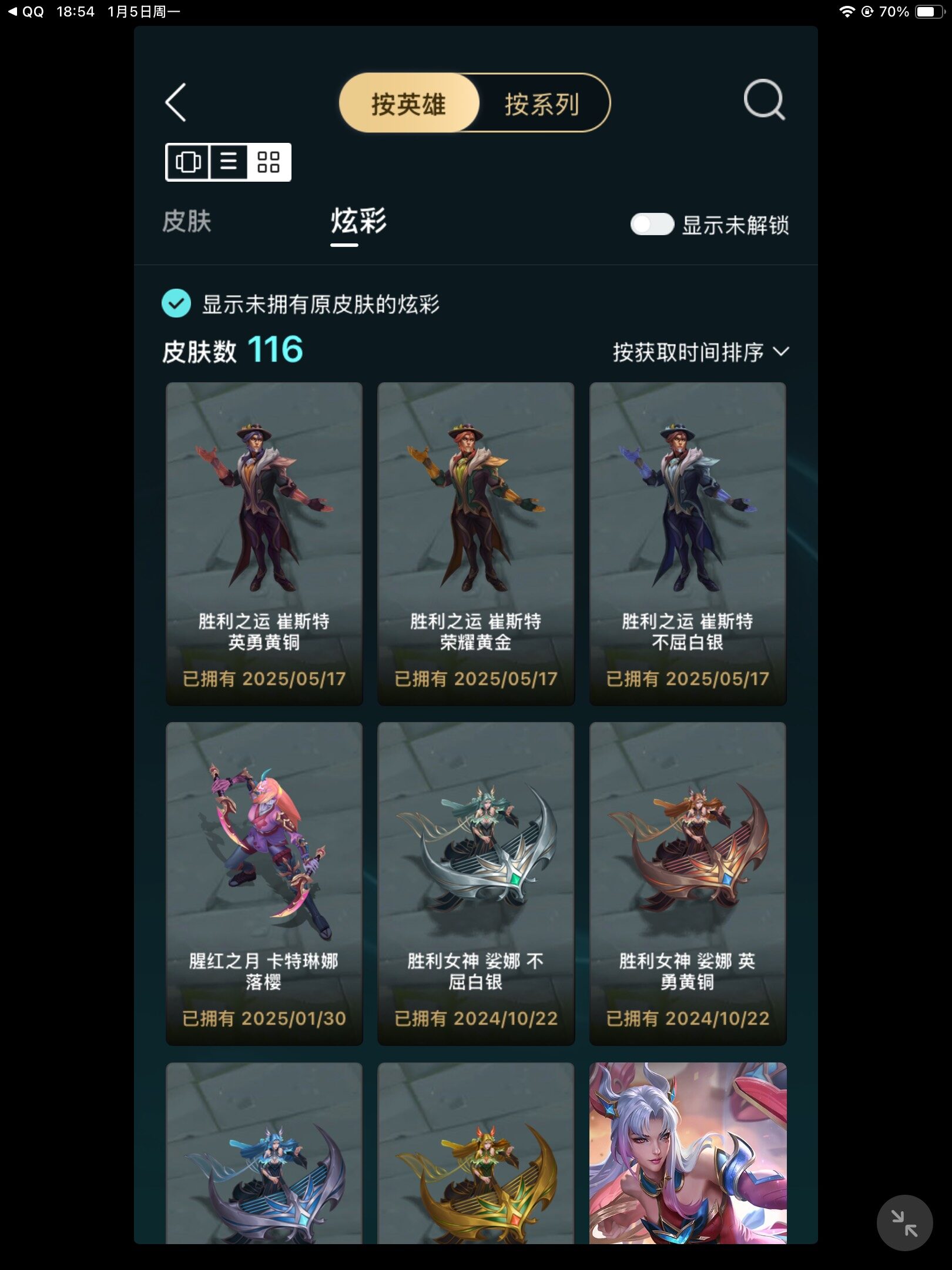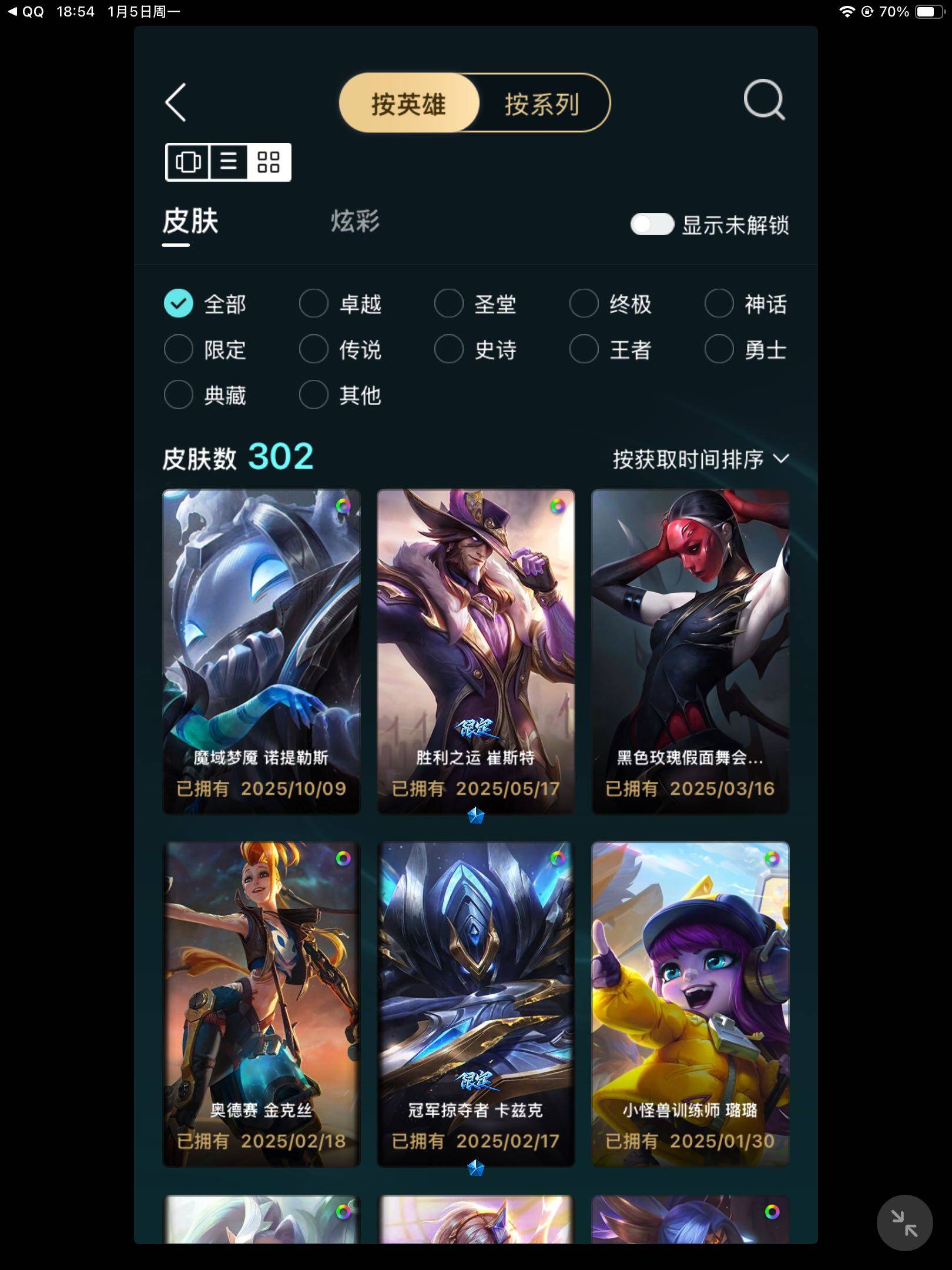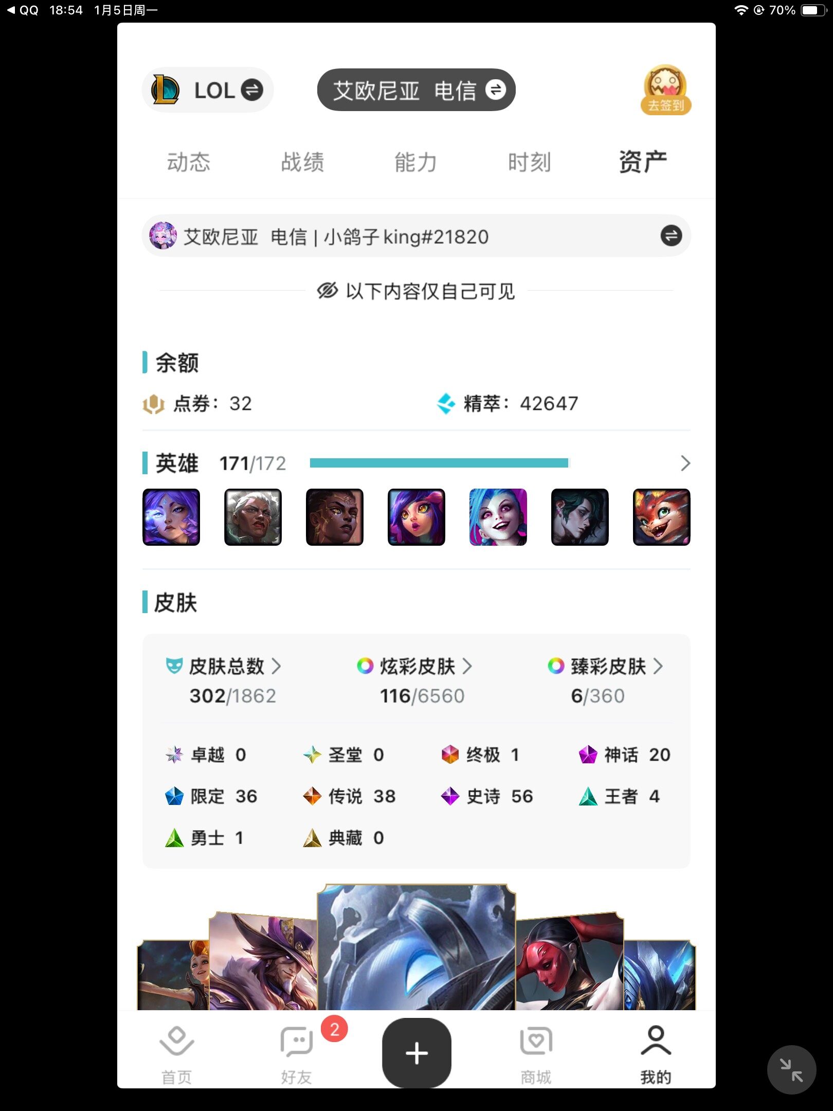 [15320819]铂金段位-171英雄-302皮肤-116炫彩-1终极-20神话-36限定-38传说-56史诗