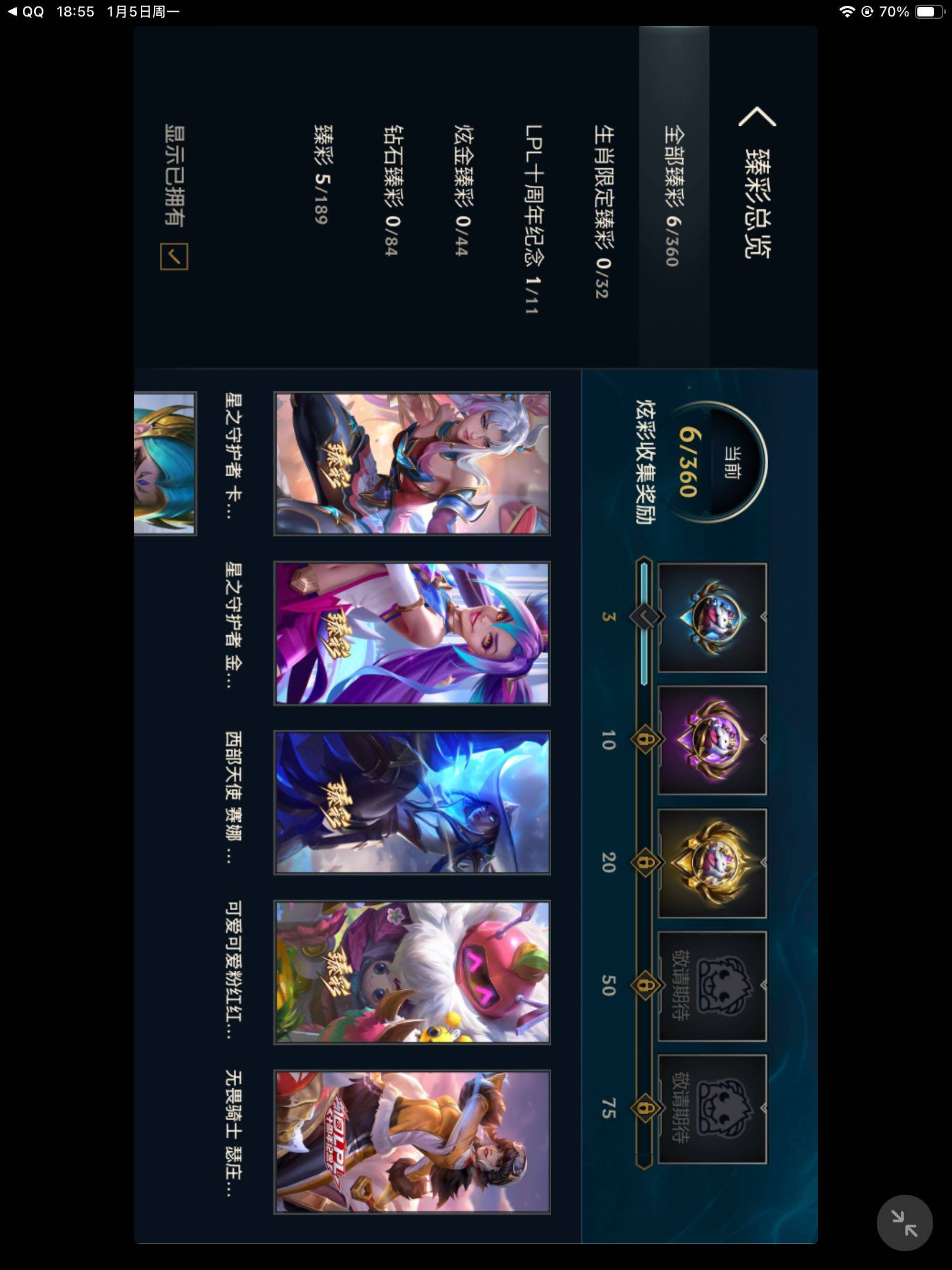 【臻彩皮肤】:无畏骑士瑟庄妮赤子初心,西部天使赛娜神选天使长,星之守护者金克丝黑洞,星之守护者卡莎热情之光,可爱可爱粉红红布里茨,殿堂传奇乐芙兰登神
