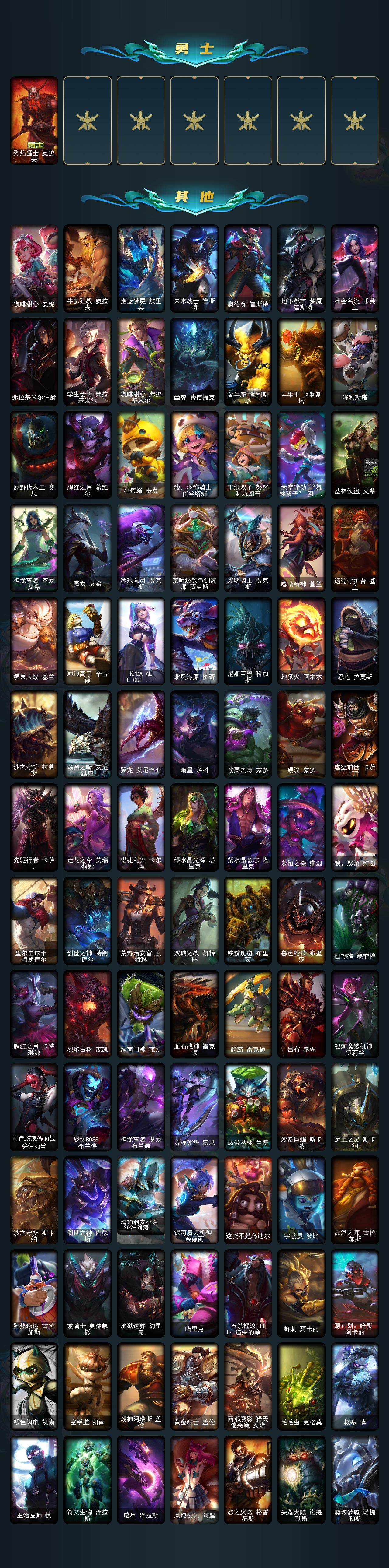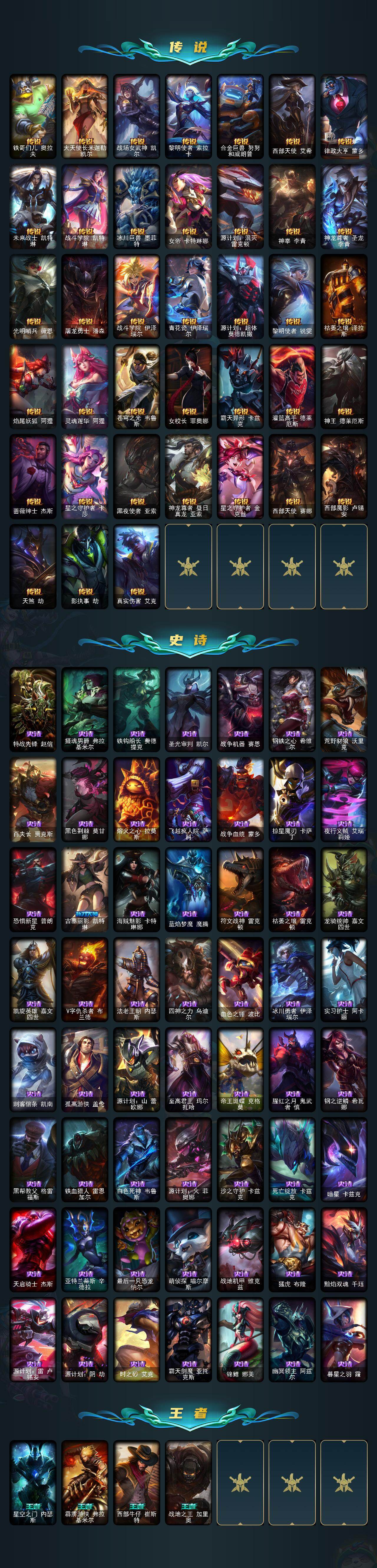 【传说皮肤】:铁哥们儿奥拉夫,大天使长米迦勒凯尔,战场女武神凯尔,黎明使者索拉卡,合金巨兽努努和威朗普,西部天使艾希,律政大亨蒙多,未来战士凯特琳,战斗学院凯特琳,冰川巨兽墨菲特,女帝卡特琳娜,源计划泯灭雷克顿,神拳李青,神龙尊者圣龙李青,光明哨兵薇恩,屠龙勇士潘森,战斗学院伊泽瑞尔,青花瓷伊泽瑞尔,源计划超体莫德凯撒,黎明使者锐雯,枯萎之壤泽拉斯,焰尾妖狐阿狸,灵魂莲华阿狸,苍穹之光韦鲁斯,女校长菲奥娜,