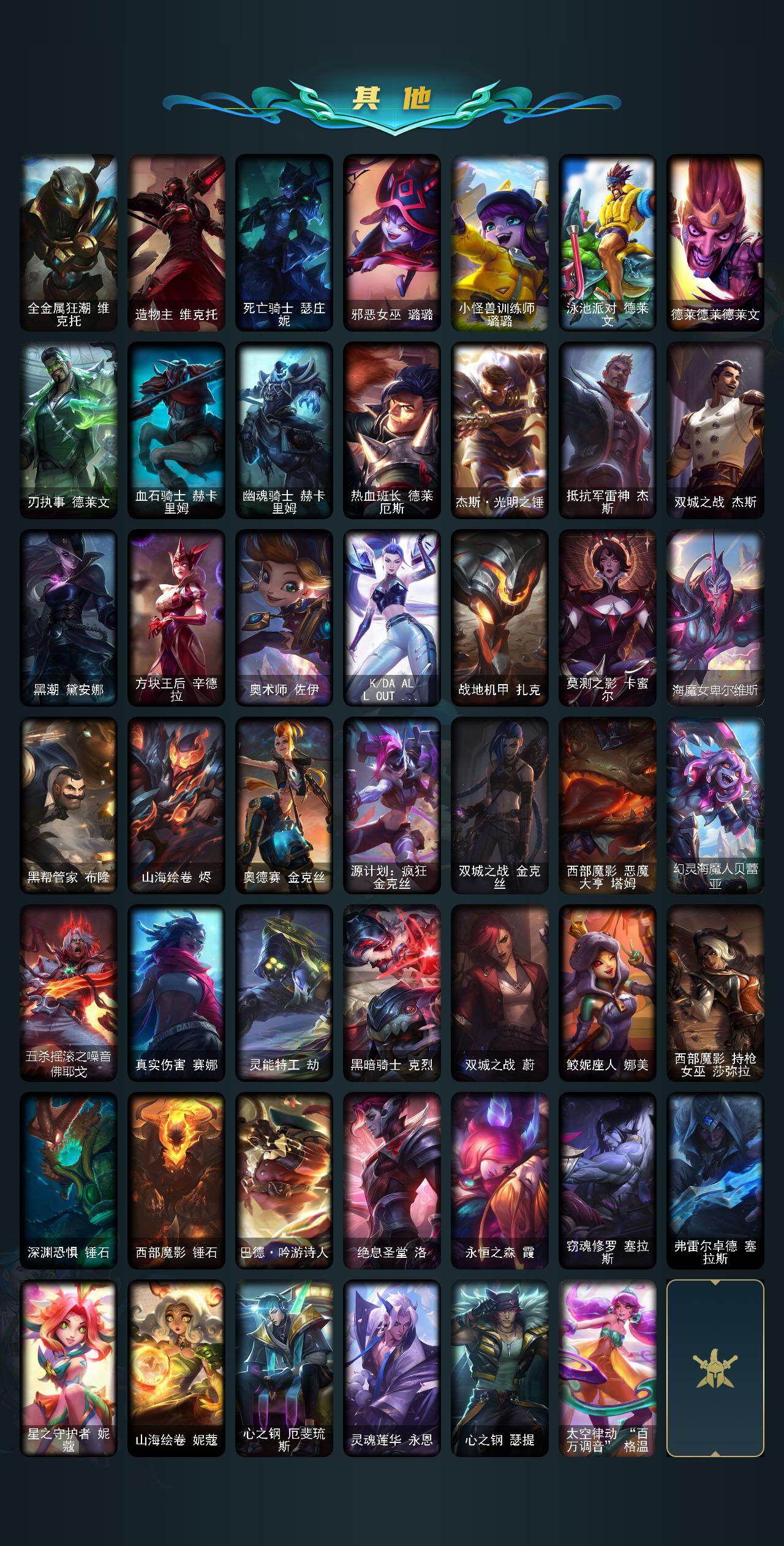 【限定皮肤】:舞会公主安妮,冠军掠夺者卡兹克,暗杀星努努和威朗普,暗杀星伊泽瑞尔,SKTT1劫,SKTT1瑞兹,SKTT1辛德拉,iG卡莎,EDG佛耶戈,DRX亚托克斯,神凰行者烈羽焰凰霞,海珀利安小队Y03权天使卡蜜尔,胜利女神奥莉安娜,胜利之剑亚托克斯,胜利枪神卢锡安,胜利机器人布里茨,胜利凤凰艾尼维亚,胜利之王泰达米尔,胜利巨口克格莫,胜利女神娑娜,胜利之运崔斯特,泳池派对凯特琳,泳池派对瑟提,都铎王朝图奇,御星魔矢艾希,防暴士兵辛吉德