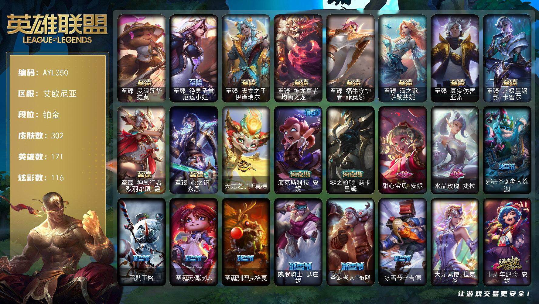 [15320819]铂金段位-171英雄-302皮肤-116炫彩-1终极-20神话-36限定-38传说-56史诗 【至臻皮肤】:至臻灵魂莲华提莫,至臻绝息圣堂厄运小姐,至臻天龙之子伊泽瑞尔,至臻神龙尊者均衡之龙沃利贝尔,至臻福牛守护者菲奥娜,至臻海之歌萨勒芬妮,至臻真实伤害亚索,至臻北极星钢影卡蜜尔,至臻神凰行者烈羽焰凰霞,至臻心之钢永恩 【臻彩皮肤】:无畏骑士瑟庄妮赤子初心,西部天使赛娜神选天使长,星之守护者金克丝黑洞,星之守护者卡莎热情之光,可爱可爱粉红红布里茨,殿堂传奇乐芙兰登神 【年限皮肤】:天龙之子斯莫德 【海克斯皮肤】:海克斯科技安妮,零之枪骑赫卡里姆 【情人节限定】:甜心宝贝安妮,水晶玫瑰婕拉 【冰雪限定】:邪恶圣诞老人维迦,雪默丁格,圣诞玩偶波比,圣诞驯鹿克格莫,魄罗骑士瑟庄妮,圣诞老人布隆,冰雪节辛吉德 【终极皮肤】:大元素使拉克丝 【神话皮肤】:十周年纪念安妮,源代码乐芙兰,殿堂传奇乐芙兰,神凰行者瑞羽圣凰艾尼维亚,黎明使者卡尔玛,水晶圣骑蕾欧娜,水晶掠夺者卡兹克,灰烬骑士派克,海克斯科技安妮,零之枪骑赫卡里姆,至臻真实伤害亚索,至臻天龙之子伊泽瑞尔,至臻北极星钢影卡蜜尔,至臻福牛守护者菲奥娜,至臻海之歌萨勒芬妮,至臻绝息圣堂厄运小姐,至臻灵魂莲华提莫,至臻神凰行者烈羽焰凰霞,至臻神龙尊者均衡之龙沃利贝尔,至臻心之钢永恩 【限定皮肤】:舞会公主安妮,冠军掠夺者卡兹克,暗杀星努努和威朗普,暗杀星伊泽瑞尔,SKTT1劫,SKTT1瑞兹,SKTT1辛德拉,iG卡莎,EDG佛耶戈,DRX亚托克斯,神凰行者烈羽焰凰霞,海珀利安小队Y03权天使卡蜜尔,胜利女神奥莉安娜,胜利之剑亚托克斯,胜利枪神卢锡安,胜利机器人布里茨,胜利凤凰艾尼维亚,胜利之王泰达米尔,胜利巨口克格莫,胜利女神娑娜,胜利之运崔斯特,泳池派对凯特琳,泳池派对瑟提,都铎王朝图奇,御星魔矢艾希,防暴士兵辛吉德 【传说皮肤】:铁哥们儿奥拉夫,大天使长米迦勒凯尔,战场女武神凯尔,黎明使者索拉卡,合金巨兽努努和威朗普,西部天使艾希,律政大亨蒙多,未来战士凯特琳,战斗学院凯特琳,冰川巨兽墨菲特,女帝卡特琳娜,源计划泯灭雷克顿,神拳李青,神龙尊者圣龙李青,光明哨兵薇恩,屠龙勇士潘森,战斗学院伊泽瑞尔,青花瓷伊泽瑞尔,源计划超体莫德凯撒,黎明使者锐雯,枯萎之壤泽拉斯,焰尾妖狐阿狸,灵魂莲华阿狸,苍穹之光韦鲁斯,女校长菲奥娜,
