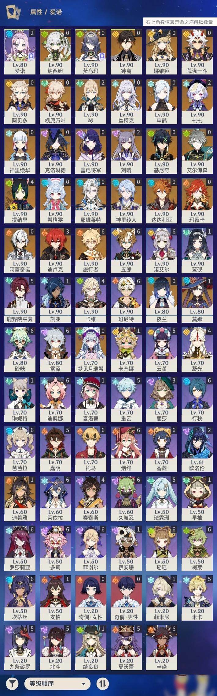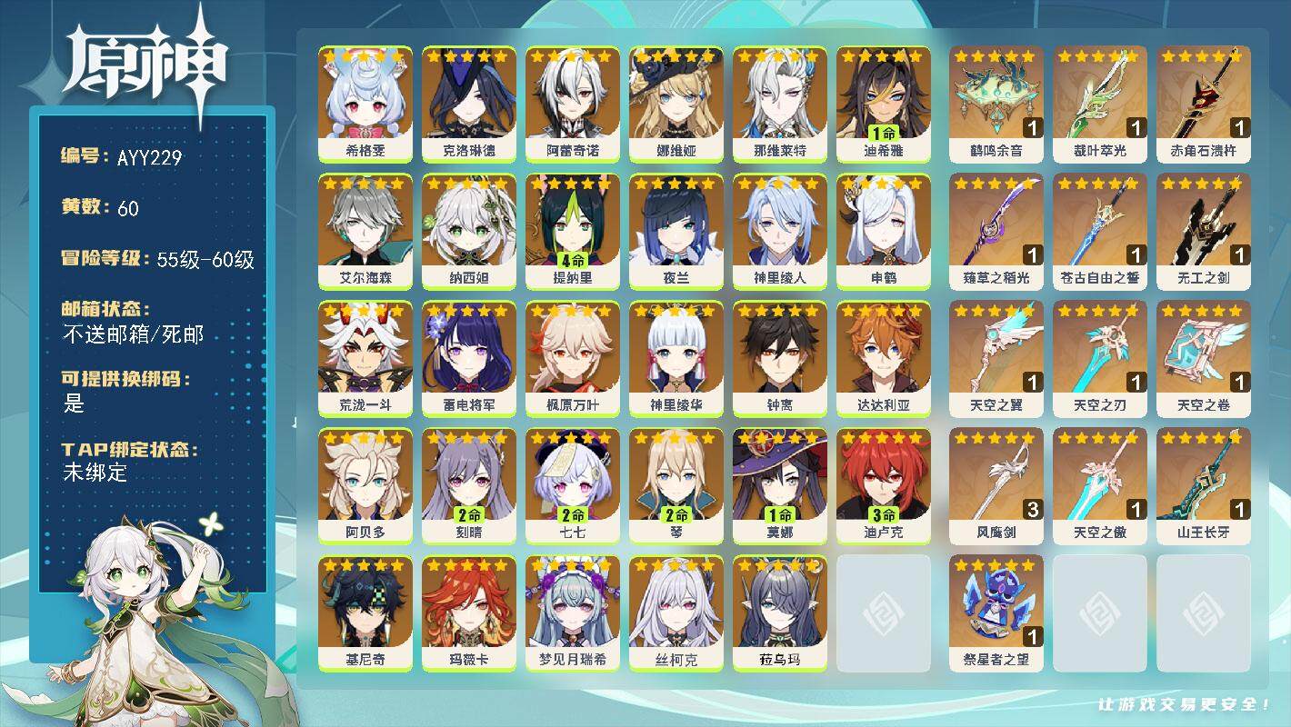 [15296409]60级/60黄/男主/29个五星角色/14个五星武器 0命希格雯,0命克洛琳德,0命阿蕾奇诺,0命娜维娅,0命那维莱特,1命迪希雅,0命艾尔海森,0命纳西妲,4命提纳里,0命夜兰,0命神里绫人,0命申鹤,0命荒泷一斗,0命雷电将军,0命枫原万叶,0命神里绫华,0命钟离,0命达达利亚,0命阿贝多,2命刻晴,2命七七,2命琴,1命莫娜,3命迪卢克,0命基尼奇,0命玛薇卡,0命梦见月瑞希,0命丝柯克,0命菈乌玛,精1鹤鸣余音,精1裁叶萃光,精1赤角石溃杵,精1薙草之稻光,精1苍古自由之誓,精1无工之剑,精1天空之翼,精1天空之刃,精1天空之卷,精3风鹰剑,精1天空之傲,精1山王长牙,精1祭星者之望