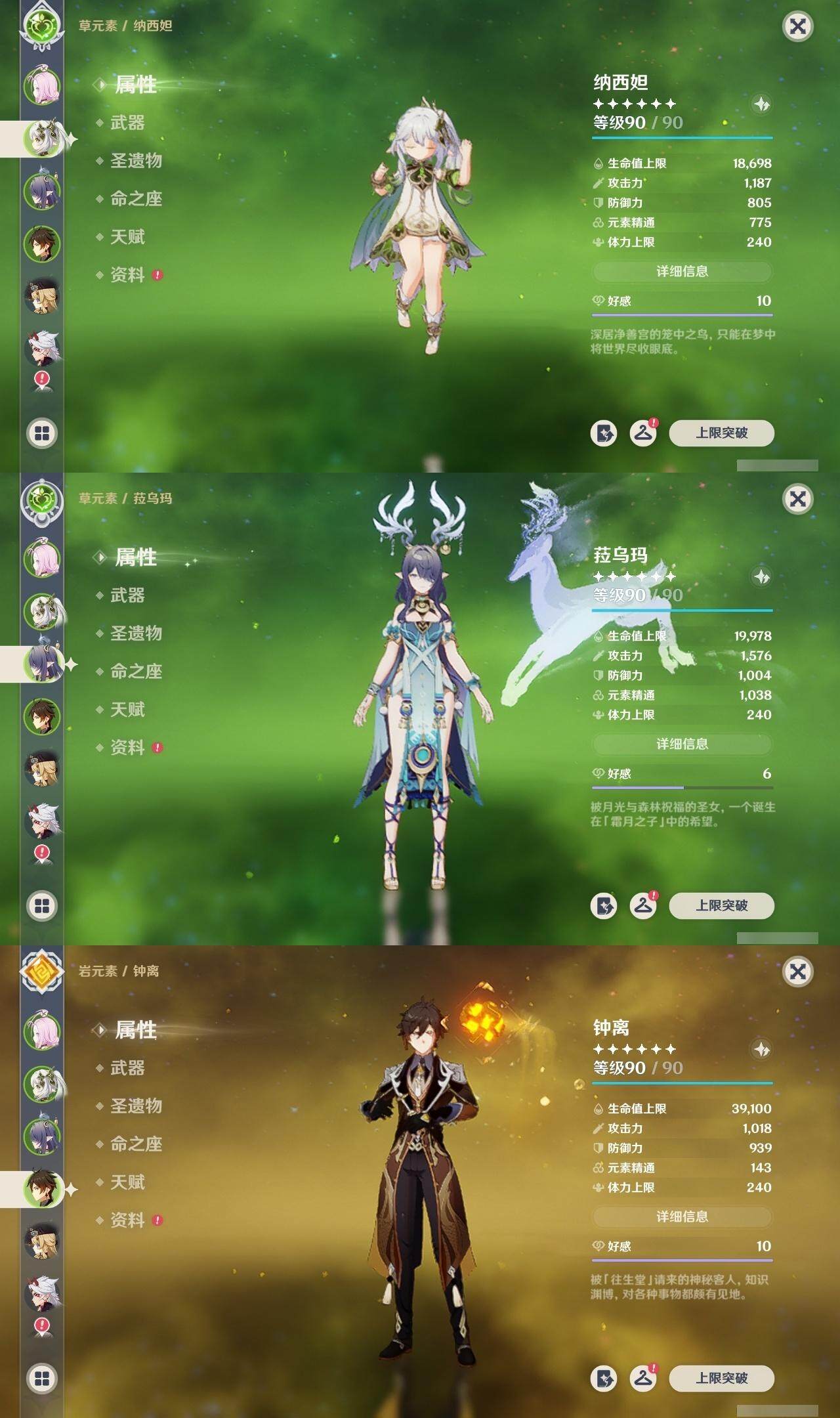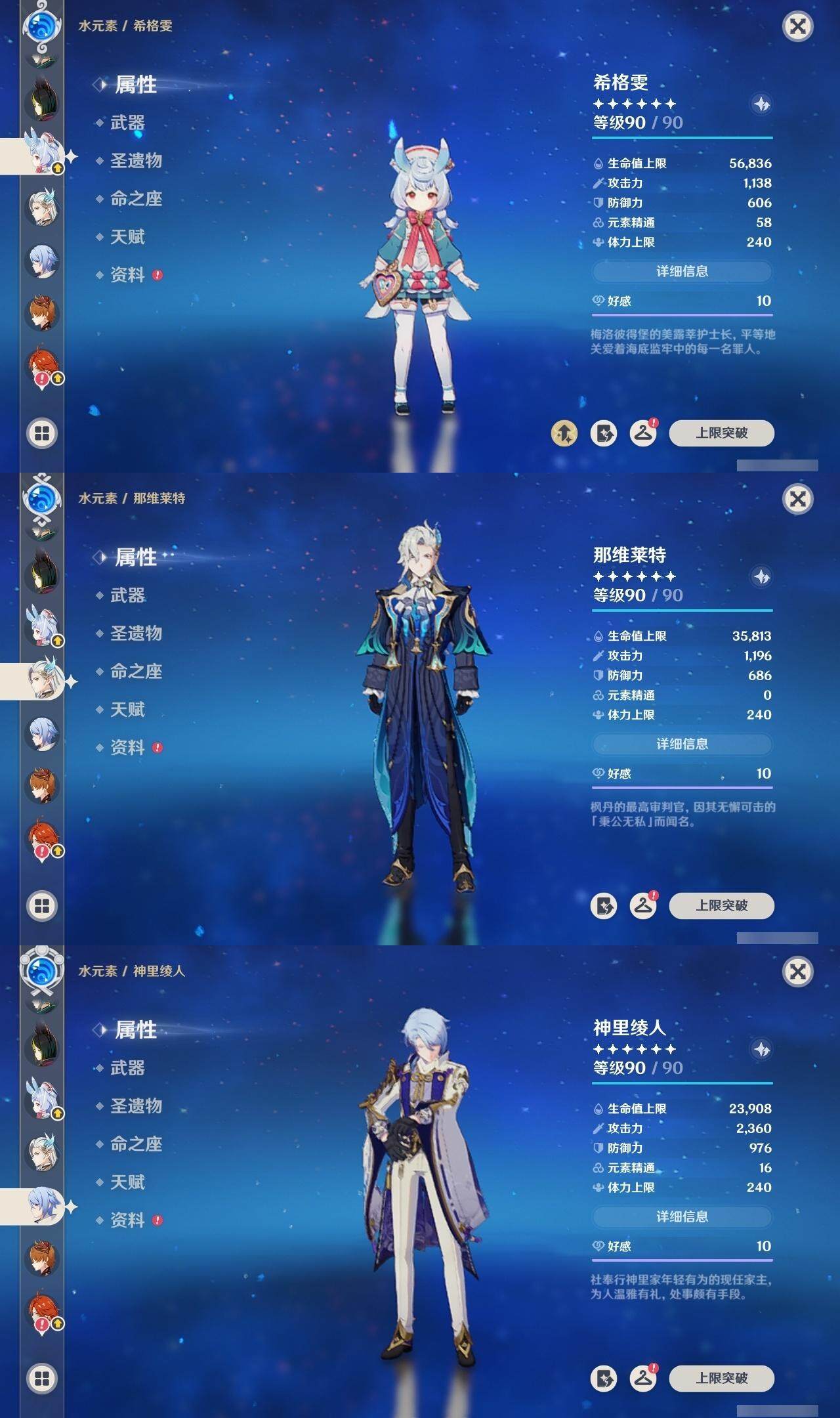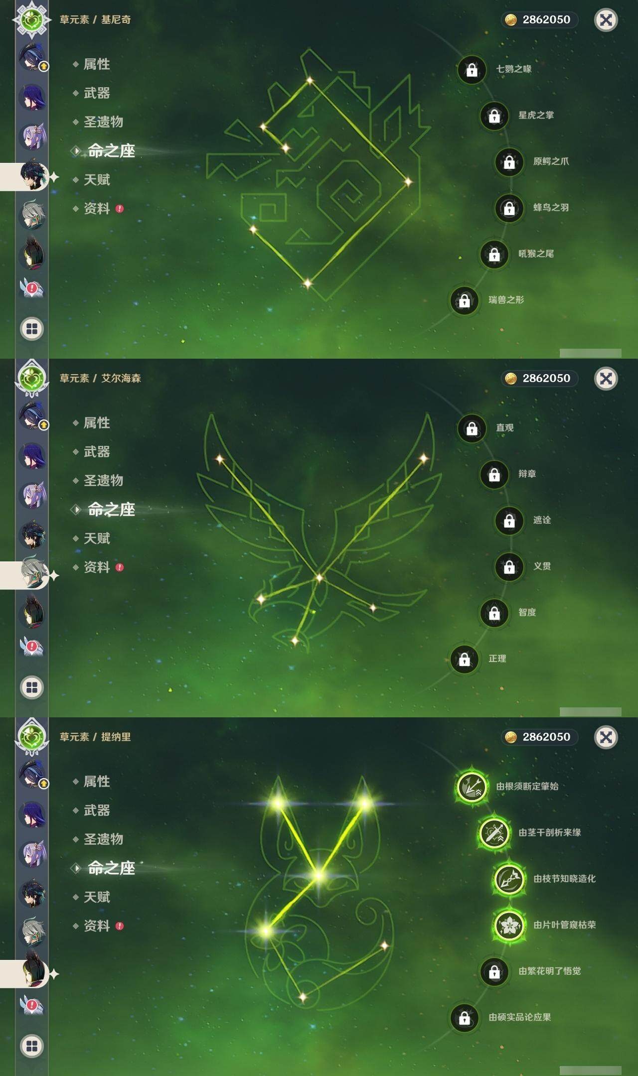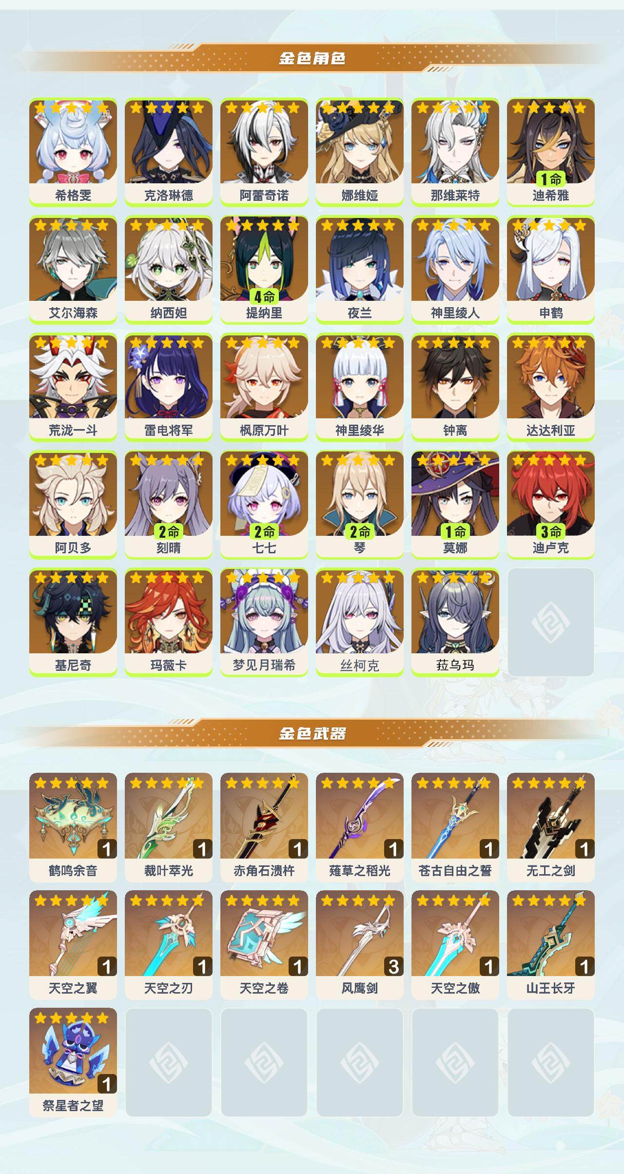 0命希格雯,0命克洛琳德,0命阿蕾奇诺,0命娜维娅,0命那维莱特,1命迪希雅,0命艾尔海森,0命纳西妲,4命提纳里,0命夜兰,0命神里绫人,0命申鹤,0命荒泷一斗,0命雷电将军,0命枫原万叶,0命神里绫华,0命钟离,0命达达利亚,0命阿贝多,2命刻晴,2命七七,2命琴,1命莫娜,3命迪卢克,0命基尼奇,0命玛薇卡,0命梦见月瑞希,0命丝柯克,0命菈乌玛,精1鹤鸣余音,精1裁叶萃光,精1赤角石溃杵,精1薙草之稻光,精1苍古自由之誓,精1无工之剑,精1天空之翼,精1天空之刃,精1天空之卷,精3风鹰剑,精1天空之傲,精1山王长牙,精1祭星者之望
