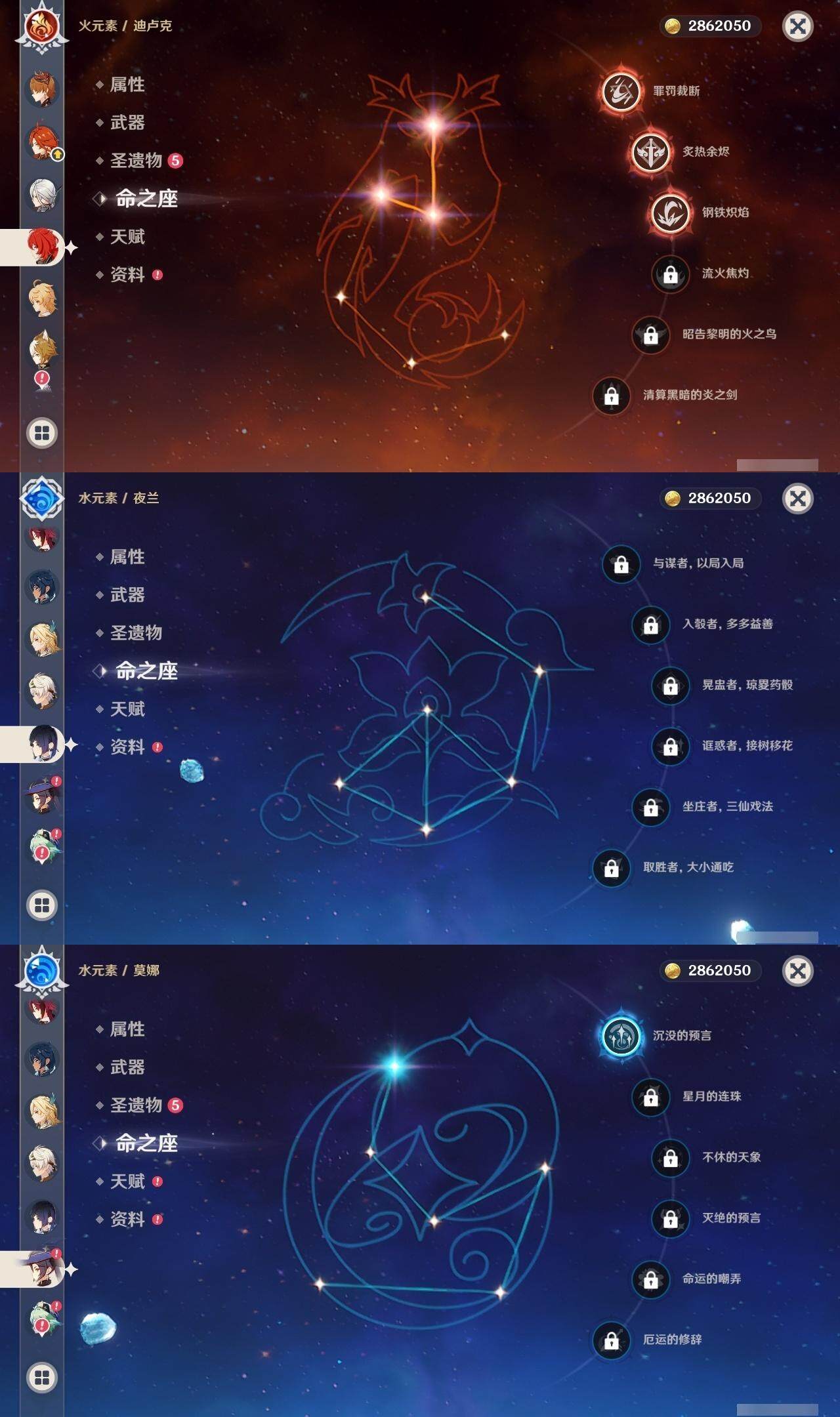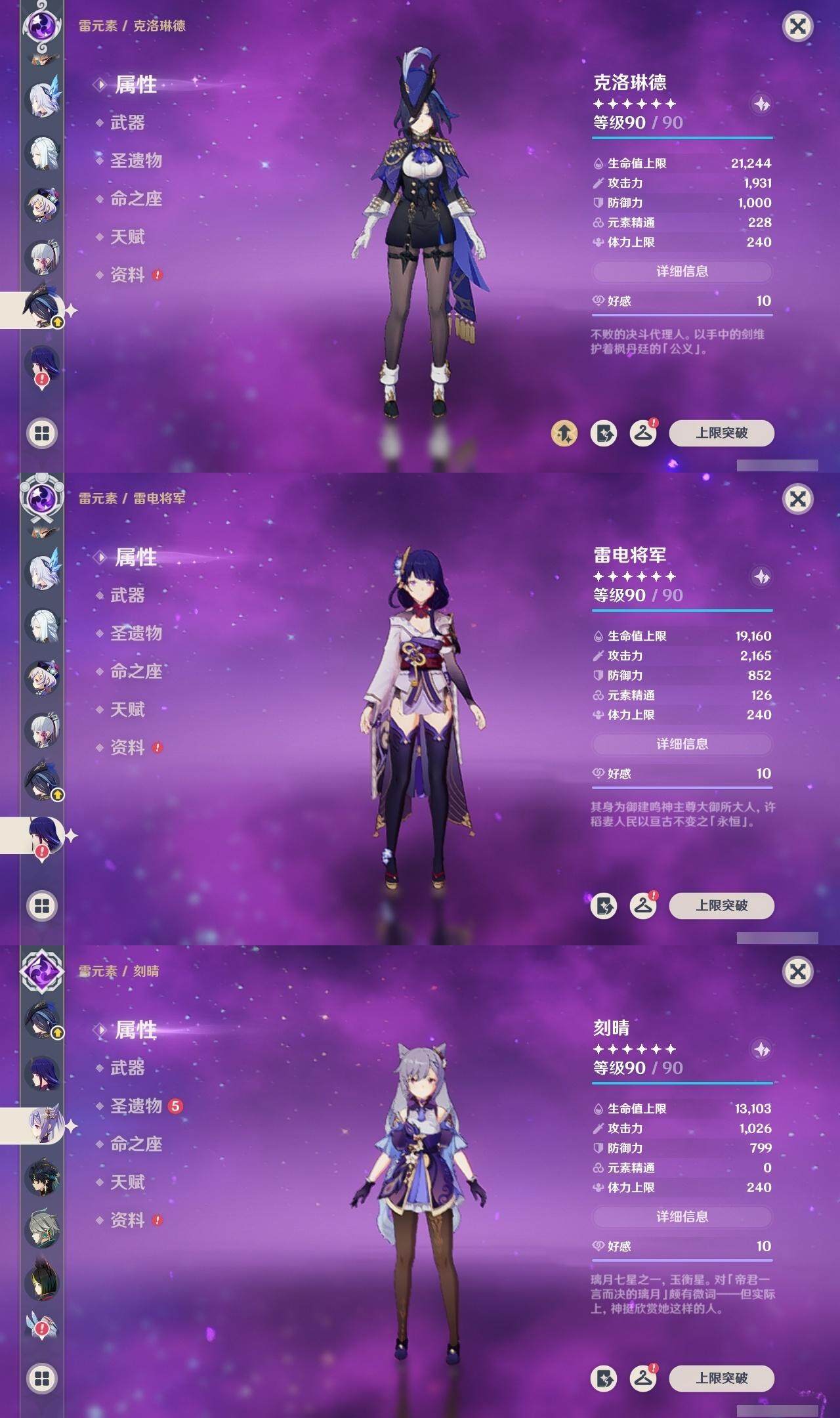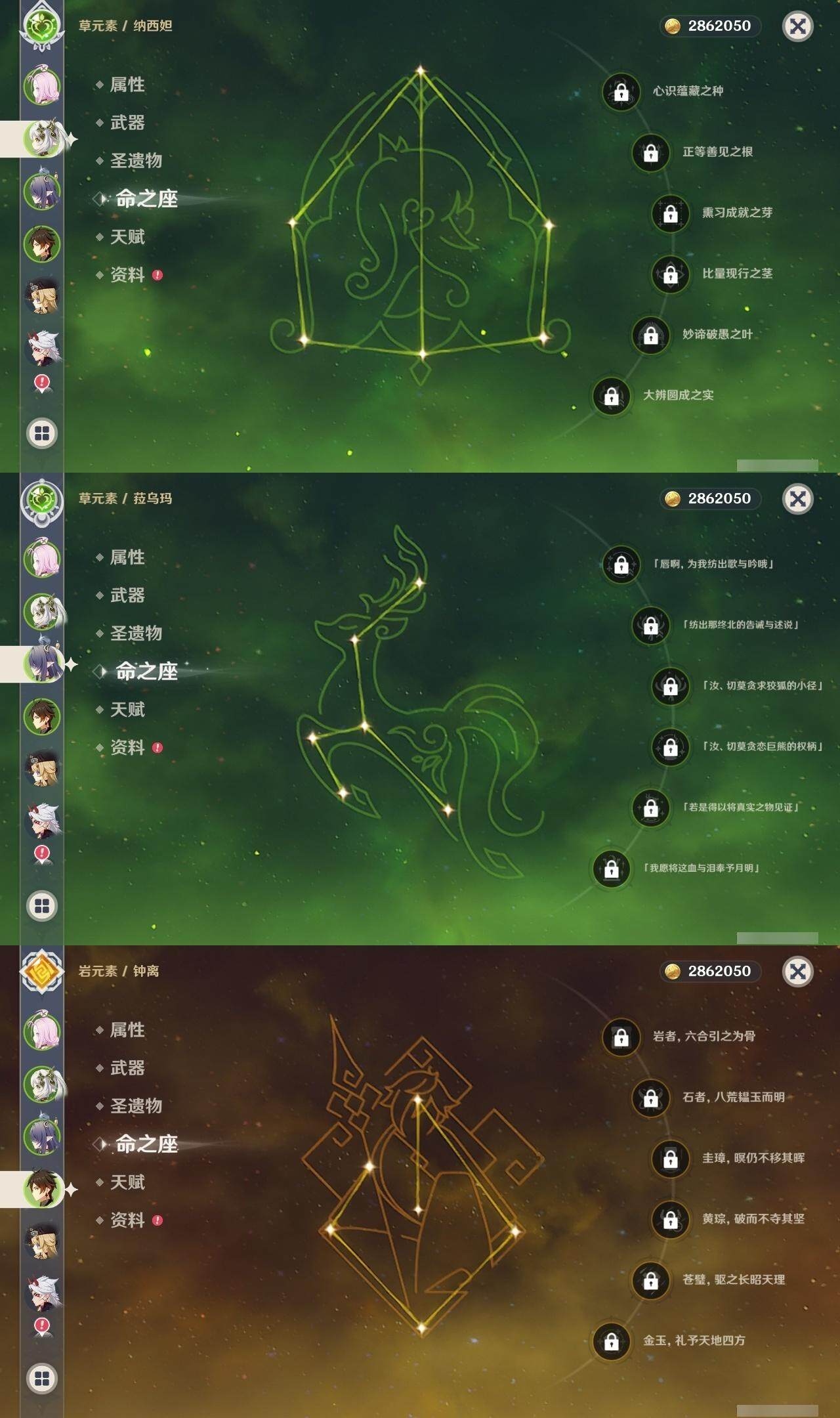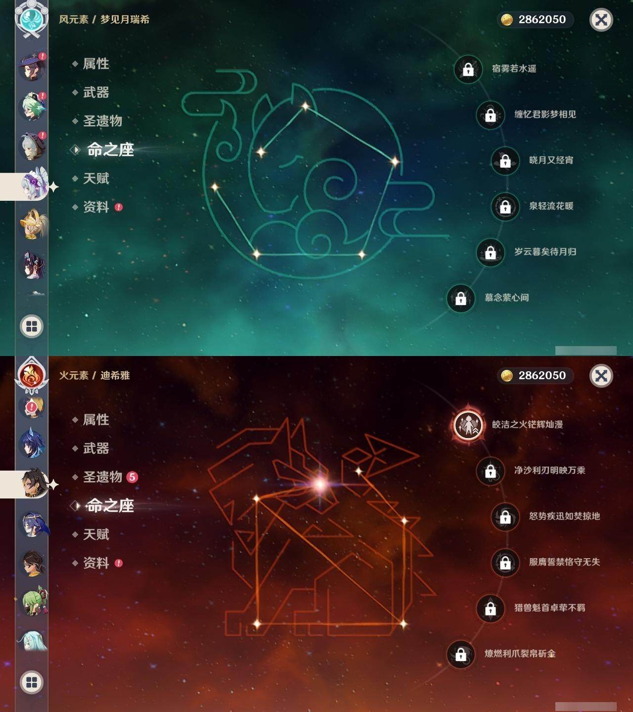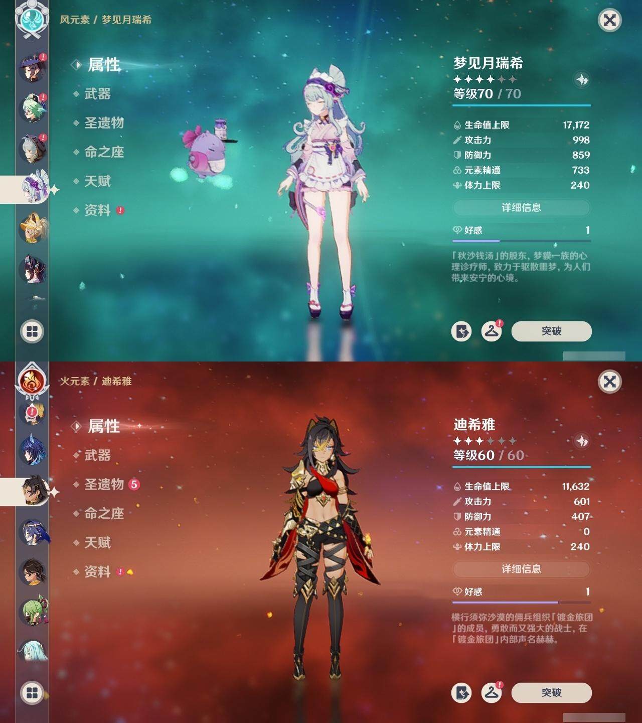 0命希格雯,0命克洛琳德,0命阿蕾奇诺,0命娜维娅,0命那维莱特,1命迪希雅,0命艾尔海森,0命纳西妲,4命提纳里,0命夜兰,0命神里绫人,0命申鹤,0命荒泷一斗,0命雷电将军,0命枫原万叶,0命神里绫华,0命钟离,0命达达利亚,0命阿贝多,2命刻晴,2命七七,2命琴,1命莫娜,3命迪卢克,0命基尼奇,0命玛薇卡,0命梦见月瑞希,0命丝柯克,0命菈乌玛,精1鹤鸣余音,精1裁叶萃光,精1赤角石溃杵,精1薙草之稻光,精1苍古自由之誓,精1无工之剑,精1天空之翼,精1天空之刃,精1天空之卷,精3风鹰剑,精1天空之傲,精1山王长牙,精1祭星者之望