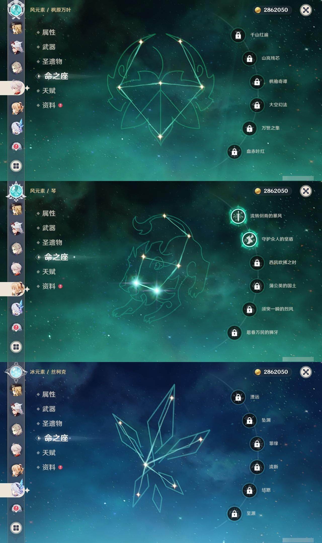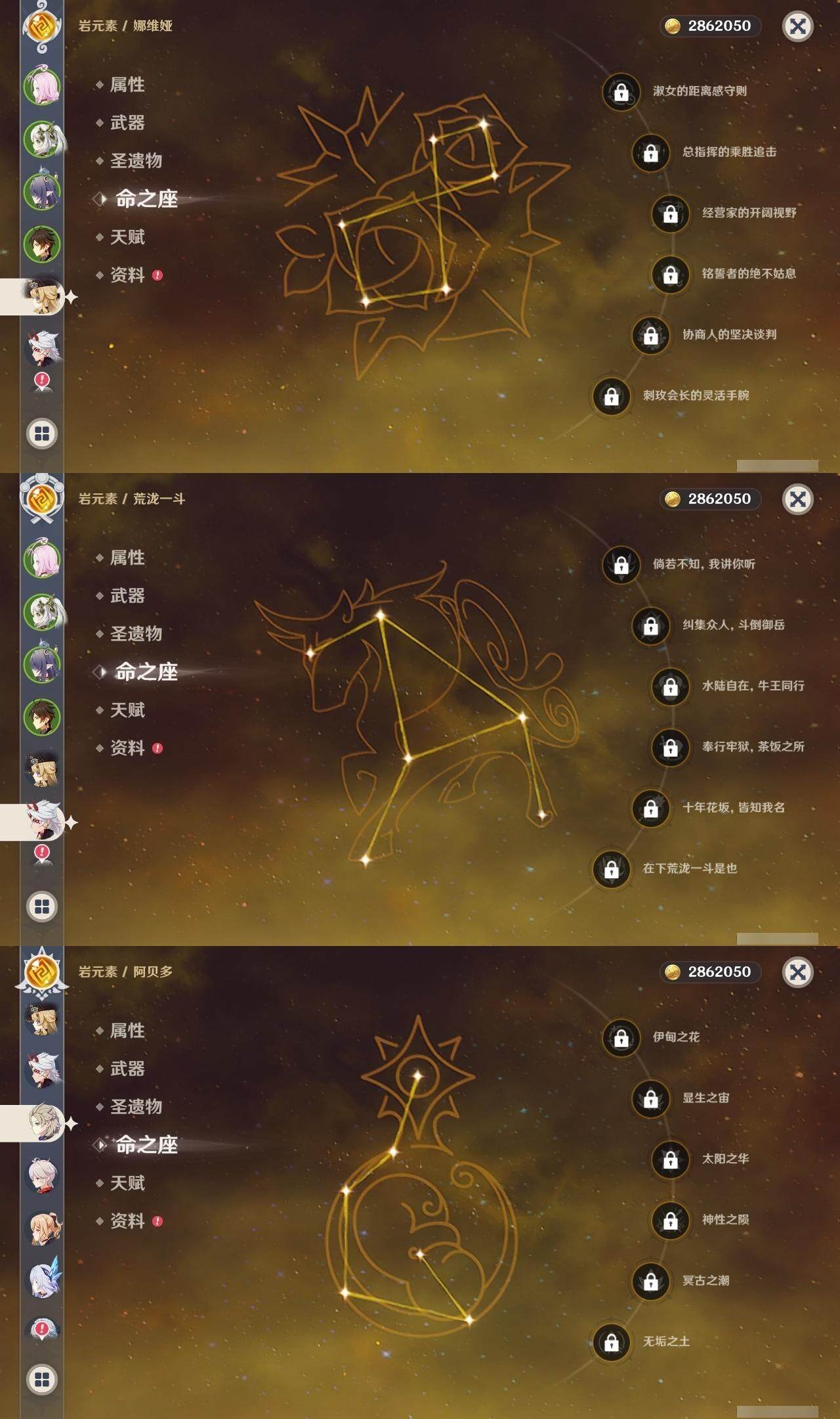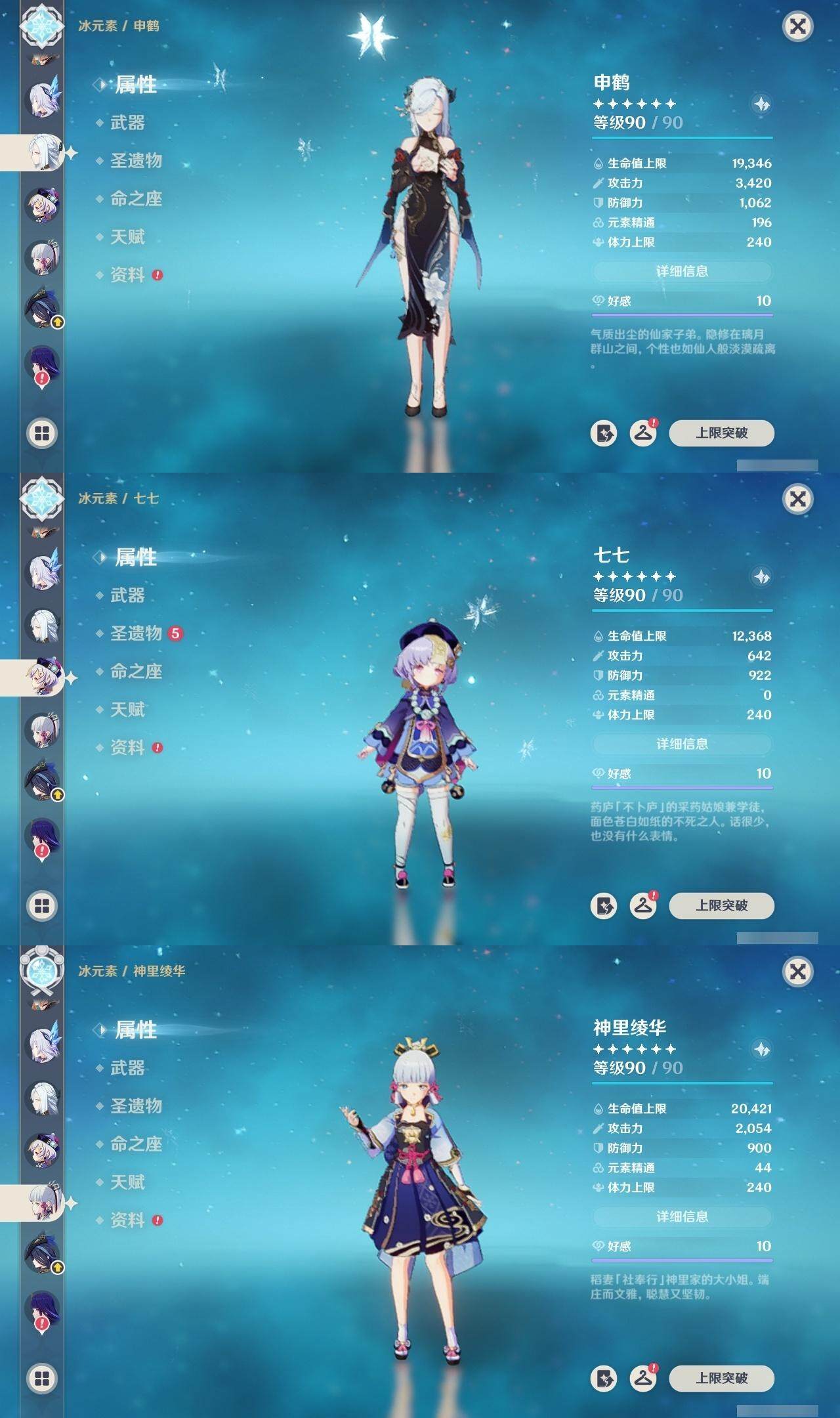 钟离,荒泷一斗,阿贝多,枫原万叶,琴,申鹤,七七,神里凌华,雷电将军,刻晴,达达利亚,迪卢克,莫娜