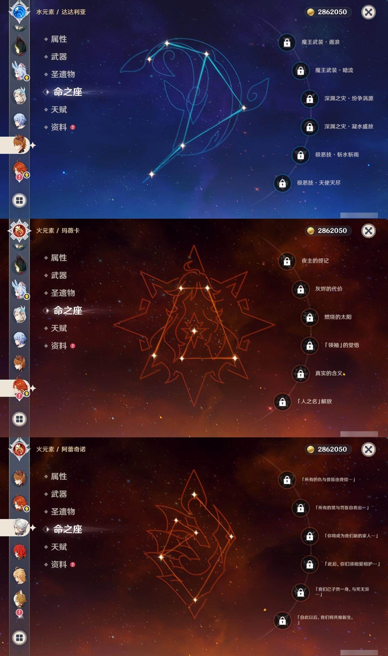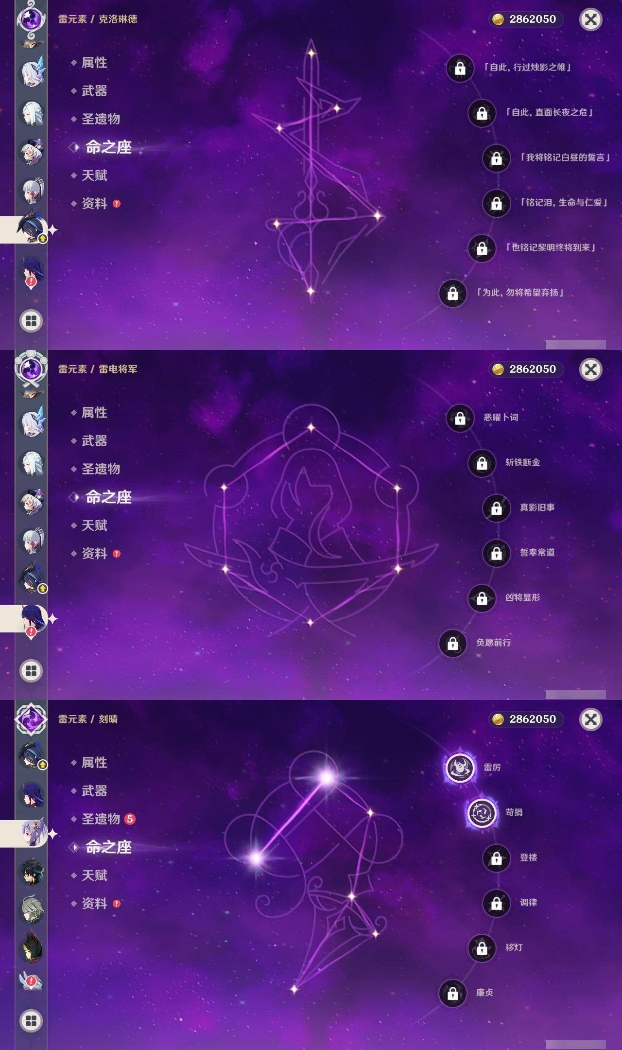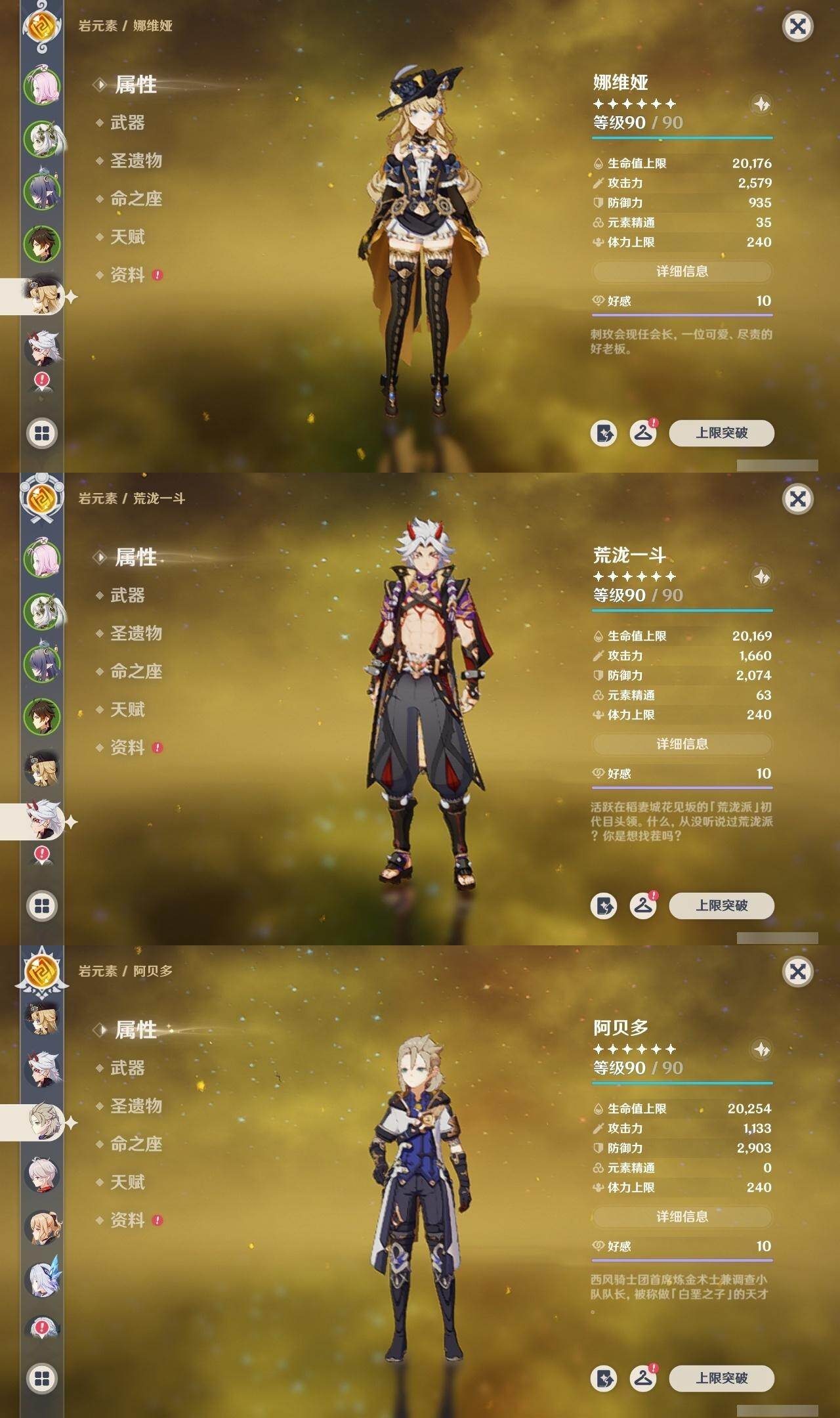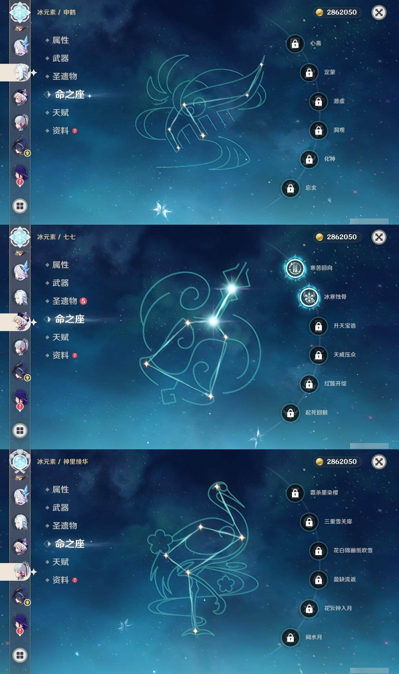 钟离,荒泷一斗,阿贝多,枫原万叶,琴,申鹤,七七,神里凌华,雷电将军,刻晴,达达利亚,迪卢克,莫娜