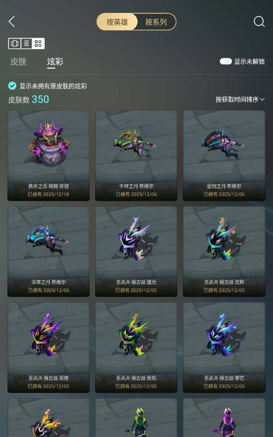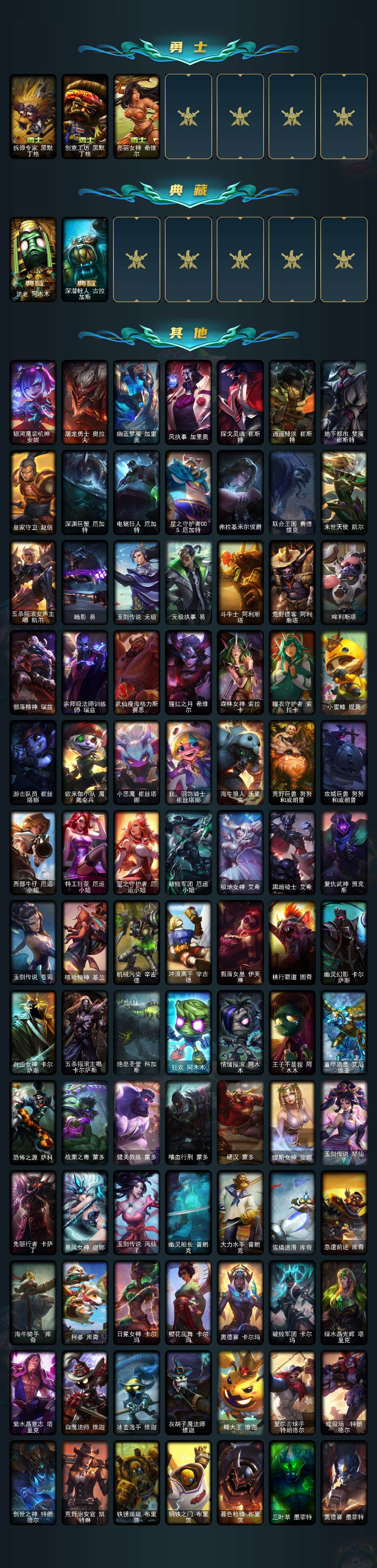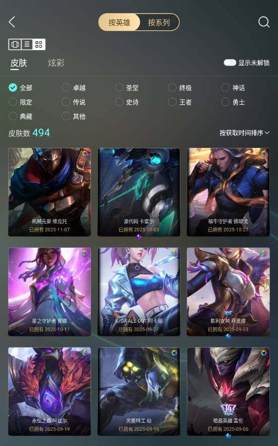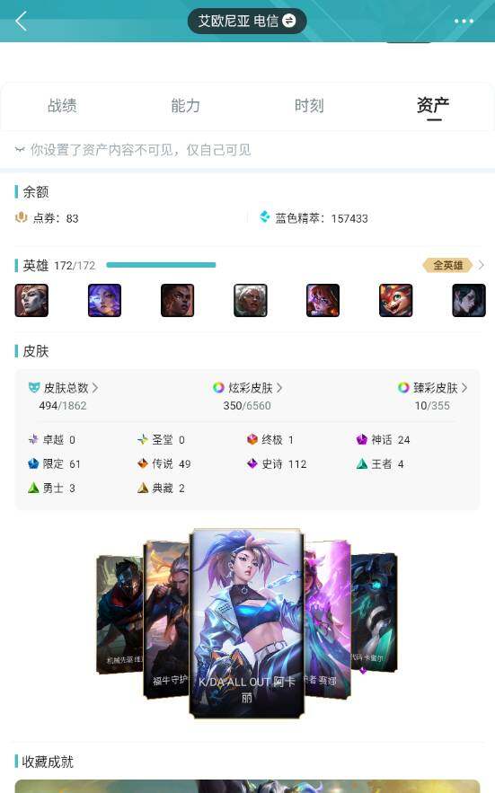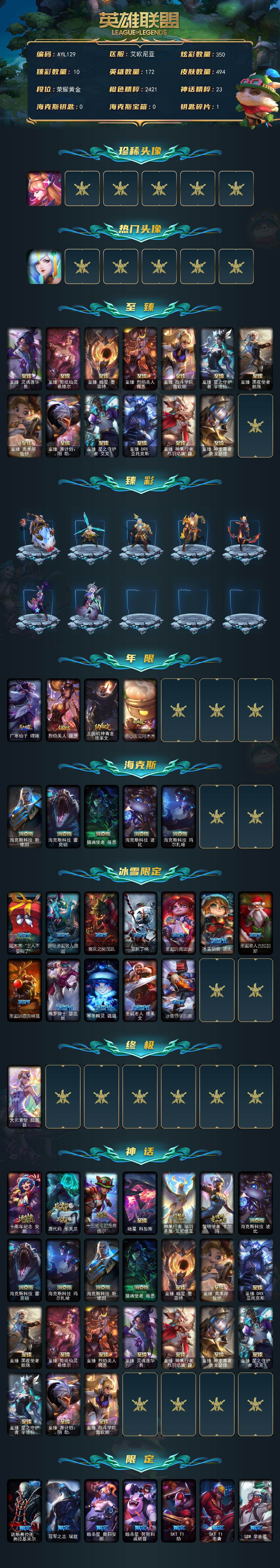 黄金段位-172英雄-494皮肤-350炫彩-1终极-24神话-61限定-49传说-112史诗