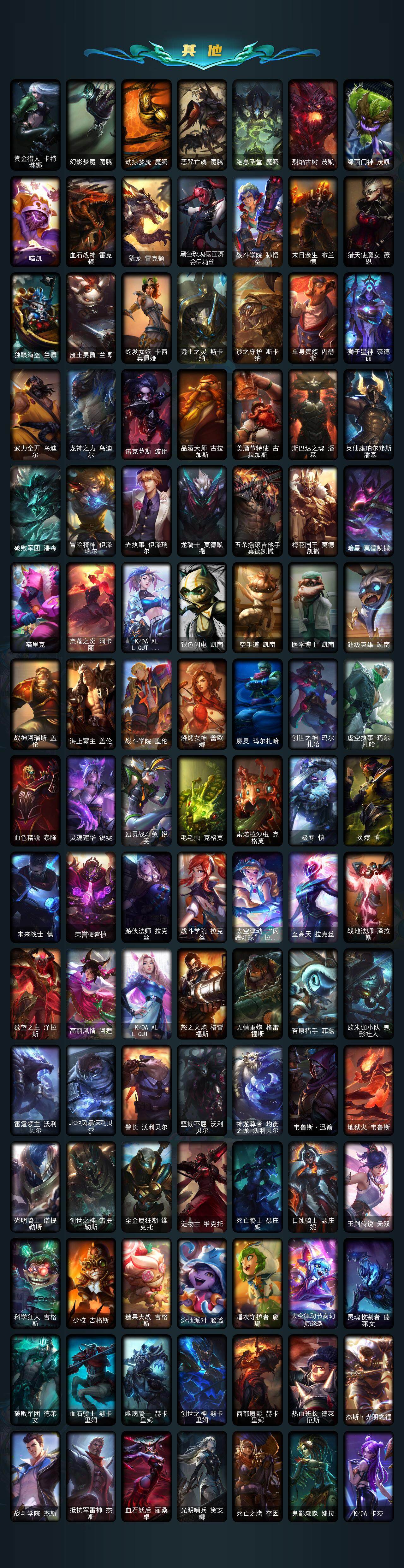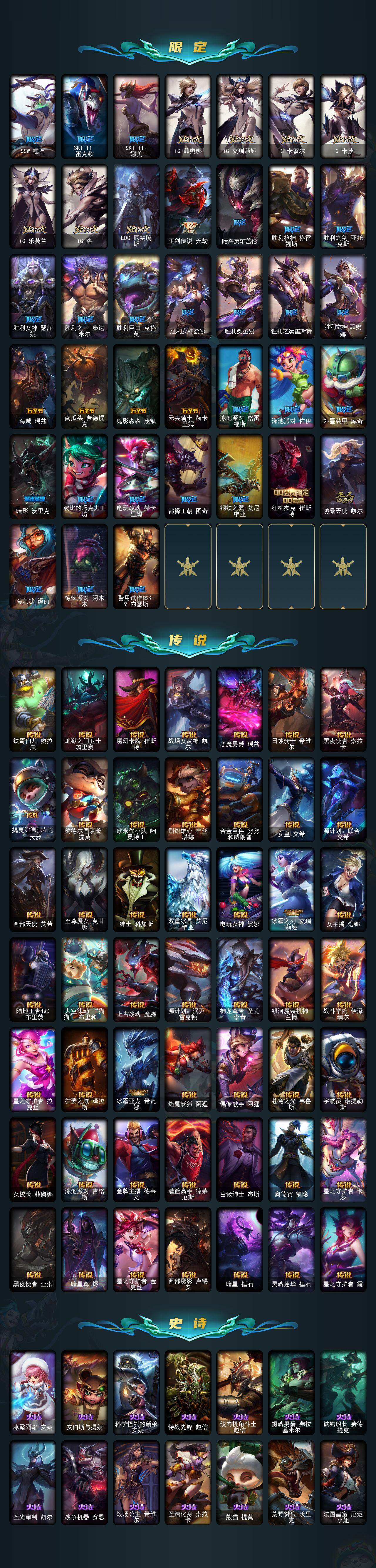 【限定皮肤】:诺斯费拉图弗拉基米尔,冠军之志瑞兹,暗杀星奥莉安娜,暗杀星努努和威朗普,SKTT1劫,SKTT1李青,SSW辛吉德,SSW锤石,SKTT1雷克顿,SKTT1娜美,iG菲奥娜,iG艾瑞莉娅,iG卡蜜尔,iG卡莎,iG乐芙兰,iG洛,EDG厄斐琉斯,玉剑传说无劫,暗裔英雄盖伦,胜利枪神格雷福斯,胜利之剑亚托克斯,胜利女神瑟庄妮,胜利之王泰达米尔,胜利巨口克格莫,胜利女神娑娜,胜利剑圣易,胜利之运崔斯特,胜利女神菲奥娜,海贼瑞兹,南