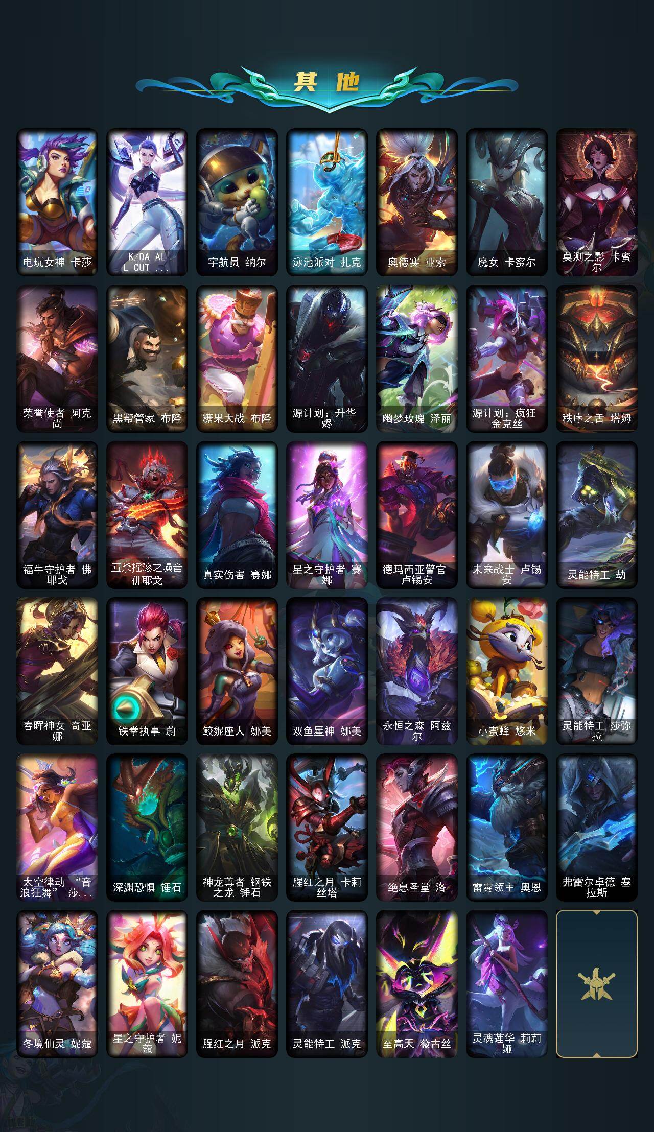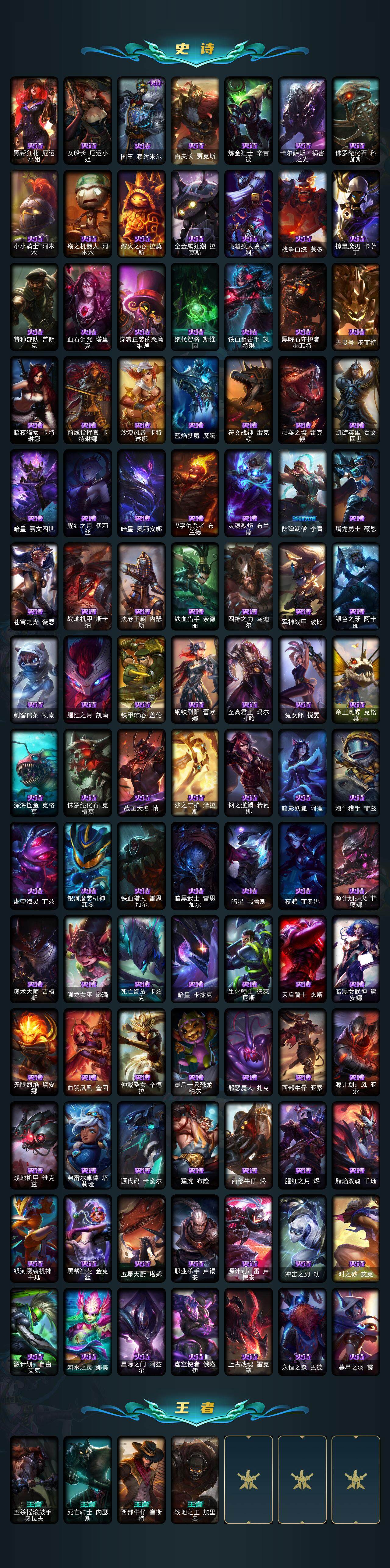 【神话皮肤】:十周年纪念安妮,源代码乐芙兰,十五周年纪念希维尔,暗星科加斯,神凰行者瑞羽圣凰艾尼维亚,黎明使者卡尔玛,海克斯科技波比,海克斯科技雷克顿,海克斯科技玛尔扎哈,海克斯科技斯维因,摄魂使者薇恩,至臻暗星墨菲特,至臻奥术师佐伊,至臻DRX亚托克斯,至臻黑夜使者凯隐,至臻剪纸仙灵希维尔,至臻烈焰美人薇恩,至臻灵魂莲华易,至臻神凰行者烈羽焰凰霞,至臻神龙尊者炎龙瑟提,至臻星之守护者艾克,至臻星之守护者辛德拉,至臻源计划阴劫,至臻战斗学院蕾欧娜