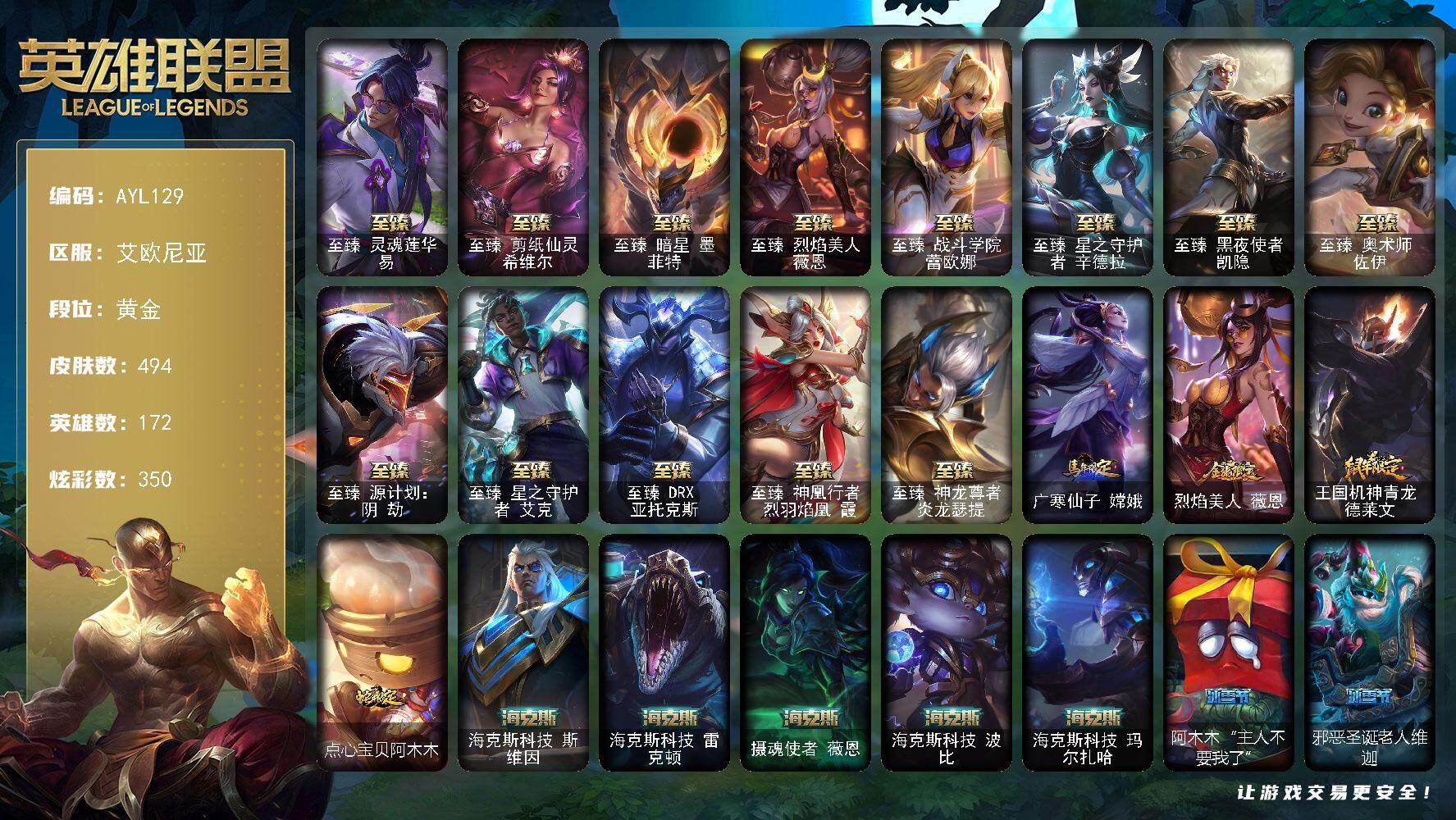 [15261334]可二次【店主推荐捡漏号!可直接换绑】 黄金段位-172英雄-494皮肤-350炫彩-1终极-24神话-61限定-49传说-112史诗 【珍稀头像】:星守阿狸头像 【热门头像】:春晖神女头像 【至臻皮肤】:至臻灵魂莲华易,至臻剪纸仙灵希维尔,至臻暗星墨菲特,至臻烈焰美人薇恩,至臻战斗学院蕾欧娜,至臻星之守护者辛德拉,至臻黑夜使者凯隐,至臻奥术师佐伊,至臻源计划阴劫,至臻星之守护者艾克,至臻DRX亚托克斯,至臻神凰行者烈羽焰凰霞,至臻神龙尊者炎龙瑟提 【臻彩皮肤】:天龙之子卡莎飞龙乘云,无畏骑士瑟庄妮赤子初心,冰霜之刃艾瑞莉娅炫金,墨之影武者亚索金墨耀影,冠军之志瑞兹凯旋圣装,神龙尊者圣龙李青龙腾云起,源计划联合艾希红莲之弓,星之守护者金克丝黑洞,魔女阿卡丽虚荣,净雪之月莫甘娜冬虹 【年限皮肤】:广寒仙子嫦娥,烈焰美人薇恩,王国机神青龙德莱文,点心宝贝阿木木 【海克斯皮肤】:海克斯科技斯维因,海克斯科技雷克顿,摄魂使者薇恩,海克斯科技波比,海克斯科技玛尔扎哈 【冰雪限定】:阿木木“主人不要我了”,邪恶圣诞老人维迦,喜庆之树茂凯,雪默丁格,圣诞玩偶波比,冰雪驯鹿波比,圣诞老人古拉加斯,圣诞驯鹿克格莫,魄罗骑士瑟庄妮,寒冬精灵璐璐,圣诞老人德莱文,冰雪节辛吉德 【终极皮肤】:大元素使拉克丝 【神话皮肤】:十周年纪念安妮,源代码乐芙兰,十五周年纪念希维尔,暗星科加斯,神凰行者瑞羽圣凰艾尼维亚,黎明使者卡尔玛,海克斯科技波比,海克斯科技雷克顿,海克斯科技玛尔扎哈,海克斯科技斯维因,摄魂使者薇恩,至臻暗星墨菲特,至臻奥术师佐伊,至臻DRX亚托克斯,至臻黑夜使者凯隐,至臻剪纸仙灵希维尔,至臻烈焰美人薇恩,至臻灵魂莲华易,至臻神凰行者烈羽焰凰霞,至臻神龙尊者炎龙瑟提,至臻星之守护者艾克,至臻星之守护者辛德拉,至臻源计划阴劫,至臻战斗学院蕾欧娜 【限定皮肤】:诺斯费拉图弗拉基米尔,冠军之志瑞兹,暗杀星奥莉安娜,暗杀星努努和威朗普,SKTT1劫,SKTT1李青,SSW辛吉德,SSW锤石,SKTT1雷克顿,SKTT1娜美,iG菲奥娜,iG艾瑞莉娅,iG卡蜜尔,iG卡莎,iG乐芙兰,iG洛,EDG厄斐琉斯,玉剑传说无劫,暗裔英雄盖伦,胜利枪神格雷福斯,胜利之剑亚托克斯,胜利女神瑟庄妮,胜利之王泰达米尔,胜利巨口克格莫,胜利女神娑娜,胜利剑圣易,胜利之运崔斯特,胜利女神菲奥娜,海贼瑞兹,南