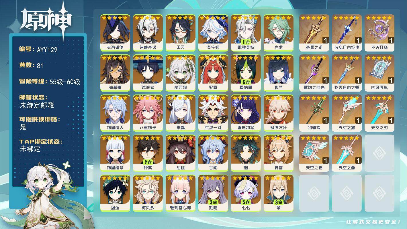[15331115]60级/81黄/女主/40个五星角色/16个五星武器 0命克洛琳德,0命阿蕾奇诺,0命闲云,0命芙宁娜,1命那维莱特,0命白术,0命迪希雅,0命流浪者,0命纳西妲,0命妮露,满命提纳里,0命夜兰,0命神里绫人,0命八重神子,0命申鹤,0命荒泷一斗,0命雷电将军,0命枫原万叶,0命神里绫华,2命钟离,0命胡桃,0命甘雨,0命魈,0命宵宫,0命温迪,0命阿贝多,0命珊瑚宫心海,3命刻晴,5命七七,3命琴,2命莫娜,2命迪卢克,0命玛拉妮,0命艾梅莉埃,0命恰斯卡,0命玛薇卡,1命梦见月瑞希,0命丝柯克,0命菈乌玛,0命杜林,精1圣显之钥,精1波乱月白经津,精1不灭月华,精1雾切之回光,精1苍古自由之誓,精1四风原典,精1和璞鸢,精1天空之翼,精1天空之刃,精1天空之卷,精1天空之傲