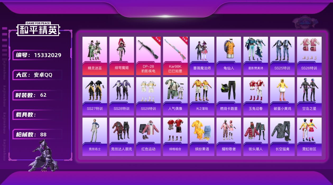 [15332029]安卓 手Q-2粉装-2特效枪-0载具-2粉色飞行器-28293热力值-10王牌印记-62套装-88枪皮