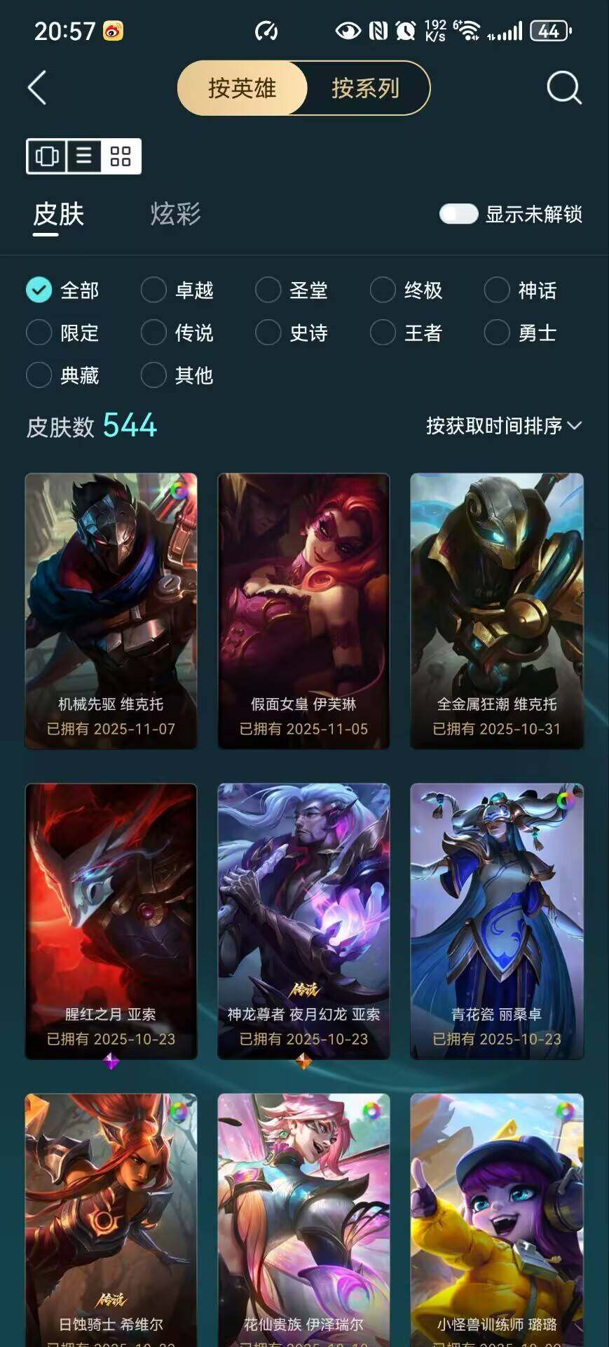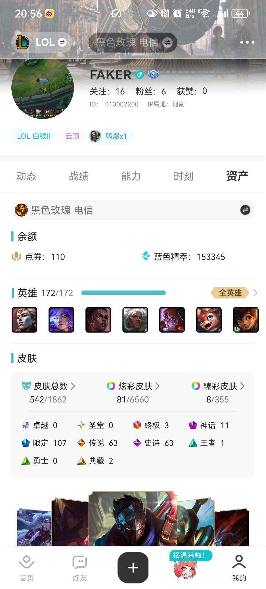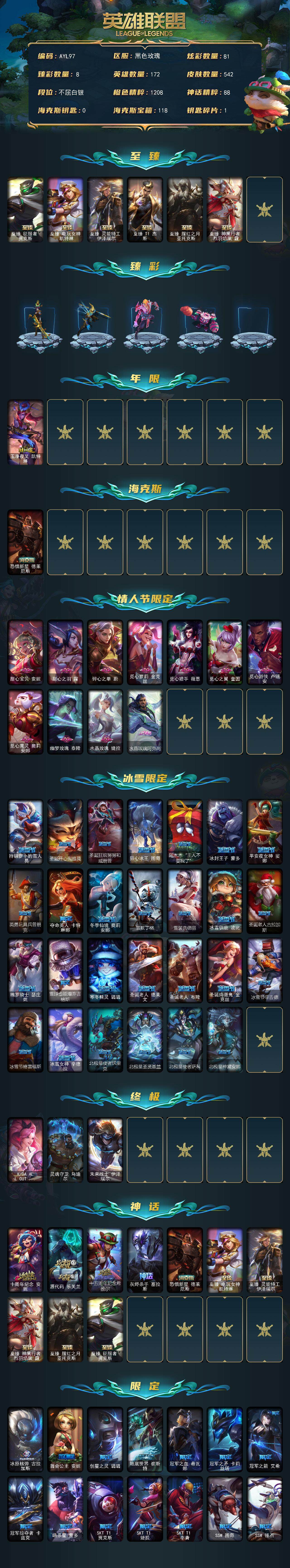 [15261974]白银段位-172英雄-542皮肤-81炫彩-5终极-11神话-107限定-63传说-63史诗