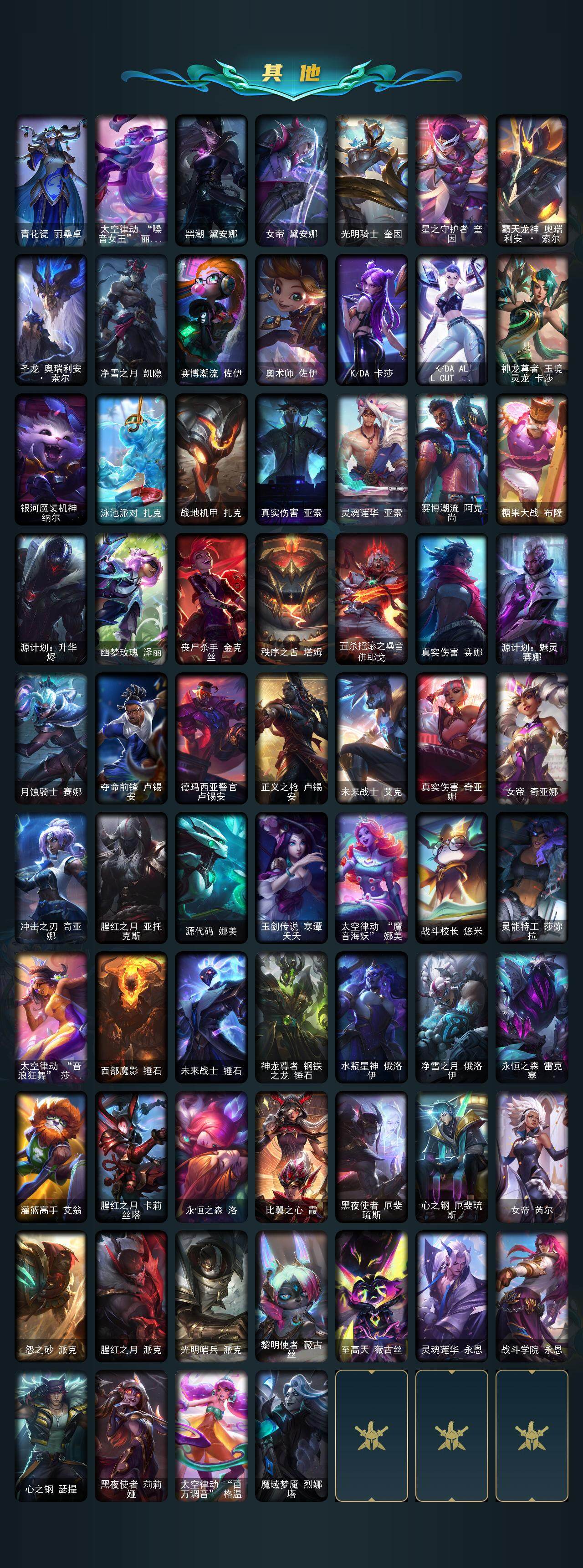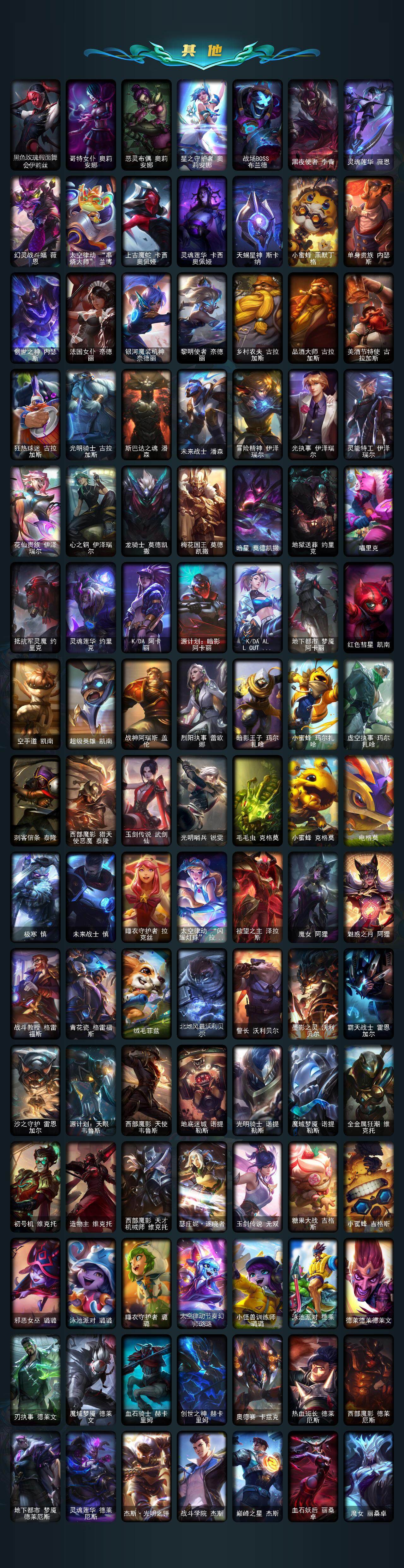 【冰雪限定】:持胡萝卜的雪人易,圣诞开心鬼提莫,圣诞狂欢努努和威朗普,狂心冰王图奇,阿木木“主人不要我了”,冰封王子蒙多,平安夜女神娑娜,英勇玩具兵普朗克,夺命美人卡特琳娜,冬季仙境奥莉安娜,雪默丁格,雪装奈德丽,冰雪驯鹿波比,圣诞老人古拉加斯,魄罗骑士瑟庄妮,雪球也能爆炸吉格斯,寒冬精灵璐璐,圣诞老人德莱文,圣诞老人布隆,圣诞捣蛋鬼金克丝,冰雪节辛吉德,冰雪节格雷福斯,冰雪女神辛德拉,北极星使者沃里克,北极星圣贤基兰,北极星使者萨科,北极星神黛安娜