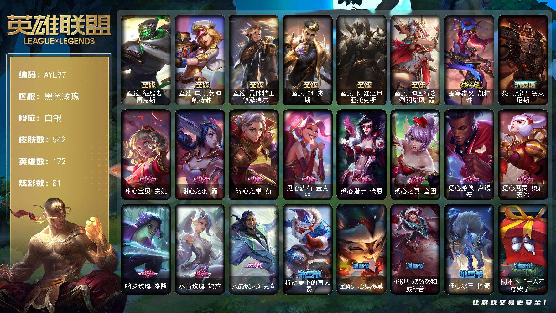[15261974]白银段位-172英雄-542皮肤-81炫彩-5终极-11神话-107限定-63传说-63史诗 【至臻皮肤】:至臻征服者贾克斯,至臻电玩女神凯特琳,至臻灵能特工伊泽瑞尔,至臻T1杰斯,至臻腥红之月亚托克斯,至臻神凰行者烈羽焰凰霞 【臻彩皮肤】:玉净夜叉凯特琳炫金神机,冠军之刃锐雯2016凯旋圣装,冠军之矛卡莉丝塔凯旋圣装,神龙尊者圣龙李青登龙,可爱可爱粉红红布里茨,星之守护者阿卡丽热情之光,红莲之刃锐雯 【年限皮肤】:玉净夜叉凯特琳 【海克斯皮肤】:恐惧新星德莱厄斯 【情人节限定】:甜心宝贝安妮,甜心之羽霞,碎心之拳蔚,觅心萝莉金克丝,觅心猎手薇恩,觅心之翼奎因,觅心游侠卢锡安,觅心魔灵奥莉安娜,幽梦玫瑰泰隆,水晶玫瑰婕拉,水晶玫瑰阿克尚 【冰雪限定】:持胡萝卜的雪人易,圣诞开心鬼提莫,圣诞狂欢努努和威朗普,狂心冰王图奇,阿木木“主人不要我了”,冰封王子蒙多,平安夜女神娑娜,英勇玩具兵普朗克,夺命美人卡特琳娜,冬季仙境奥莉安娜,雪默丁格,雪装奈德丽,冰雪驯鹿波比,圣诞老人古拉加斯,魄罗骑士瑟庄妮,雪球也能爆炸吉格斯,寒冬精灵璐璐,圣诞老人德莱文,圣诞老人布隆,圣诞捣蛋鬼金克丝,冰雪节辛吉德,冰雪节格雷福斯,冰雪女神辛德拉,北极星使者沃里克,北极星圣贤基兰,北极星使者萨科,北极星神黛安娜 【终极皮肤】:KDAALLOUT萨勒芬妮独立音乐人,灵魂守卫乌迪尔,未来战士伊泽瑞尔 【神话皮肤】:十周年纪念安妮,源代码乐芙兰,十五周年纪念希维尔,灰烬杀手塞拉斯,恐惧新星德莱厄斯,至臻征服者贾克斯,至臻电玩女神凯特琳,至臻灵能特工伊泽瑞尔,至臻神凰行者烈羽焰凰霞,至臻腥红之月亚托克斯 【限定皮肤】:冰原核弹古拉加斯,舞会公主安妮,创星之灵璐璐,地底世界崔斯特,冠军之血希瓦娜,冠军之矛卡莉丝塔,冠军之箭艾希,冠军掠夺者卡兹克,暗杀星蒙多,SKTT1贾克斯,SKTT1婕拉,SKTT1李青,SSW图奇,SSW锤石,SKTT1阿利斯塔,SKTT1艾克,SKTT1扎克,SSG塔莉垭,SSG洛,SSG霞,iG卡莎,FPX薇恩,FPX锤石,EDG格雷福斯,暗裔英雄盖伦,胜利枪神格雷福斯,胜利枪神卢锡安,胜利巨口克格莫,胜利女神娑娜,胜利剑圣易,胜利之运崔斯特,胜利女神菲奥娜,南瓜头费德提克,鬼影重重魔腾,鬼影森森茂凯,无头骑士赫卡里姆,克烈古拉伯爵,不给糖就捣蛋艾克,魅惑女巫乐芙兰,魅惑女巫崔