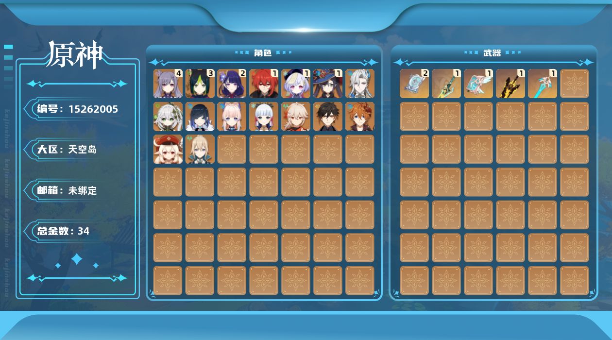 0命那维莱特,0命纳西妲,3命提纳里,0命夜兰,2命雷电将军,0命枫原万叶,0命神里绫华,0命钟离,0命可莉,0命达达利亚,0命珊瑚宫心海,4命刻晴,1命七七,0命琴,1命莫娜,1命迪卢克,精1无工之剑,精2四风原典,精1天空之刃,精1天空之卷,精1山王长牙