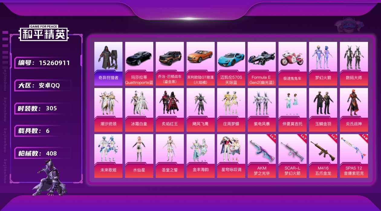 [15260911]可二次【店主推荐捡漏号!可直接换绑】素材身法号 安卓 手Q-16粉装-13特效枪-6载具-4粉色飞行器-13.4w热力值-19王牌印记-305套装-408枪皮【热门品类】:粉装-梦幻火箭,套装-浪漫天命,套装-小丑鱼,套装-奇异狩猎者,套装-龟仙人,套装-暗影哥特,套装-粉红小猪,套装-摄影小熊猫,套装-红红火火,角色-8号机,角色-Mark.06,小恶魔头饰【粉色载具】:玛莎拉蒂Quattroporte(夜幕蓝),乔治巴顿战车(鎏金黑),宾利欧陆GT敞篷(火焰橘),迈凯伦570S(天际蓝),Formula E Gen2(幽光蓝),极速兔兔车【粉色套装】:粉装-数码大师,粉装-梦幻火箭,粉装-潮汐统领,粉装-冰霜白皇,粉装-炙焰红王,粉装-飓风飞鹰,粉装-庄周梦蝶,粉装-紫电风暴,粉装-仲夏莫吉托,粉装-玉鳞金羽,粉装-炎氏战神,粉装-未来歌姬,角色-水仙星,角色-圣堂之誓,粉装-金丰海韵,粉装-星穹咏叹调【粉色枪皮等级】:AKM-梦之光华(七级),SCAR-L-梦幻火箭(七级),M416-五爪金龙(七级),M416-电玩时刻(五级),GROZA-镜光银凌(五级),AUG-超新星(五级),M762-青锋波束(五级),UMP45-量子极限(五级),Kar98K-未来歌姬(五级),Kar98K-巳巳如意(五级),M417-第五大道(四级),SPAS-12-音爆索尼克(六级),DP-28-豹影疾电(五级)【粉色飞行器】:梦之光华飞行器,天之羽翼飞行器,粉樱探戈飞行器
