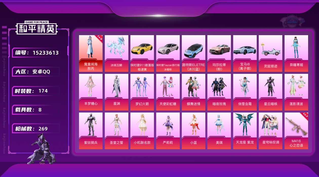 [15233613]【店主推荐捡漏号!可直接换绑】/素材身法号 安卓 手Q-1神装-18粉装-14特效枪-8载具-7粉色飞行器-10.3w热力值-11王牌印记-174套装-269枪皮【红色神装等级】:魔童闹海-敖丙(三级)【热门品类】:粉装-梦幻火箭,套装-浪漫天命,套装-AG战队服,套装-龟仙人,套装-浪漫波比【粉色套装】:粉装-天使彩虹糖,粉装-蝶舞迷情,粉装-梦幻火箭,粉装-暗夜玫瑰,粉装-俏雪含霜,角色-星云暗核,粉装-莲影清波,角色-紫钛骑兵,角色-圣堂之誓,角色-小叽联名款,角色-严莉莉,角色-小蓝,角色-美琪,角色-天龙座 紫龙,粉装-星穹咏叹调,角色-星渊,角色-羊梦糖心,角色-异瞳寒姬【粉色枪皮等级】:AKM-甜心宝贝(五级),SCAR-L-青春物语(四级),SCAR-L-纯梦嫁纱(一级),M416-心之恋语(七级),蜜獾-异瞳寒姬(四级),P90-魔童闹海 敖丙(三级),Kar98K-巳巳如意(五级),AWM-天使羽翼(五级),Mk14-甜梦熊击(五级),DP-28-暗夜鎏金(一级),DP-28-圣堂之誓(四级),DP-28-豹影疾电(五级),MG3-洛神天依(五级),MG-36-沧焰双生(五级)【粉色载具】:路特斯ELETRE(冰川蓝),玛莎拉蒂Ghibli(粉),宝马i8(离子银),保时捷911 敞篷版(极速黄),保时捷Taycan 旅行版(冰莓粉),灵鼠银迹,僚机-冰龙团团,冰绡玉鳞【粉色飞行器】:齐天大圣飞行器,超新星飞行器,镜光幻境飞行翼,镜域双华-灵镜之阶,幻星舰长飞行器,灵珠游龙飞行器