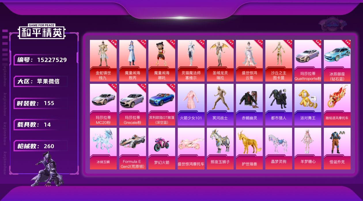 [15227529]素材身法号/玛莎拉蒂Quattroporte(幻星粉)(六级)/金蛇镇世-烛九(四级)/老101/老木乃伊/绝世印记5/扭蛋碎片520/璀璨碎片537/SCAR-L-魔童闹海 哪吒(九级)/M416-墨龙九天(九级) 苹果 微信-7神装-30粉装-39特效枪-14载具-21粉色飞行器-14.6w热力值-8王牌印记-155套装-260枪皮【红色载具】:玛莎拉蒂MC20(幻星粉)(一级),玛莎拉蒂Quattroporte(幻星粉)(六级),玛莎拉蒂Grecale(幻星粉)(一级),宾利欧陆GT敞篷(深空蓝)(一级),冰辰御座(钻石蓝)(一级)【红色神装等级】:魔童闹海-敖丙(一级),魔童闹海-哪吒(一级),灵猫魔法师-塞维尔(一级),圣域龙灵-瑞拉(一级),金蛇镇世-烛九(四级),盛世惊鸿-云鸾(一级),沙丘之主-图卡盟(一级)【热门品类】:粉装-怪诞乔克,粉装-梦幻火箭,粉装-缤纷油彩,套装-浪漫天命,套装-赤蝎幽灵,套装-火箭少女101,套装-都市猎人,套装-冥河战士,套装-派对舞王,套装-小丑鱼,角色-2P战斗服款,角色-忠猛周仓,套装-龟仙人,套装-暗影哥特,套装-浪漫波比,套装-萌熊伴侣,撬棍-龙胆亮银枪【粉色套装】:粉装-数码大师,粉装-怪诞乔克,粉装-甜心巧克力,粉装-宝贝奶油派,粉装-天使彩虹糖,粉装-梦幻火箭,粉装-缤纷油彩,粉装-放客神游,粉装-新星烈龙,粉装-彩虹鹿灵,角色-洛天依,角色-初号机款机体服,粉装-赤焰黑爵,粉装-紫电风暴,粉装-霁雪冰心,粉装-冰川红玫,粉装-第五大道,超级赛亚人-孙悟空,角色-白勺歌姬,角色-呆萌星弥,角色-小可学妹,粉装-萌物绒绒,角色-圣堂之誓,粉装-蜜语绒猫,角色-烟云彩露,角色-月下星之子,角色-智耀战神,角色-罗征,角色-奇迹舞步 美雪,角色-羊梦糖心【粉色枪皮等级】:AKM-甜心宝贝(六级),M16A4-晶梦幻蝶(一级),SCAR-L-梦幻火箭(一级),SCAR-L-金蛇镇世(一级),SCAR-L-魔童闹海 哪吒(九级),M416-五爪金龙(一级),M416-风花雪月(一级),M416-至情至圣(一级),M416-超新星(一级),M416-墨龙九天(九级),M416-女娲灵识(一级),M416-灵猫魔法师(一级),GROZA-超新星(一级),AUG-超新星(一级),M762-冷魅冰骑(七级),Famas