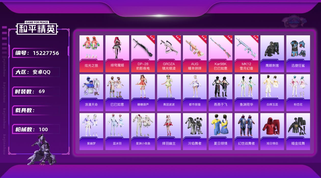 [15227756]安卓 手Q-2粉装-5特效枪-0载具-1粉色飞行器-25299热力值-2王牌印记-69套装-100枪皮 【热门品类】:套装-浪漫天命 【粉色套装】:粉装-炫光之旅,角色-绯穹魔姬 【粉色枪皮等级】:GROZA-镜光银凌(五级),AUG-暖羊咩咩(五级),Kar98K-巳巳如意(五级),MK12-雪月幻音(五级),DP-28-豹影疾电(五级) 【粉色枪皮】:GROZA-镜光银凌,AUG-暖羊咩咩,Kar98K-巳巳如意,MK12-雪月幻音,DP-28-豹影疾电 【粉色降落伞】:雪月幻音降落伞,异瞳寒姬降落伞 【稀有套装】:套装-巳巳如意,套装-雪国风尚,套装-糖糖葫芦,套装-青团波波,角色-都市丽猫,套装-燕燕于飞,套装-鱼渊荷华,套装-白辉玉蕊,套装-粉恋花,套装-紫幽梦,套装-蓝冰羽,套装-星渊小夜曲,角色-绛羽幽主,套装-炫彩糖果 【稀有枪皮】:AKM-破晓战魂,SCAR-L-夜灯,G36C-星穹咏叹调,AC-VAL-六号稻草人,UMP45-夜灯,UMP45-蓝色火焰,UMP45-极意拳锋,Vector-生命誓言,汤姆逊-炫彩节奏,AKS-74U-极光猎影,P90-巳巳如意,Kar98K-星穹咏叹调,M24-幻彩电音,M24-蓝晶绮麟,Mini14-耀粉歌者,Mk14-治愈之星,AMR-喜羊羊与灰太狼,S686-巳巳如意,S686-千金淑猫,S12K-夜灯,S12K-智耀战神,DBS-月影灵韵,M249-破晓战魂,DP-28-彩虹符号,P1911-动力核心,R1895-棋盘冕主,短管霰弹-星穹咏叹调,爆炸猎弓-喜羊羊与灰太狼,大砍刀-脆鲨七海,大砍刀-鬼刀,撬棍-冷漠罗丽,破片手榴弹-巳巳如意 【其他套装】:套装-冷焰舞者,套装-夏日倾情,套装-幻世战舞者,套装-旭日情侣,套装-暗金炫舞,套装-森林游猎者,套装-浪漫天命,套装-海岛探路者,套装-滨海厨神,套装-猎鹰,套装-猛禽,套装-王牌教练,套装-白色伏地魔,套装-破晓战魂,套装-竞技名士,套装-竞技达人朋克,套装-红色运动,套装-耀粉歌者,套装-街头潮人,套装-长空猛禽,套装-青年教官,套装-魅力单车,套装-黄色伏地魔,套装-黄色运动,套装-黑色伏地魔,套装-鹰眼刺客,套装-迅捷狂鲨,套装-冰川特警,套装-雪兔飞飞 【营地ID】:988752302