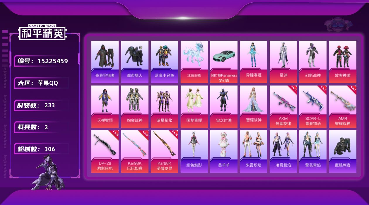 [15225459]【店主推荐捡漏号!可直接换绑】/素材身法号/地铁满天赋 苹果 手Q-11粉装-6特效枪-2载具-8粉色飞行器-10w热力值-17王牌印记-233套装-306枪皮【热门品类】:套装-浪漫天命,套装-都市猎人,套装-深海小丑鱼,套装-奇异狩猎者,套装-金羽特工,套装-龟仙人,套装-暗影哥特,角色-Mark.06,熔岩游骑兵连帽夹克【粉色套装】:粉装-幻影战神,粉装-放客神游,粉装-天禅智恒,粉装-绚金战神,粉装-暗星紫秘,粉装-闲梦青缨,角色-宙之时溯,角色-智耀战神,角色-星渊,角色-异瞳寒姬【粉色枪皮等级】:AKM-炫紫旋律(七级),SCAR-L-青春物语(七级),Kar98K-巳巳如意(五级),Kar98K-圣域龙灵(三级),AMR-智耀战神(七级),DP-28-豹影疾电(五级)【粉色载具】:保时捷Panamera(梦幻青),冰绡玉鳞【粉色飞行器】:天之羽翼飞行器,镜光幻境飞行翼,初号机 觉醒Ver.飞行器,圣域金龙飞行器,绯果甜心飞行器,飞天猪飞行器,灵珠游龙飞行器