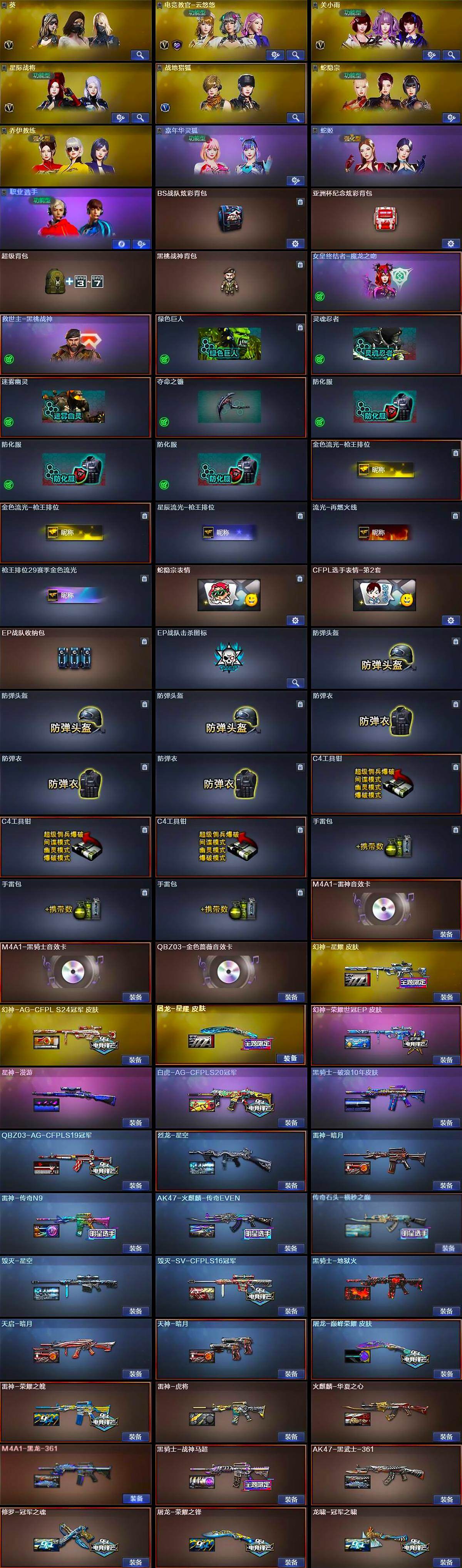 【皮肤】:幻神-星耀 皮肤,幻神-AG-CFPL S24冠军 皮肤,幻神-荣耀世冠EP 皮肤,幻神-电竞之星 皮肤,白虎-AG-CFPLS20冠军,QBZ03-AG-CFPLS19冠军,星神-漫游,烈龙-星空,雷神-暗月,雷神-荣耀之魄,雷神-虎将,雷神-传奇N9,火麒麟-华夏之心,AK47-火麒麟-传奇EVEN,传奇石头-横秒之巅,毁灭-星空,毁灭-SV-CFPLS16冠军,M4A1-黑龙-361,黑骑士-地狱火,黑骑士-战神马超,黑骑士-破浪10年皮肤,AK47-黑武士-361,天启-暗月,修罗-冠军之魂,天神-暗月,屠龙-荣耀之锋,屠龙-星耀 皮肤,屠龙-巅峰荣耀 皮肤,龙啸-冠军之啸