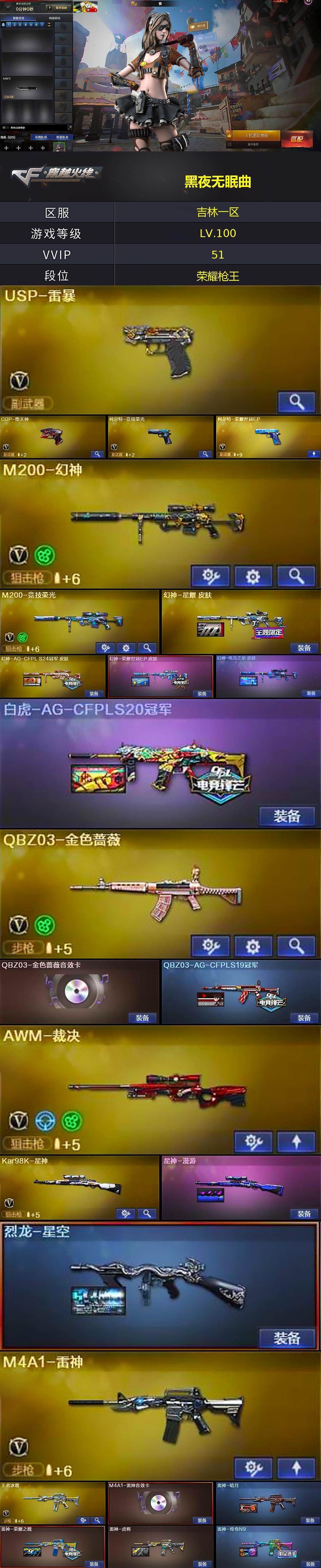 [15247230]吉林一区-50V-6王者-0炫金 【热门武器】:QBZ03-金色蔷薇,M200-幻神,M200-竞技荣光,Kar98K-星神,M4A1-黑骑士,加特林-炼狱,羊驼玩偶,毁灭-孙三炮,USP-雷暴,COP-堕天神,沙鹰-修罗 【王者炫金武器】:王者星光 【音效卡】:M4A1-雷神音效卡,M4A1-黑骑士音效卡 【皮肤】:幻神-星耀 皮肤,幻神-AG-CFPL S24冠军 皮肤,幻神-荣耀世冠EP 皮肤,幻神-电竞之星 皮肤,白虎-AG-CFPLS20冠军,QBZ03-AG-CFPLS19冠军,星神-漫游,烈龙-星空,雷神-暗月,雷神-荣耀之魄,雷神-虎将,雷神-传奇N9,火麒麟-华夏之心,AK47-火麒麟-传奇EVEN,传奇石头-横秒之巅,毁灭-星空,毁灭-SV-CFPLS16冠军,M4A1-黑龙-361,黑骑士-地狱火,黑骑士-战神马超,黑骑士-破浪10年皮肤,AK47-黑武士-361,天启-暗月,修罗-冠军之魂,天神-暗月,屠龙-荣耀之锋,屠龙-星耀 皮肤,屠龙-巅峰荣耀 皮肤,龙啸-冠军之啸 【角色】:葵,电竞教官-云悠悠,关小雨,星际战将,战地猎狐,蛇隐宗,乔伊教练,嘉年华灵狐,蛇姬,职业选手 【人偶武器】:毁灭-孙三炮,COP-旗袍,迷你深渊冰龙-王绿豆,灵狐娃娃手雷 【暴走生化】:黑龙吞噬者 【英雄级武器】:AK47-火麒麟*2,M4A1-黑龙,M4A1-雷神,M4A1-黑骑士,M4A1-死神*2,AK47-黑武士,AK12-天启,AN94-超新星,QBZ03-金色蔷薇,王者冰魄-觉醒版,Barrett-毁灭,AWM-裁决,M200-幻神,Kar98K-星神,M200-竞技荣光,王者之怒-觉醒版,加特林-炼狱,沙鹰-修罗,沙鹰-天神,USP-雷暴,COP-堕天神,柯尔特-竞技荣光,柯尔特-荣耀世冠EP,王者之魂-觉醒版,屠龙*2,龙啸,擎天,麒麟刺*2,擎天-竞技荣光*2,王者之锋-觉醒版,王者之击-觉醒版,高爆手雷-雷霆,高爆手雷-竞技荣光,闪光弹-雷霆,闪光弹-竞技荣光,烟雾弹-雷霆,烟雾弹-竞技荣光,烟雾弹-古蛇迷踪,烟雾弹-荣耀世冠EP*4,M4A1-赤狱骑士 【道具】:BS战队炫彩背包,亚洲杯纪念炫彩背包,超级背包,黑桃战神背包,女皇终结者-魔龙之吻,救世主-黑桃战神,绿色巨人,灵魂忍者,迷雾幽灵,夺命之镰,防化服*3,金色流光-枪王排位*2,