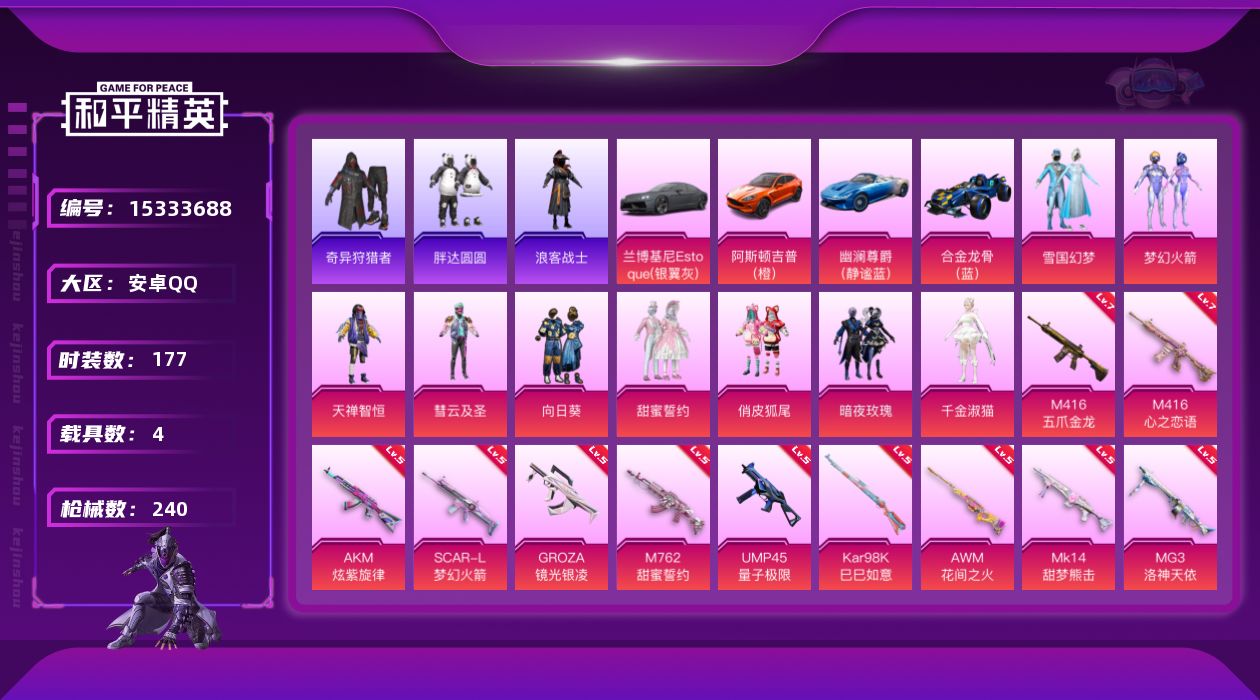 [15333688]【店主推荐捡漏号!可直接换绑】安卓 手Q-无敌战神框-9粉装-14特效枪-4载具-3粉色飞行器-86790热力值-17王牌印记-177套装-240枪皮【热门品类】:粉装-雪国幻梦,粉装-梦幻火箭,套装-奇异狩猎者,套装-胖达圆圆,套装-浪客战士,套装-粉红小猪【粉色套装】:粉装-雪国幻梦,粉装-梦幻火箭,粉装-天禅智恒,粉装-彗云及圣,粉装-向日葵,粉装-甜蜜誓约,粉装-俏皮狐尾,粉装-暗夜玫瑰,角色-千金淑猫【粉色枪皮等级】:AKM-炫紫旋律(五级),SCAR-L-梦幻火箭(五级),M416-五爪金龙(七级),M416-心之恋语(七级),M416-电玩时刻(四级),GROZA-镜光银凌(五级),M762-甜蜜誓约(五级),M762-激战未来(一级),UMP45-量子极限(五级),Kar98K-伏魔团(四级),Kar98K-巳巳如意(五级),AWM-花间之火(五级),Mk14-甜梦熊击(五级),MG3-洛神天依(五级)【粉色载具】:兰博基尼Estoque(银翼灰),阿斯顿马丁DBX(橙),幽澜尊爵(静谧蓝),合金龙骨(蓝)【粉色枪皮】:AKM-炫紫旋律,SCAR-L-梦幻火箭,M416-五爪金龙,M416-心之恋语,M416-电玩时刻,GROZA-镜光银凌,M762-甜蜜誓约,M762-激战未来,UMP45-量子极限,Kar98K-伏魔团,Kar98K-巳巳如意,AWM-花间之火,Mk14-甜梦熊击,MG3-洛神天依【粉色飞行器】:梦幻火箭飞行器,炫紫旋律飞行器,齐天大圣飞行器