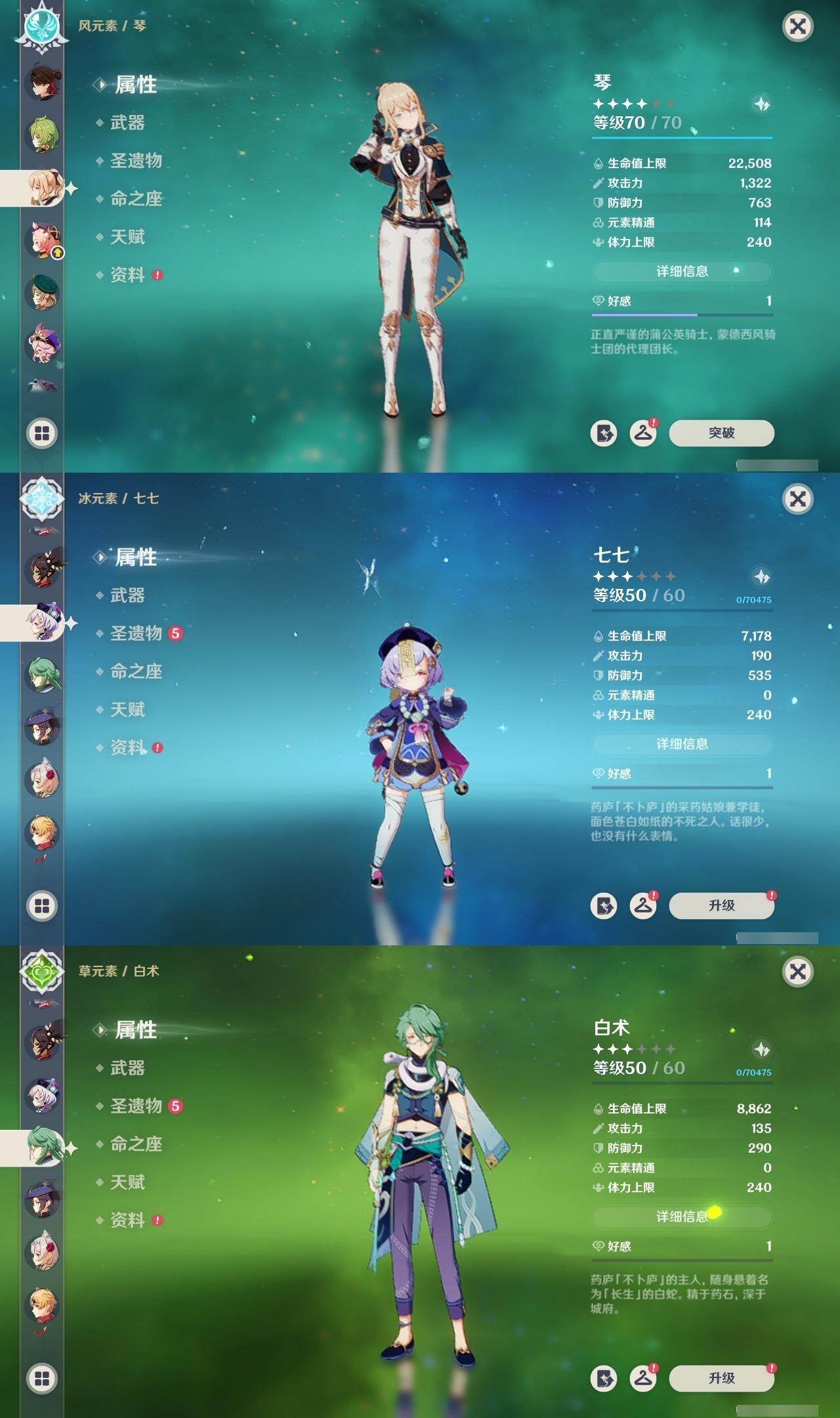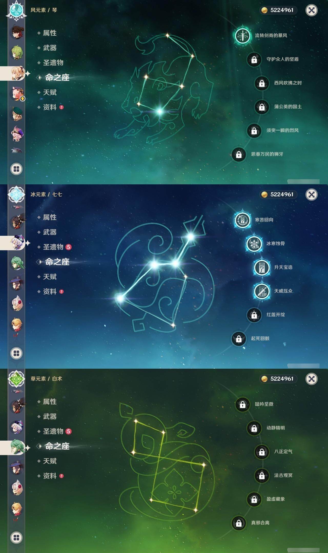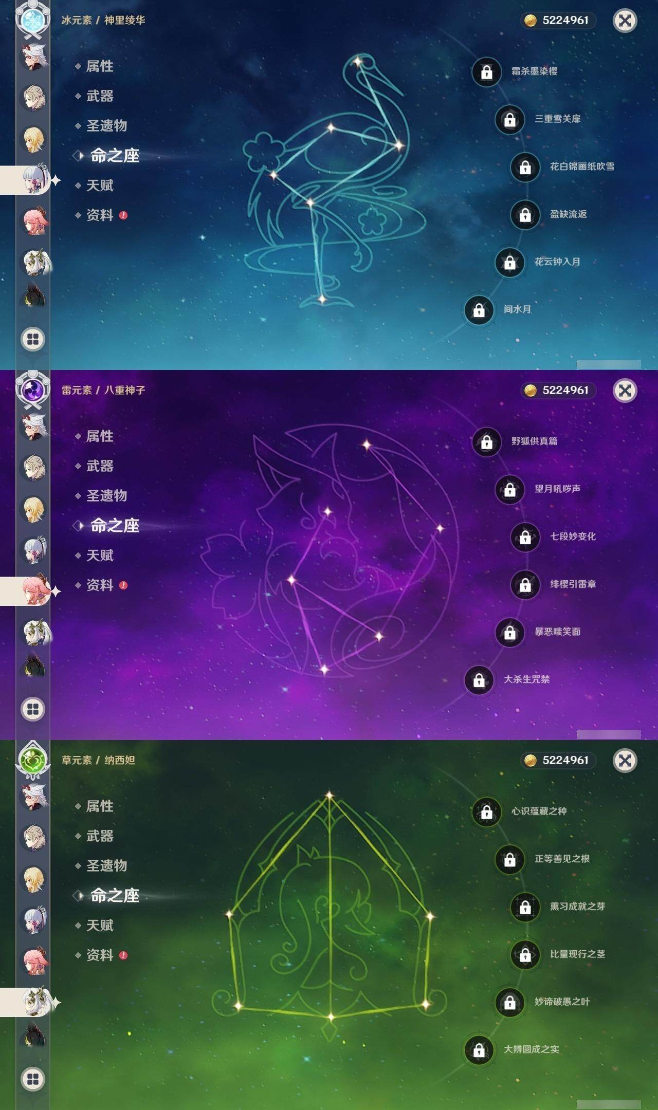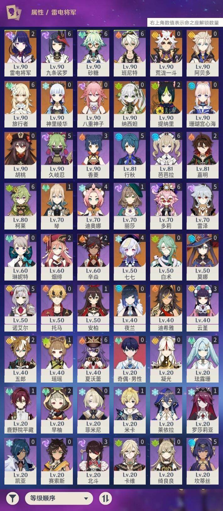 0命白术,0命迪希雅,0命纳西妲,2命提纳里,0命夜兰,0命八重神子,0命荒泷一斗,2命雷电将军,0命神里绫华,0命胡桃,0命阿贝多,0命珊瑚宫心海,4命七七,1命琴,0命莫娜,精1有乐御簾切,精1裁叶萃光,精1薙草之稻光,精1四风原典,精1和璞鸢,精1天空之翼,精1天空之卷,精1天空之傲